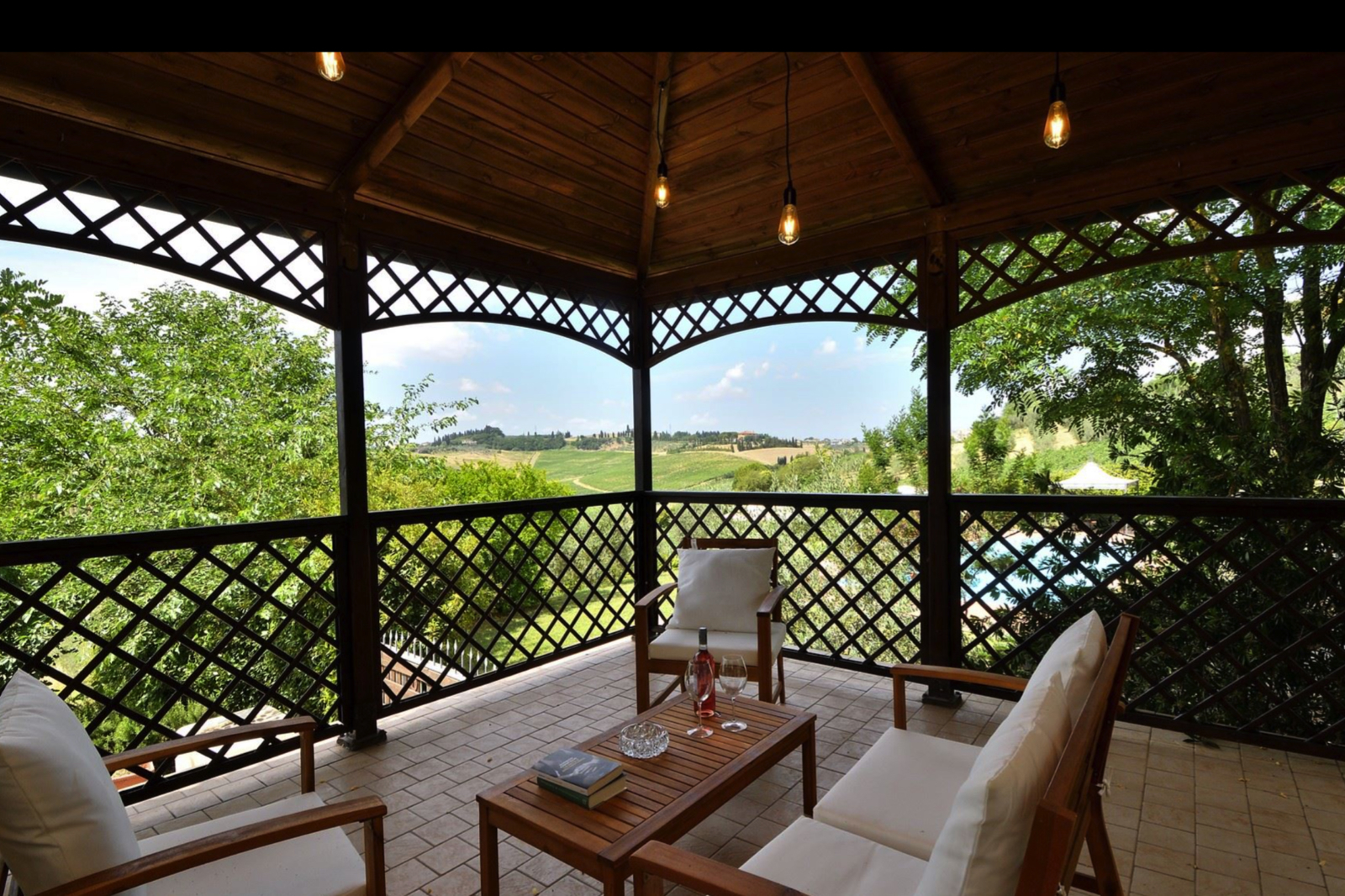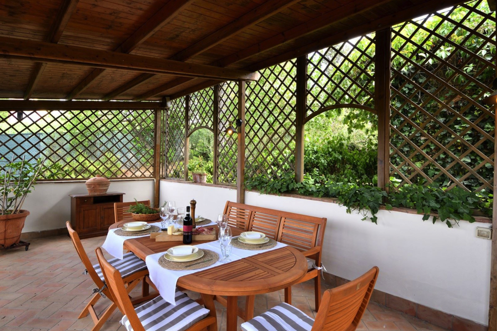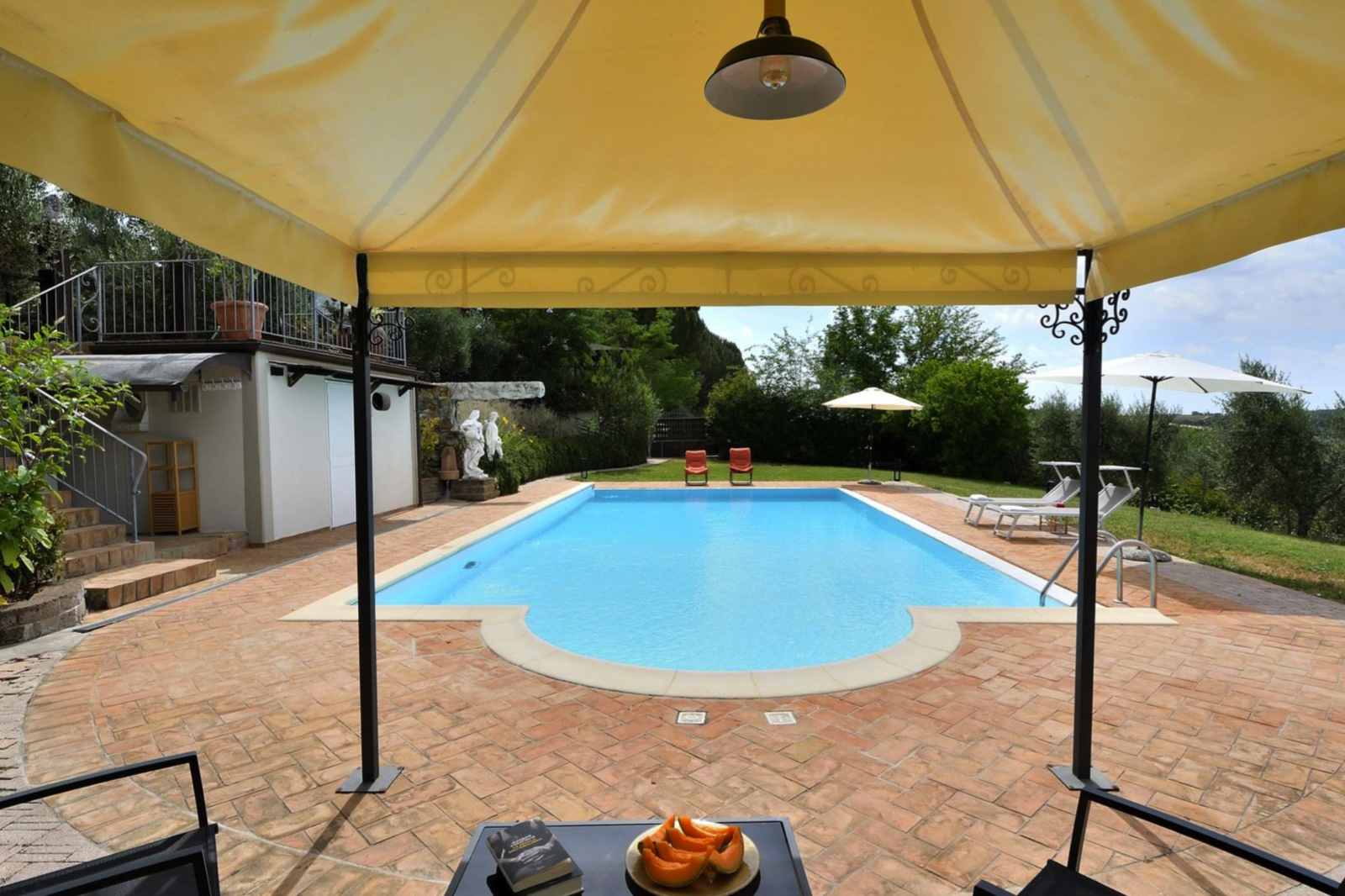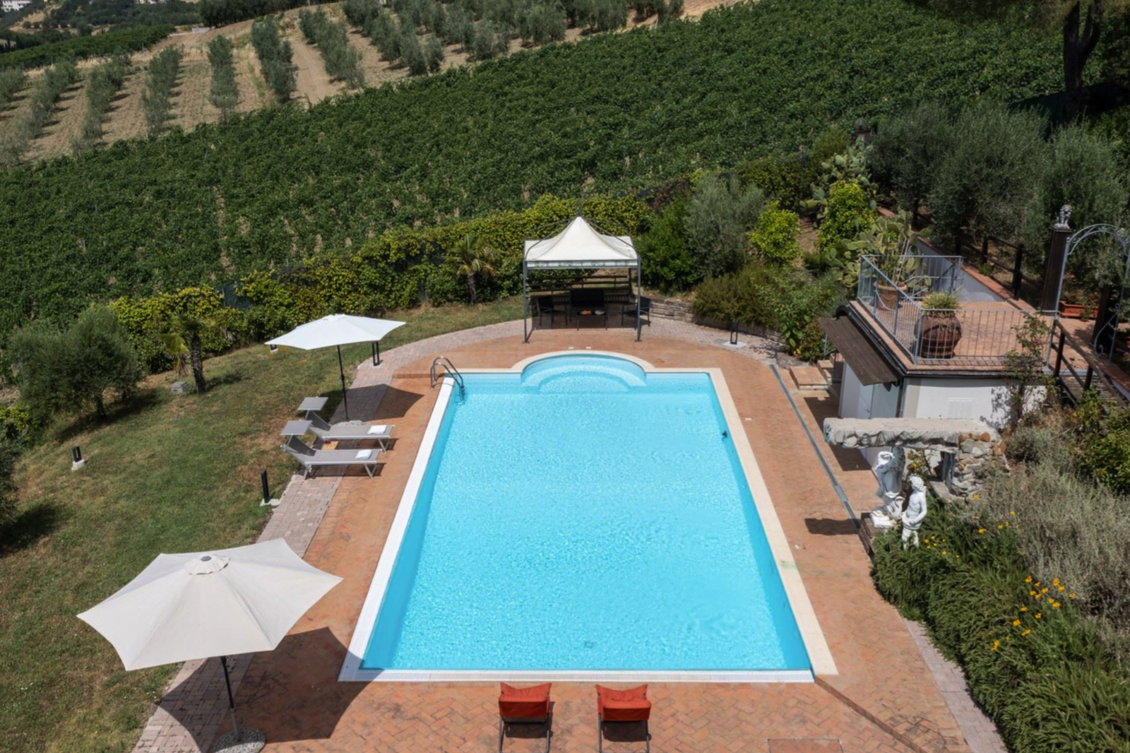 Strategically placed at various points in the garden are two panoramic pergolas, one with a wood-burning oven and barbecue, a small annex used for laundry and others for storing garden tools.