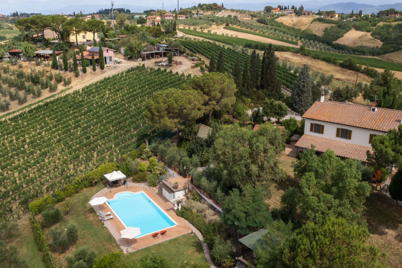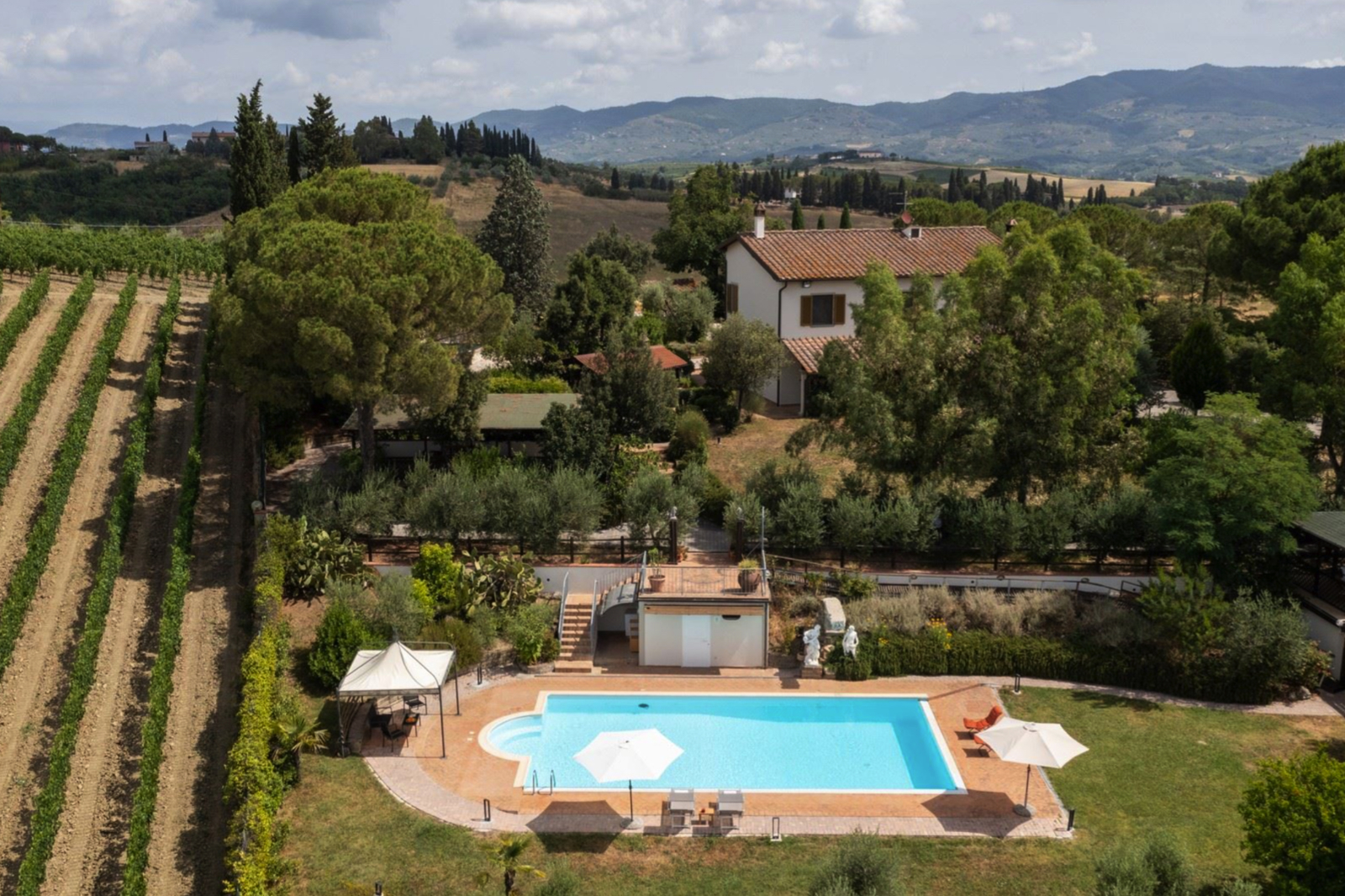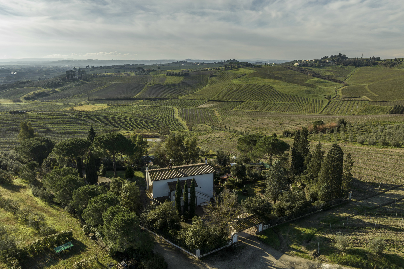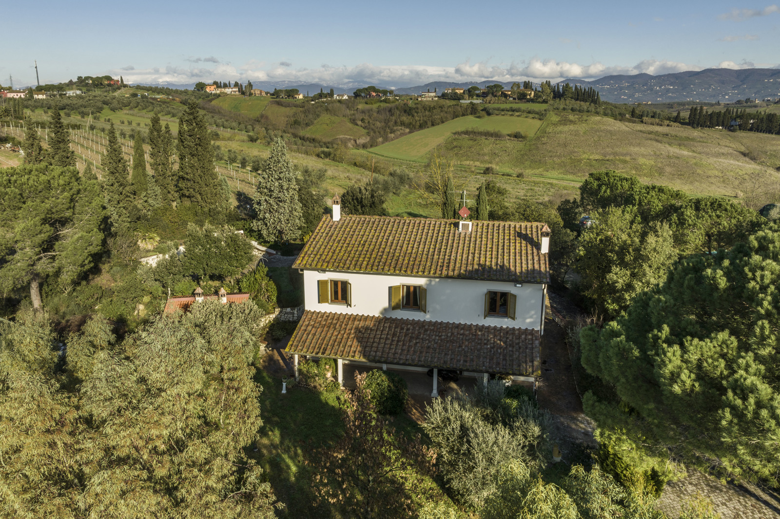 Delightful country house surrounded by private garden and accompanied by large land with olive grove, private pond and swimming pool. Located a short distance from Leonardo’s hometown, it sits on a rise overlooking the surrounding landscape covered in vineyards.