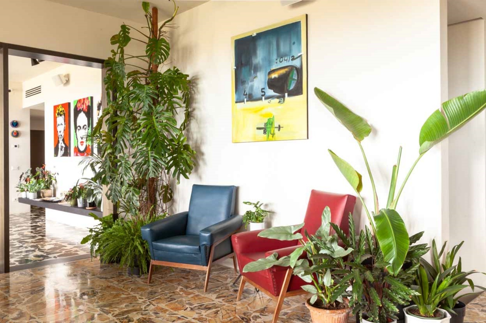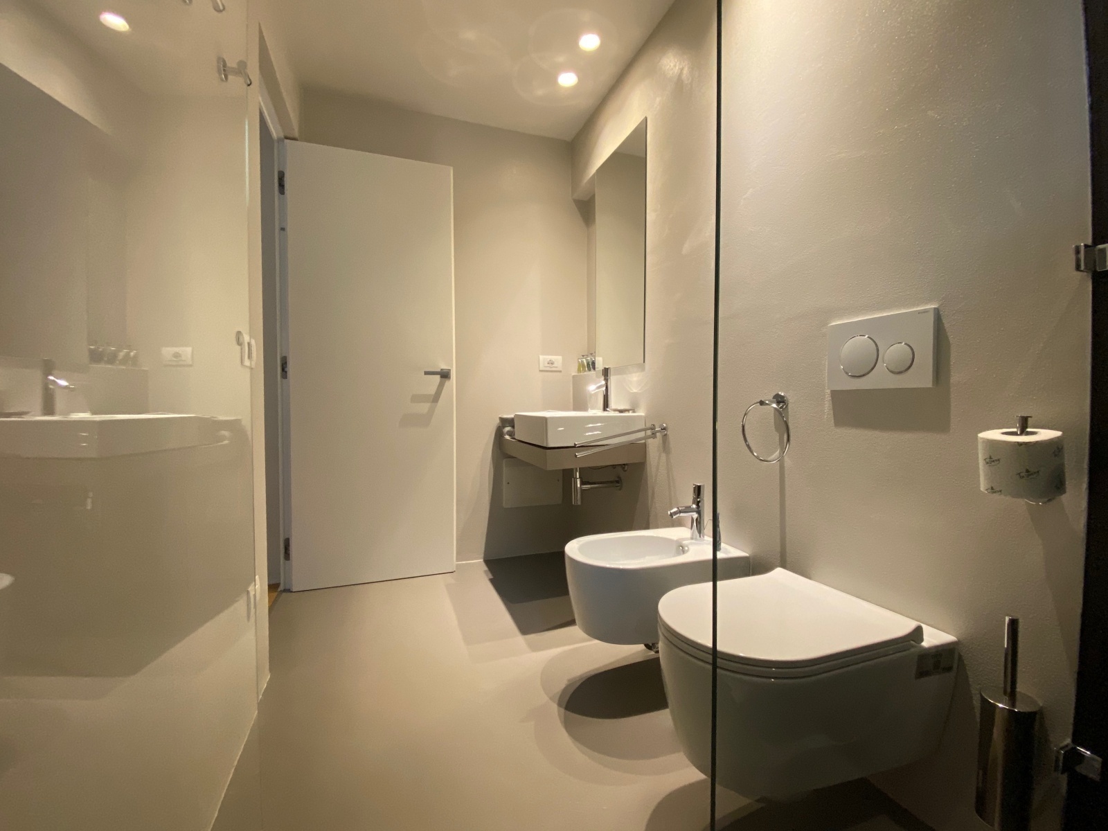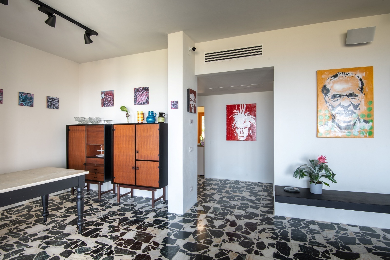 In the living area the floors are of wonderful original terrazzo from the 60s. In the sleeping area there are warm wood floors while in the bathrooms, modern particularly elegant finishes have been chosen.