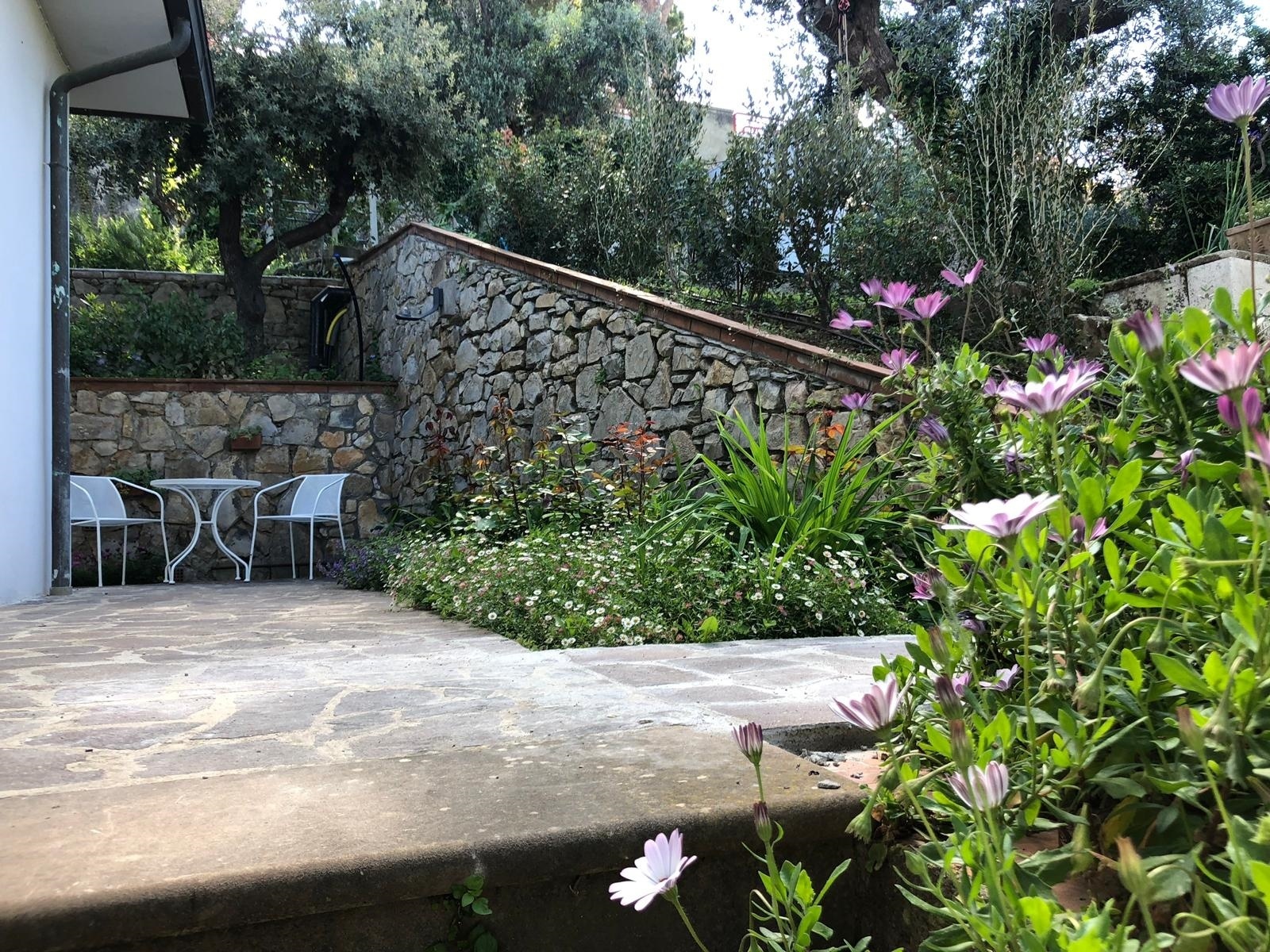 The villa is surrounded by the private garden of about 300 square meters perfectly maintained and automatically irrigated. Fruit trees, lemon and orange trees frame this particular and unique villa. The covered terraces all have sea views, some exclusive of the living area, others are intended for relaxing moments in the ‘common area’. The outdoor space has been equipped with tables and deck chairs. The double garage can comfortably accommodate two cars, today it is used for storage. Six cars can be parked in the outdoor courtyard.