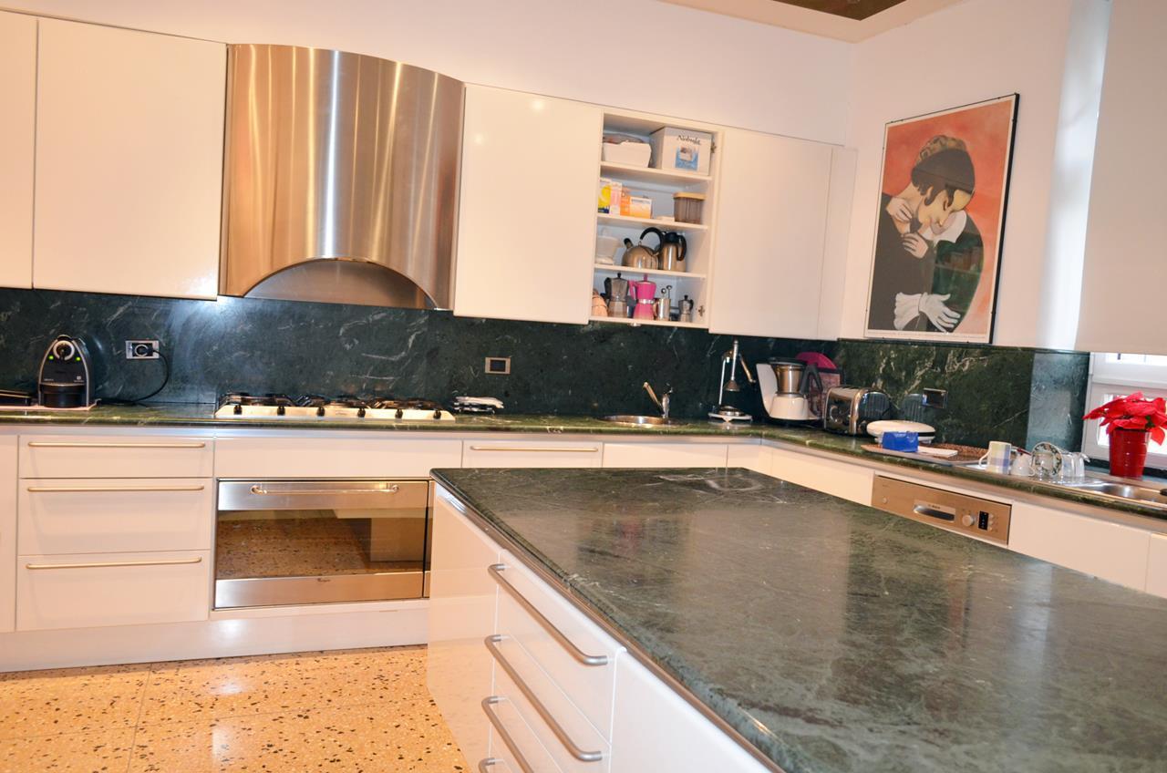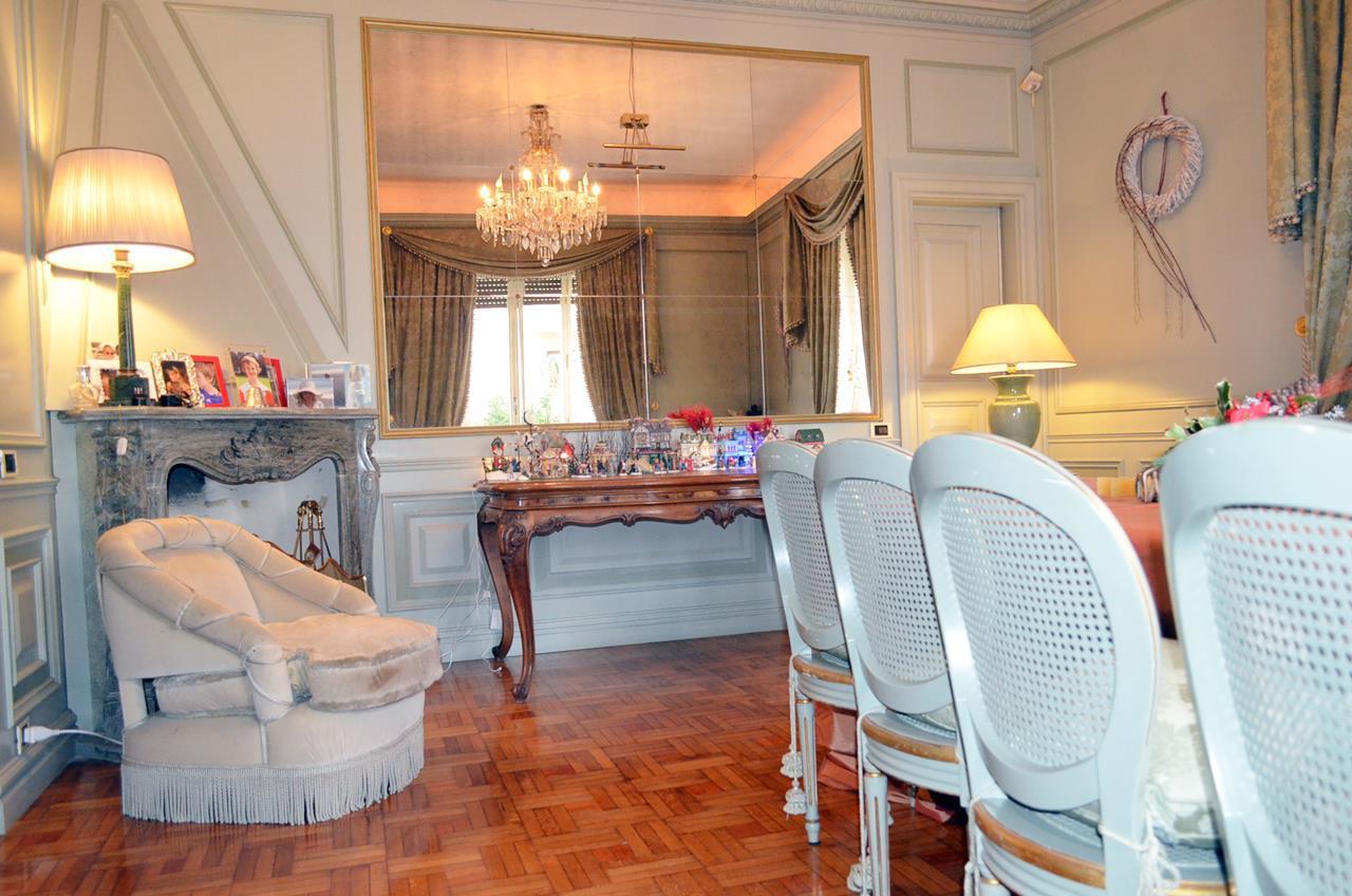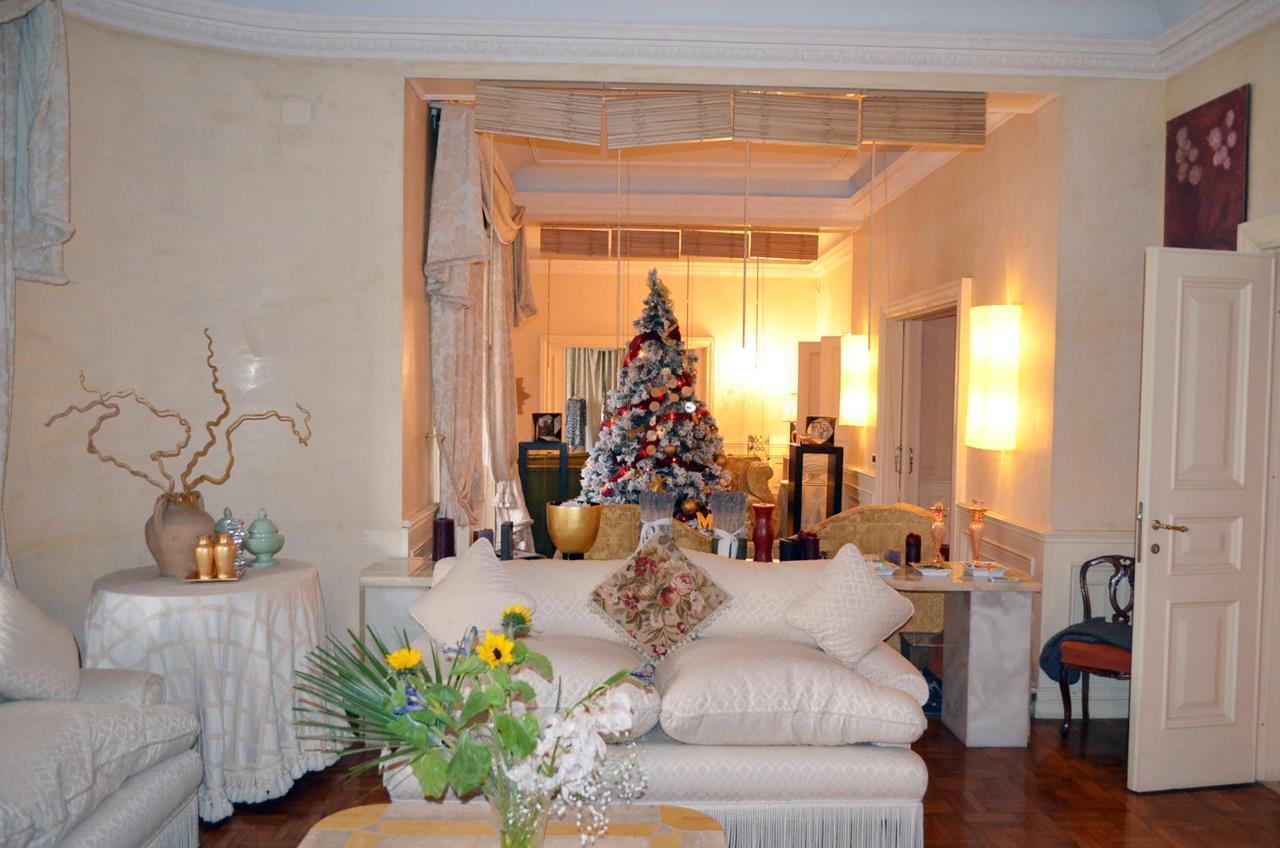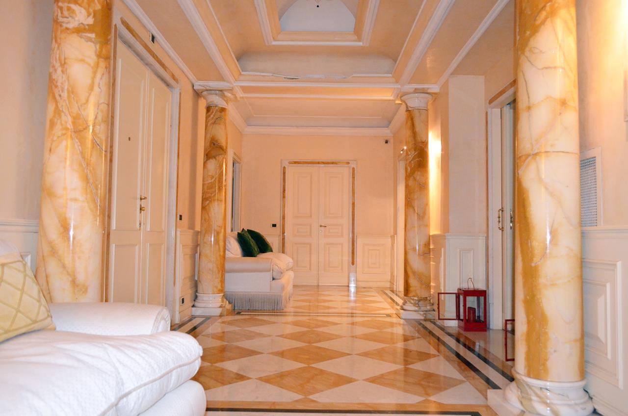 The apartment consists of a large entrance / gallery with columns and marble floors, triple living room with access to the terrace area, a large and pleasant dining room with fireplace covered in boiseries, study room or bedroom with wardrobe, bathroom , kitchen with central island, laundry / ironing, two bedrooms with shared marble bathroom, hallway, main bedroom with large bathroom covered in precious marble and wardrobe, bedroom with wardrobe and mosaic-covered bathroom . Two closets / cabinets.