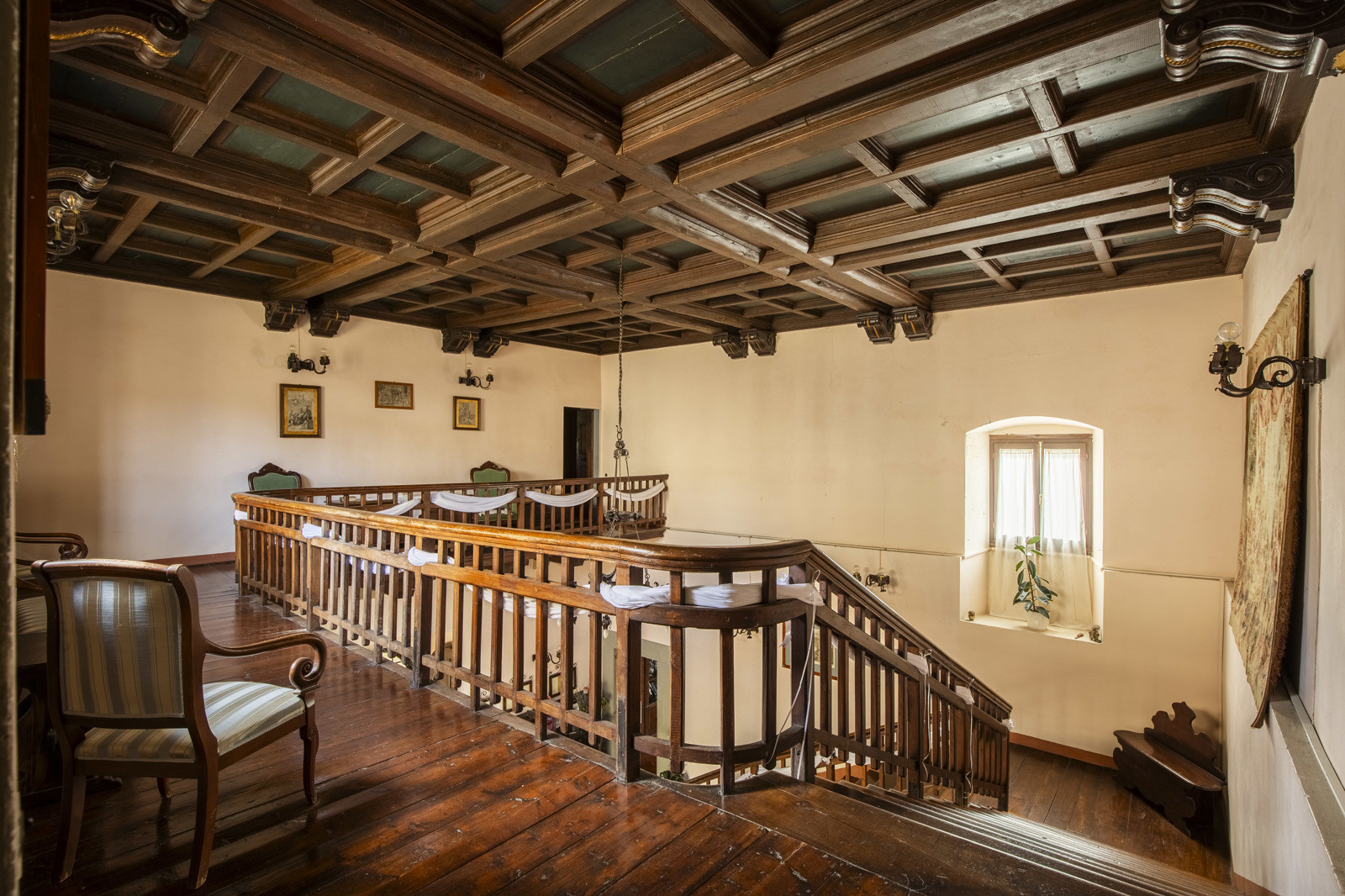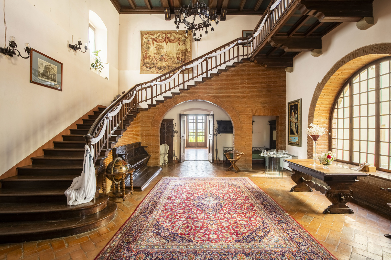 Access to the property is down a tree-lined avenue, from which you can glimpse the charming loggia leading to the imposing halls connected by round arches and enriched by frescoes and coffered ceilings.
