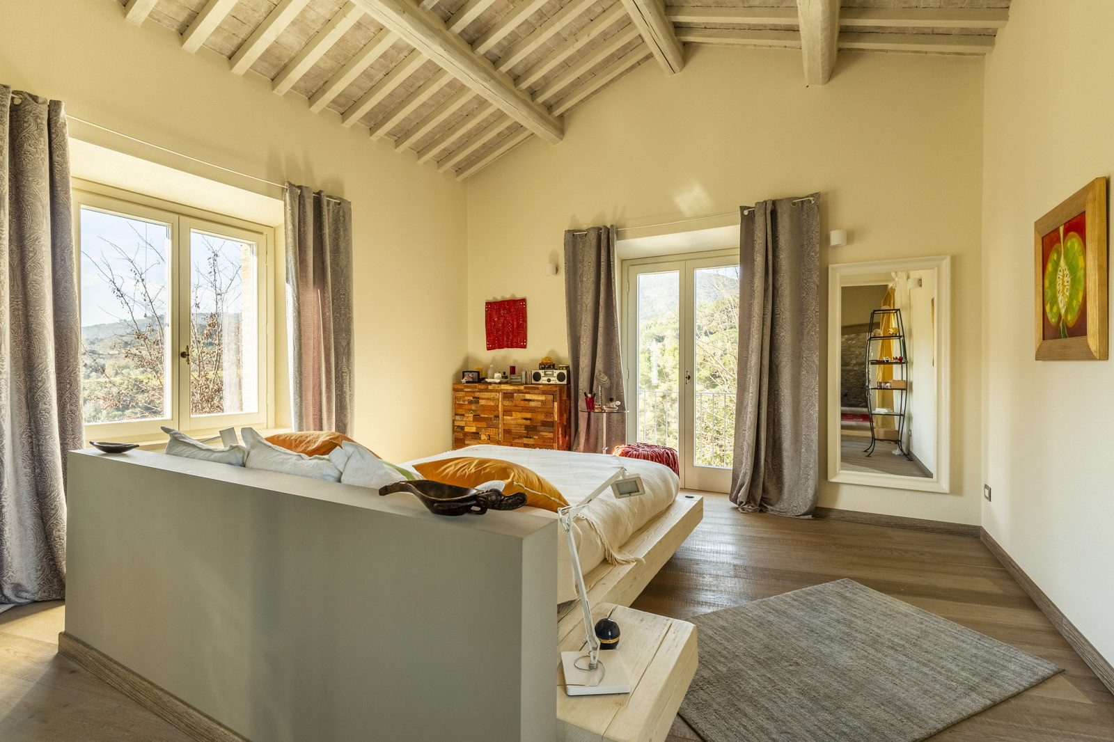 A beautiful staircase leads up to a large hallway, where there is the main bedroom with private bathroom and walk-in closet, another bedroom, another bathroom and an independent apartment consisting of two bedrooms, a bathroom and a large living room, all of which can also be reached via the external staircase that goes up to the wonderful loggia where there is a panoramic view of the entire valley.