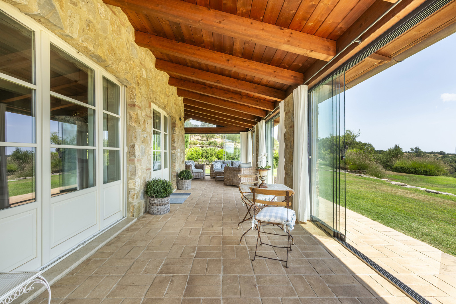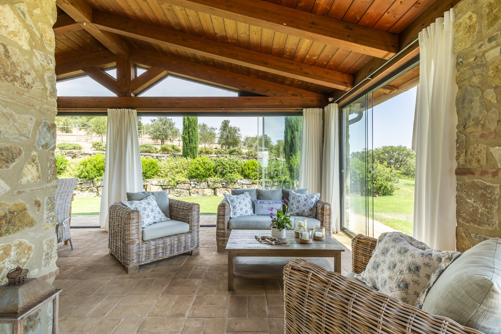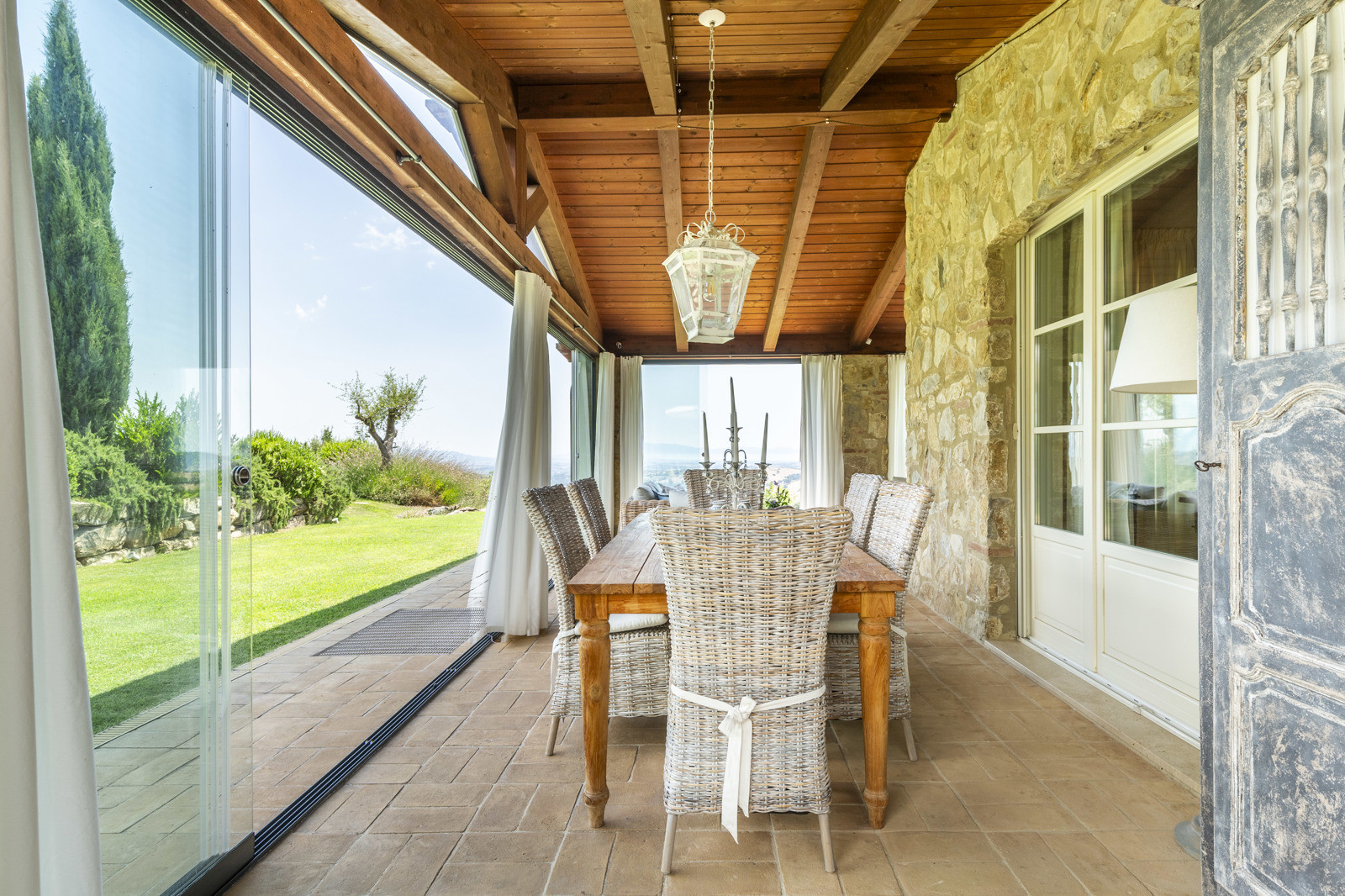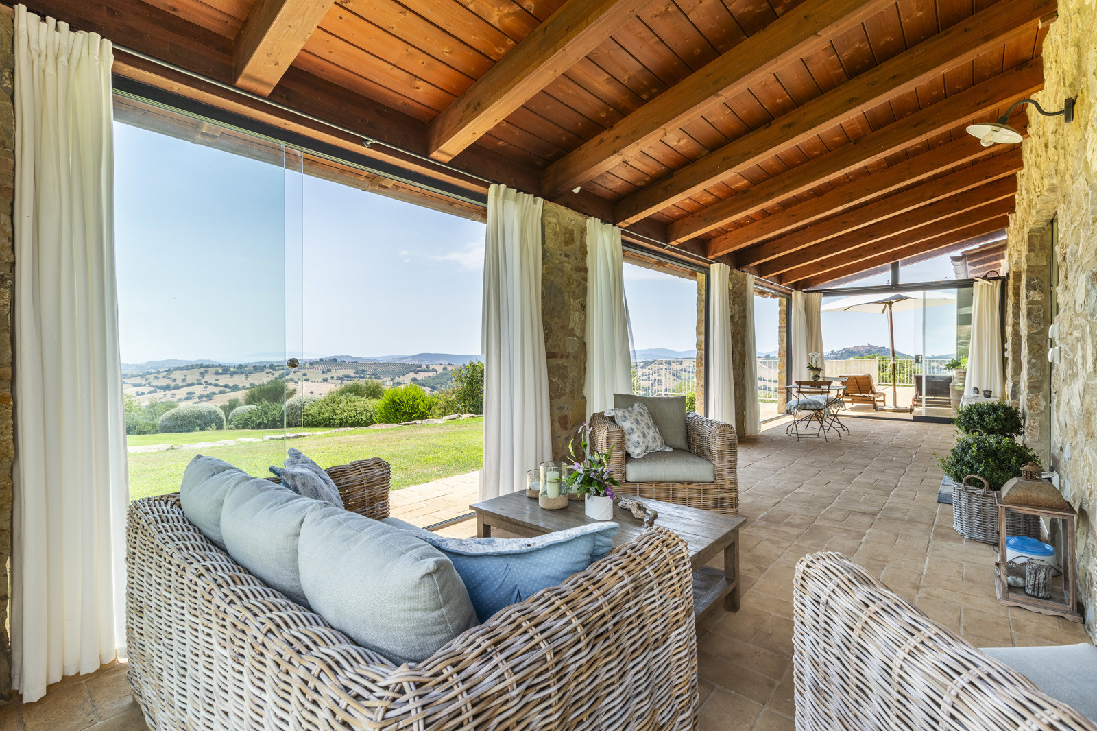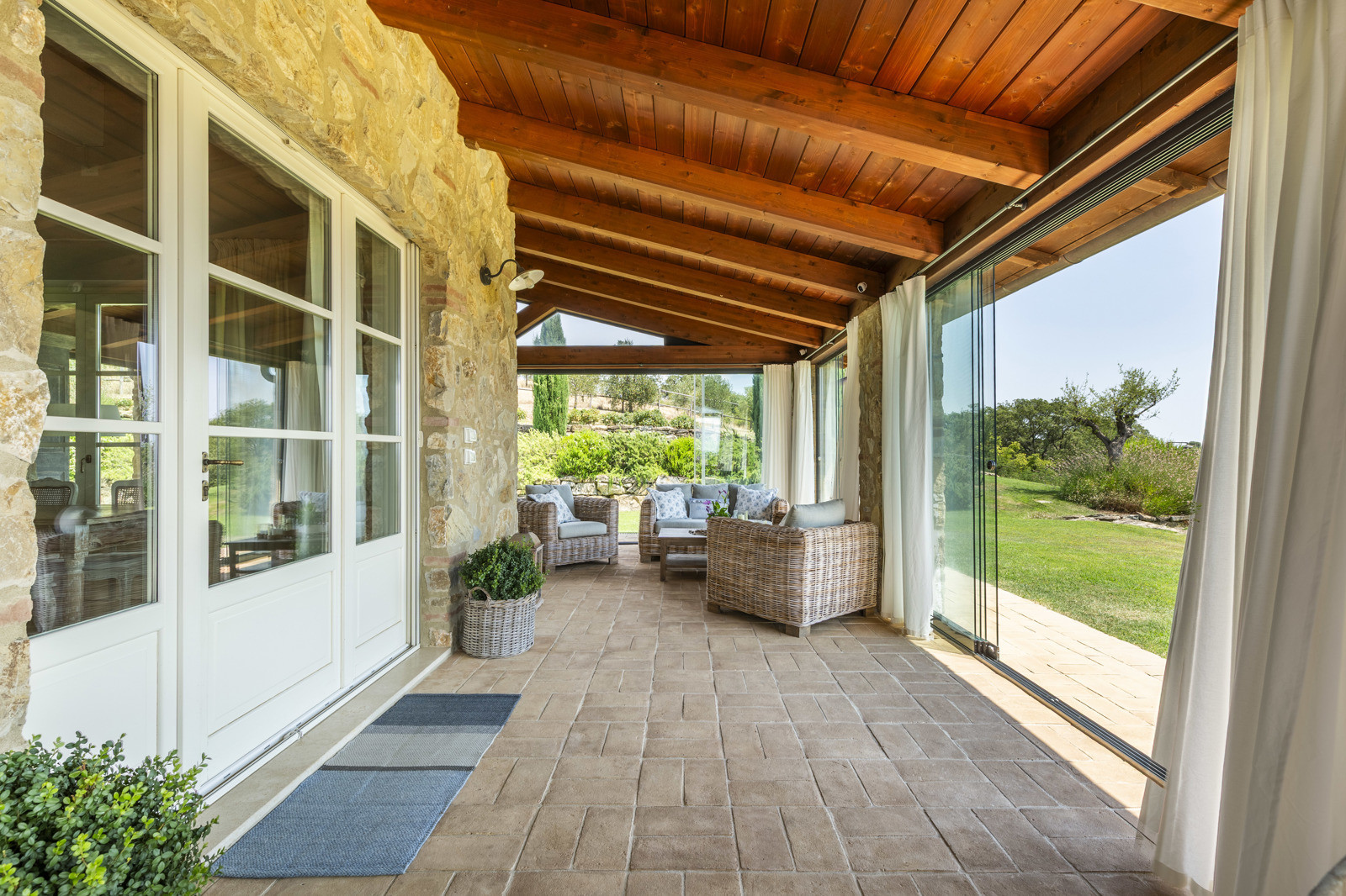 The villa is the result of a recent and careful renovation carried out in keeping with Tuscan style: exposed stone, wooden ceilings, terracotta floors, travertine, and neutral colors dominate the rooms. The light wood fixtures, integrated mosquito nets, and the elegant simplicity of the furnishings lend charm without ostentation.