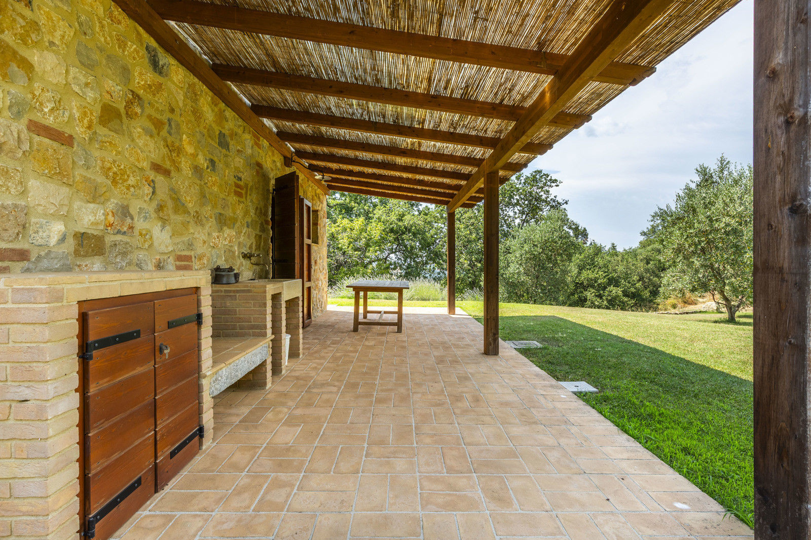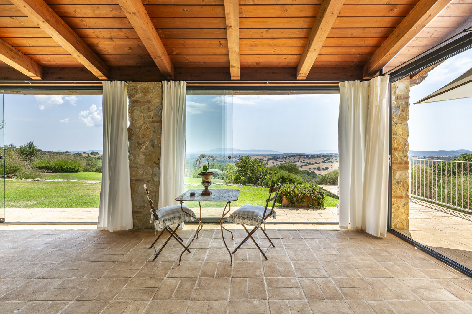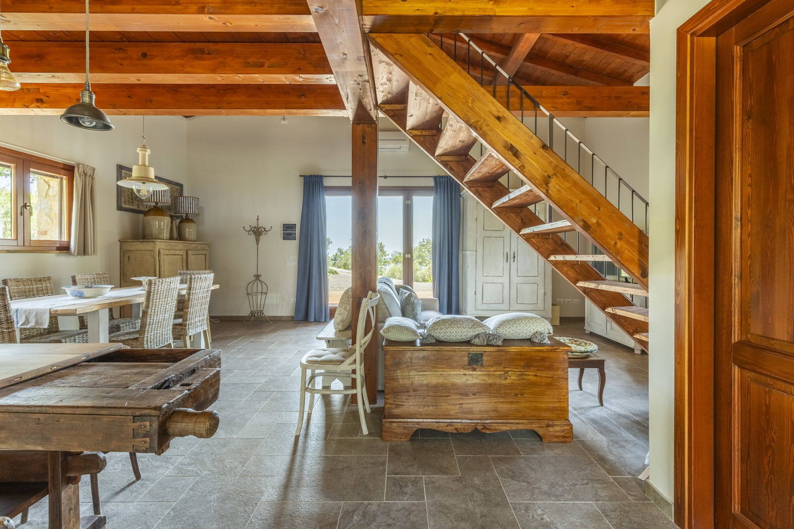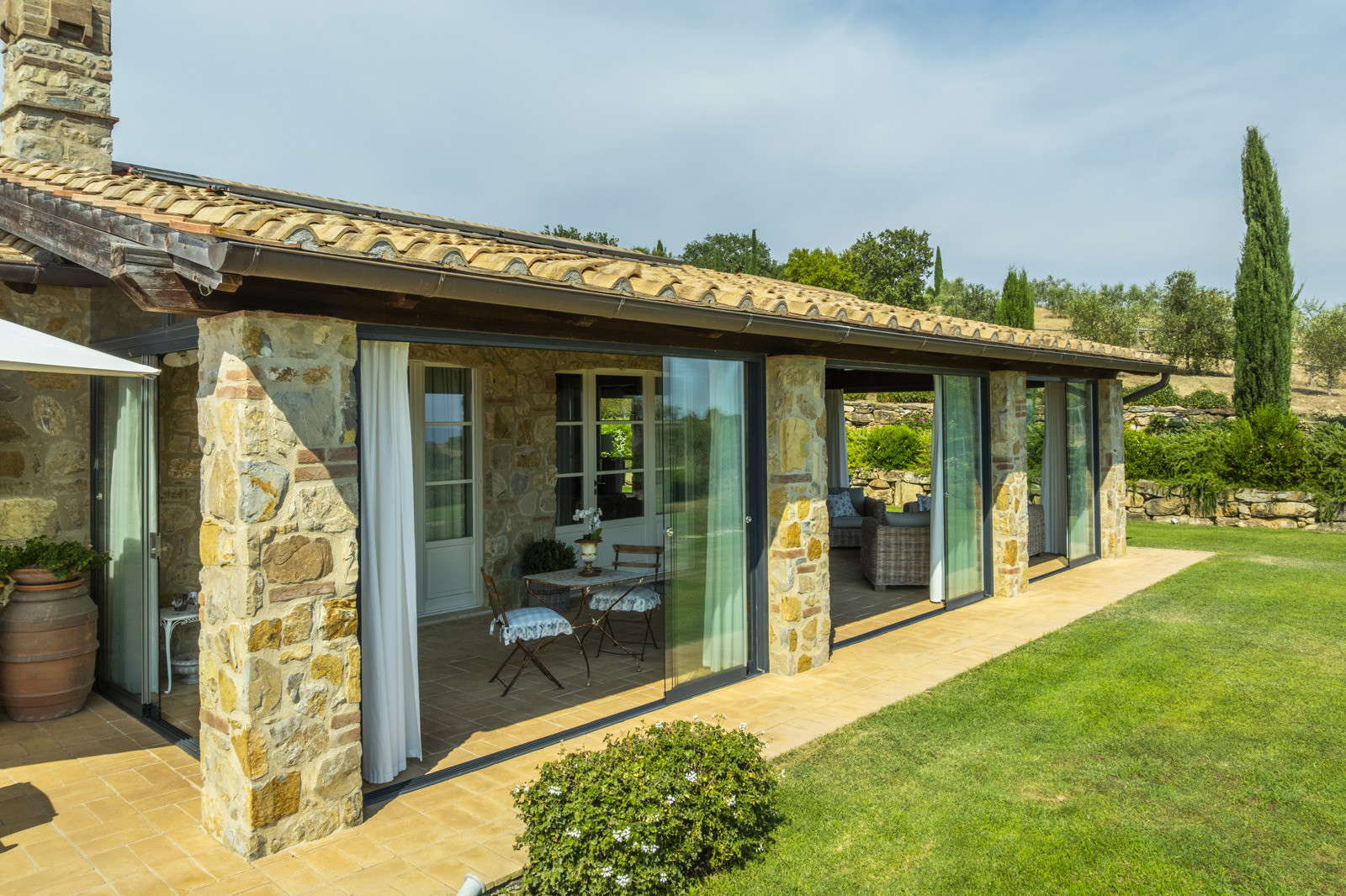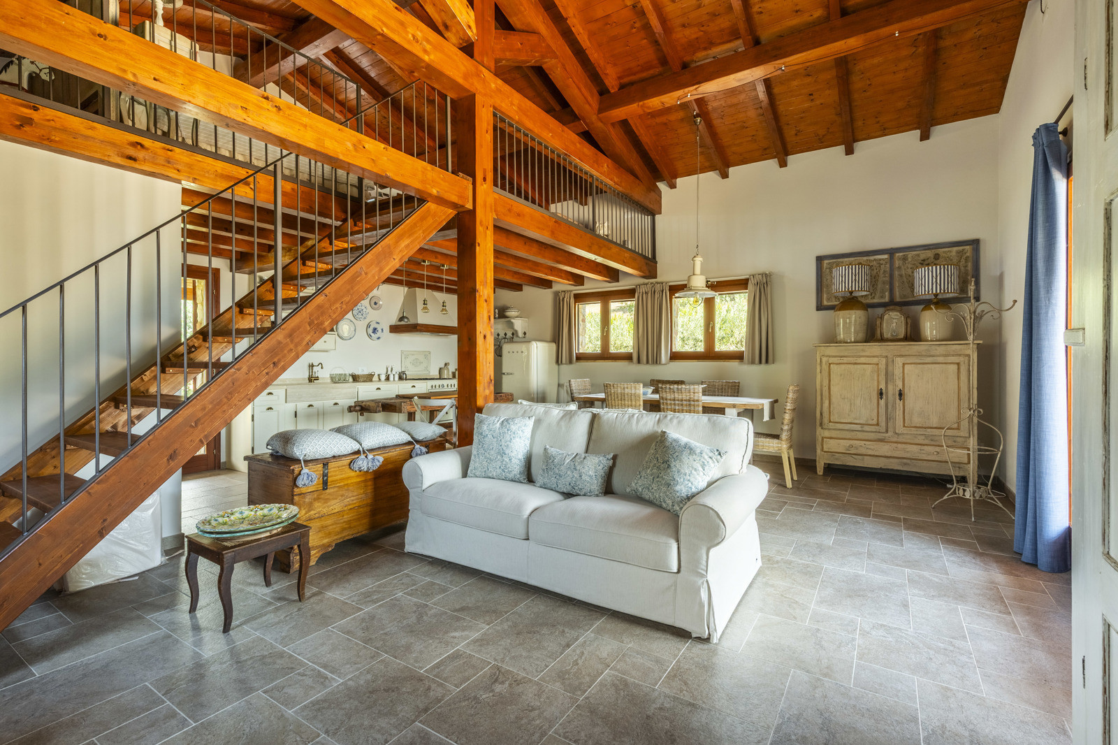 The villa is the result of a recent and careful renovation carried out in keeping with Tuscan style: exposed stone, wooden ceilings, terracotta floors, travertine, and neutral colors dominate the rooms. The light wood fixtures, integrated mosquito nets, and the elegant simplicity of the furnishings lend charm without ostentation.