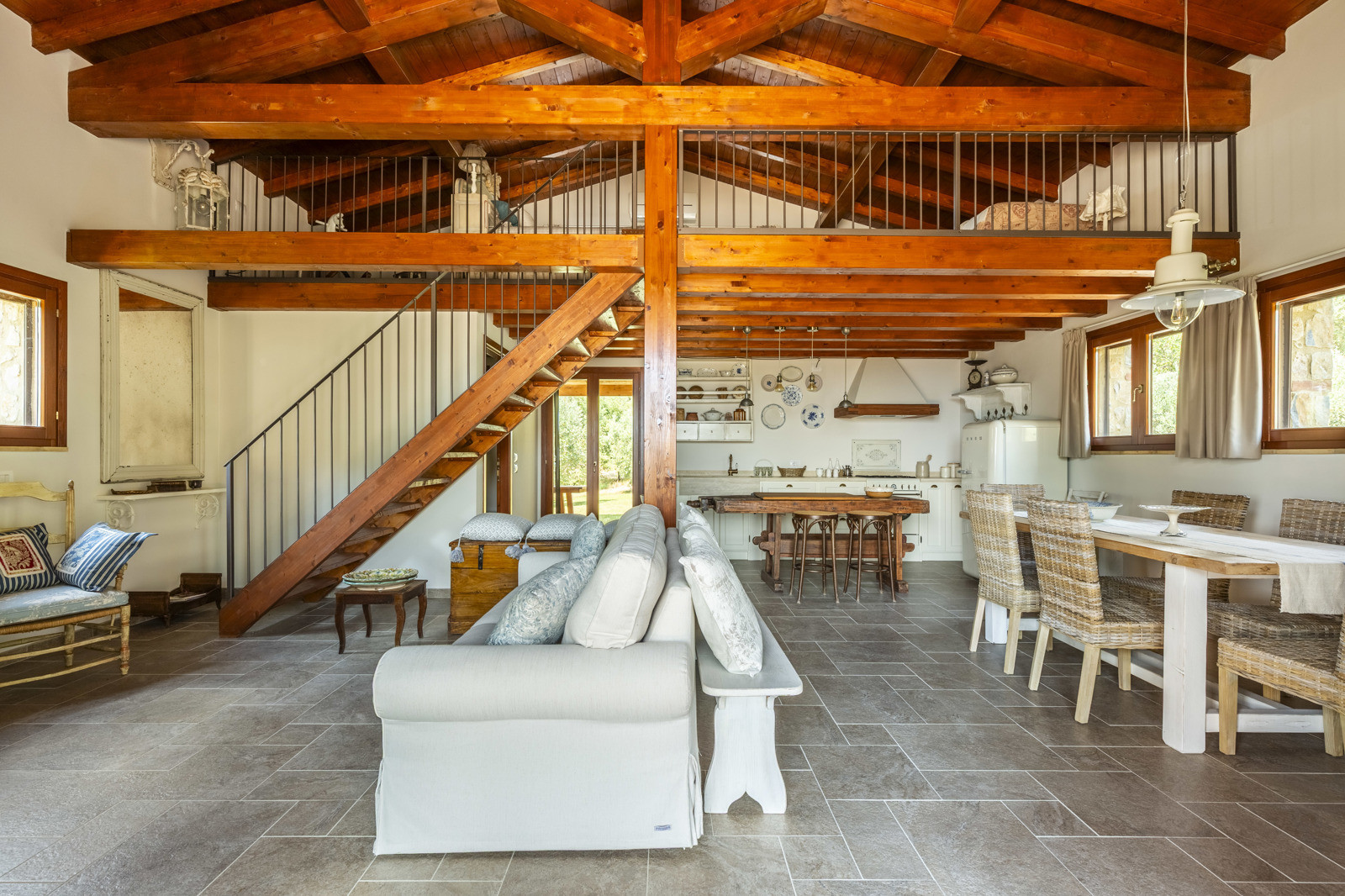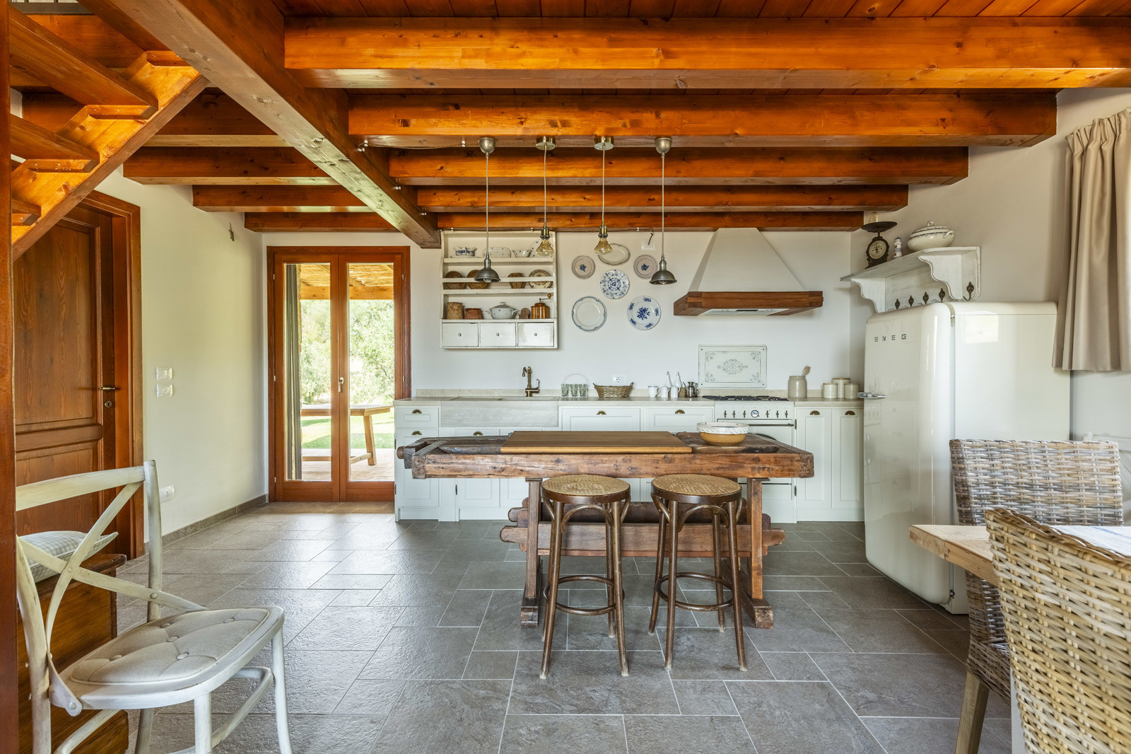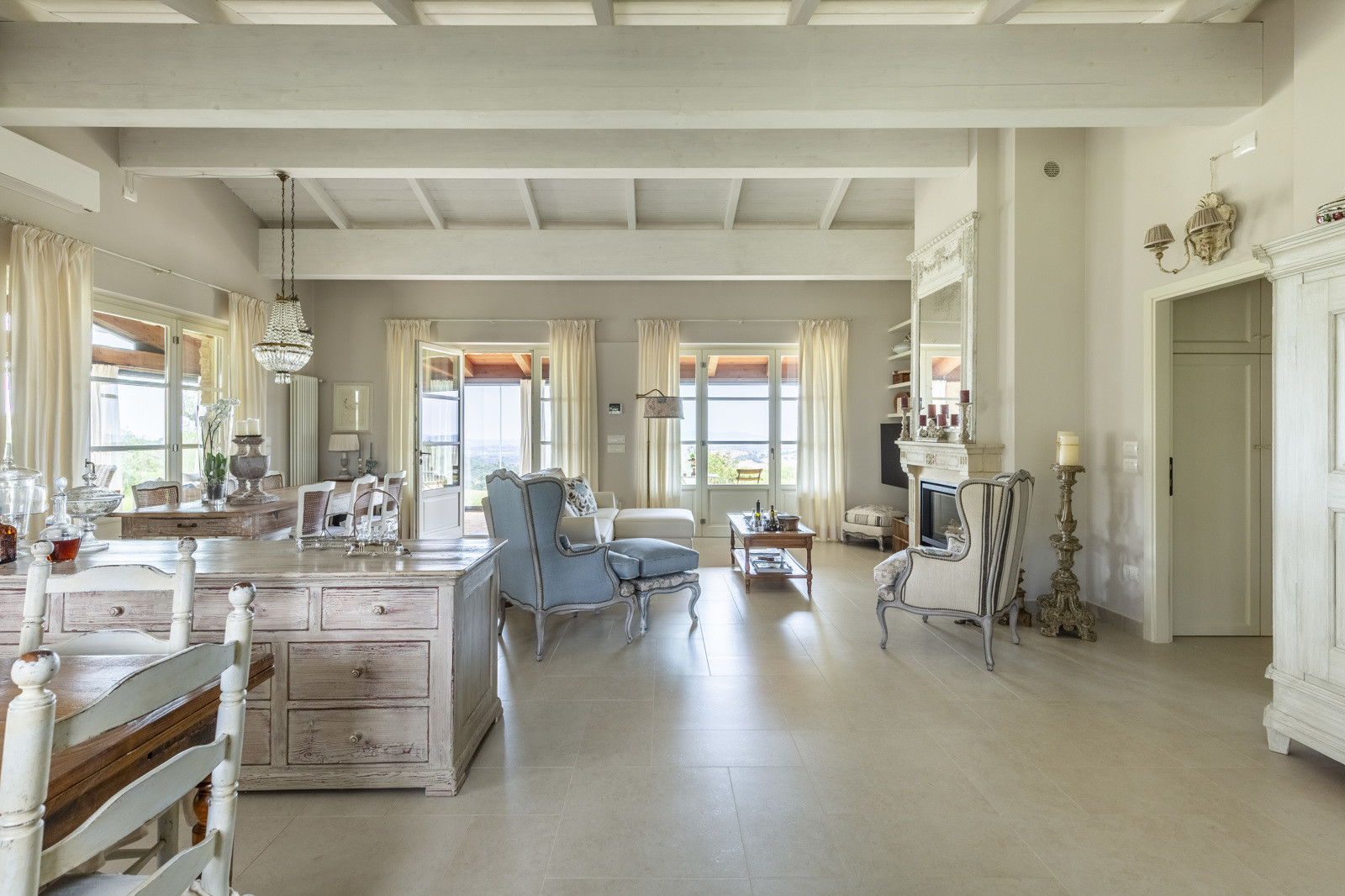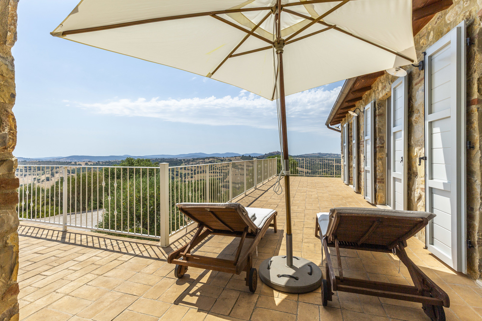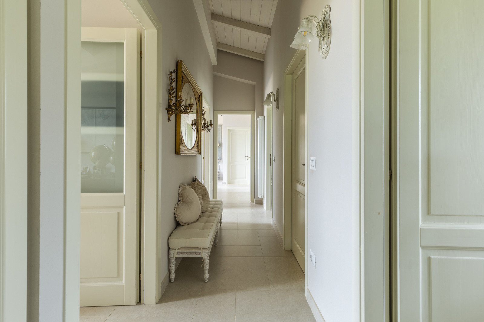 The villa is the result of a recent and careful renovation carried out in keeping with Tuscan style: exposed stone, wooden ceilings, terracotta floors, travertine, and neutral colors dominate the rooms. The light wood fixtures, integrated mosquito nets, and the elegant simplicity of the furnishings lend charm without ostentation.
