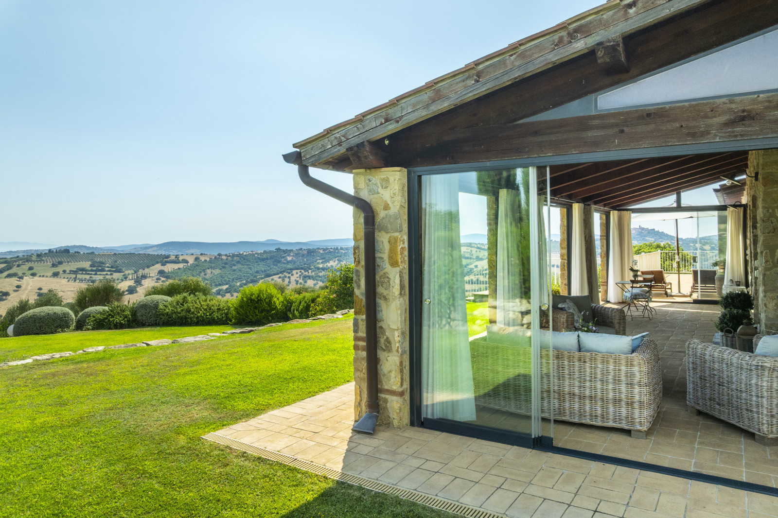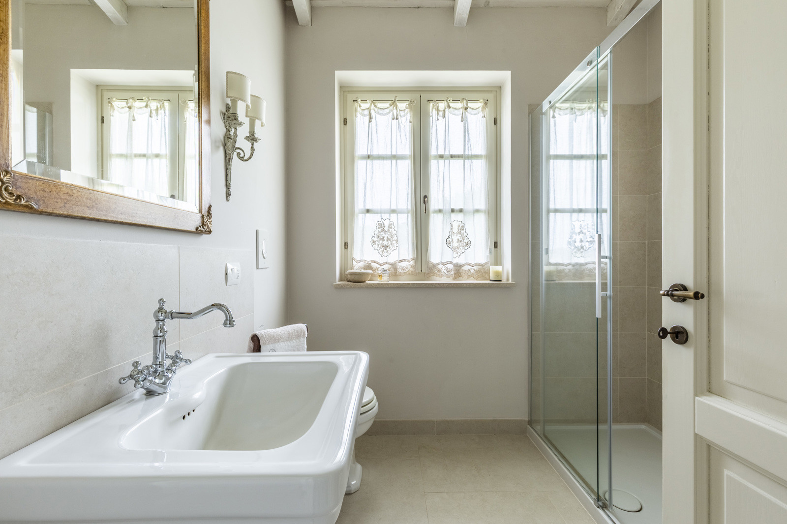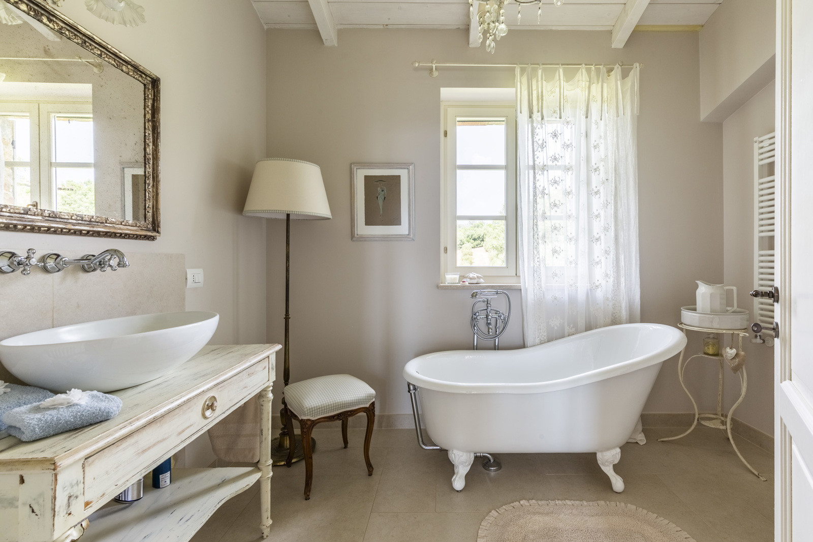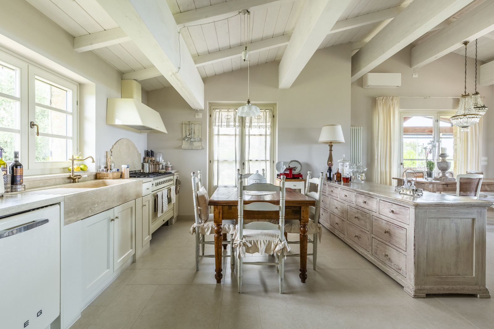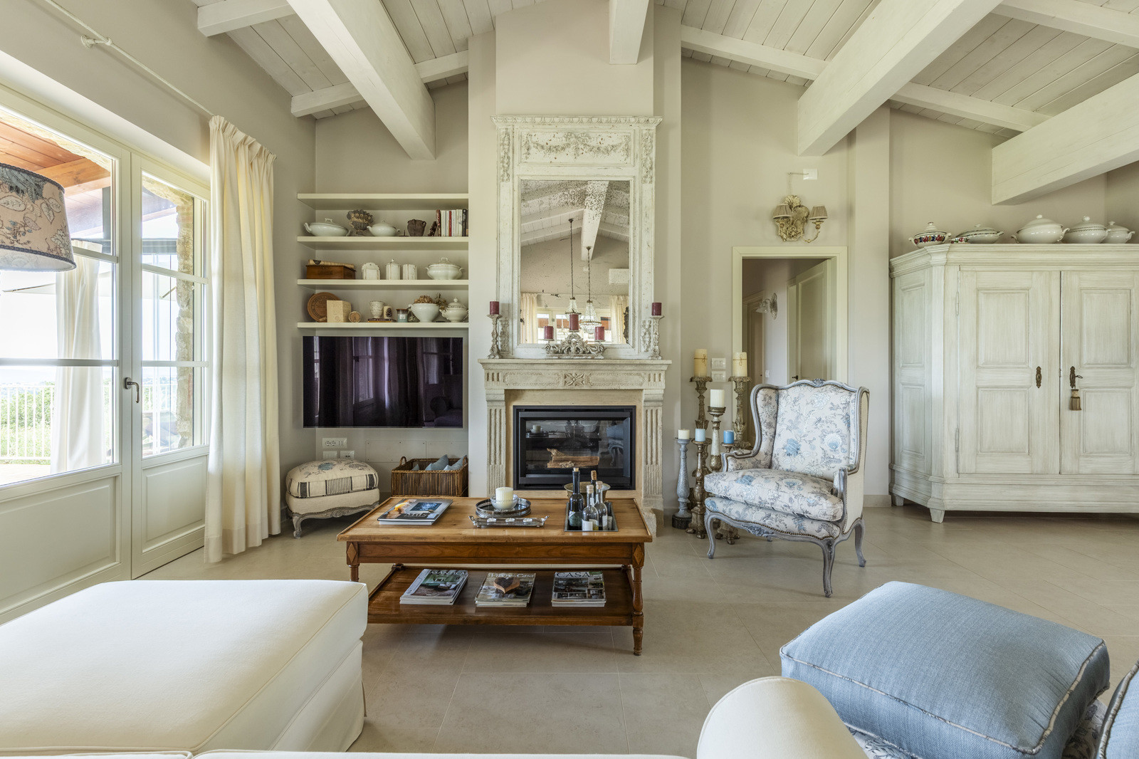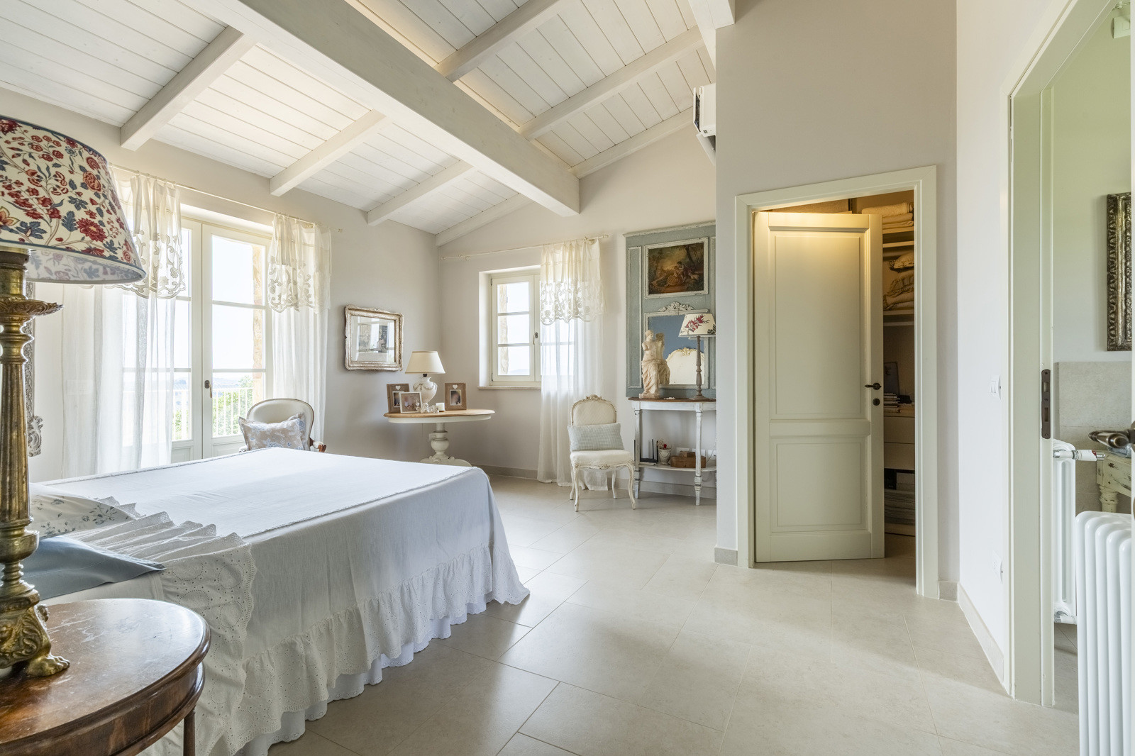 The villa is the result of a recent and careful renovation carried out in keeping with Tuscan style: exposed stone, wooden ceilings, terracotta floors, travertine, and neutral colors dominate the rooms. The light wood fixtures, integrated mosquito nets, and the elegant simplicity of the furnishings lend charm without ostentation.