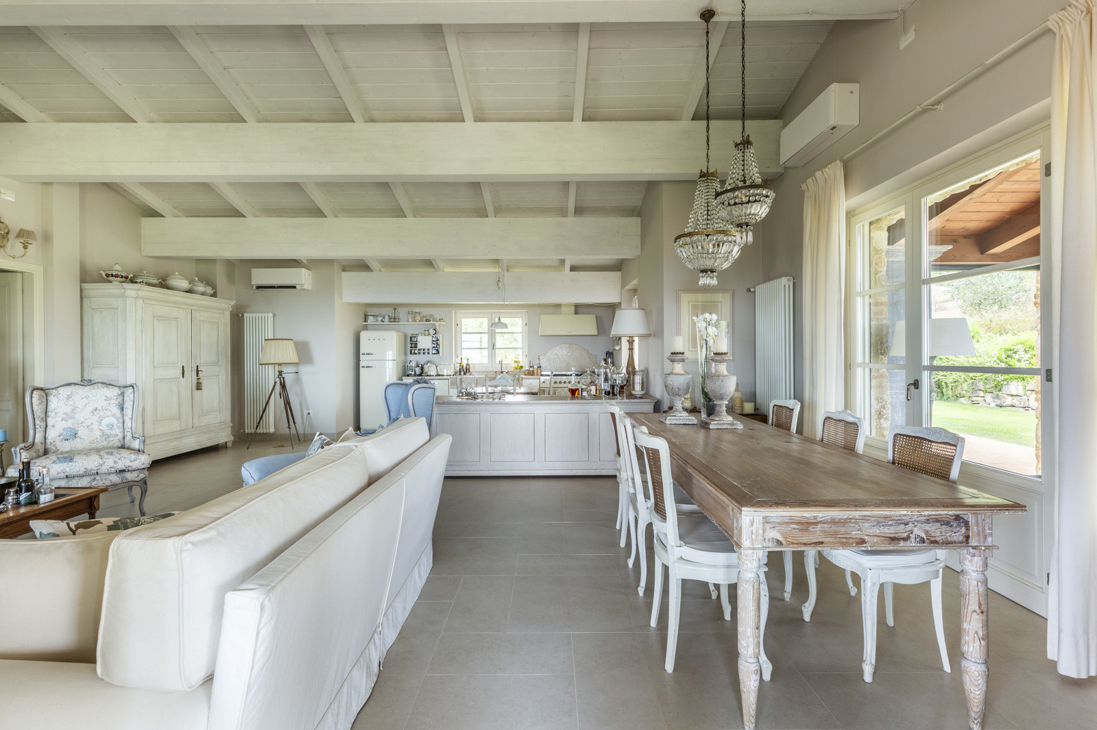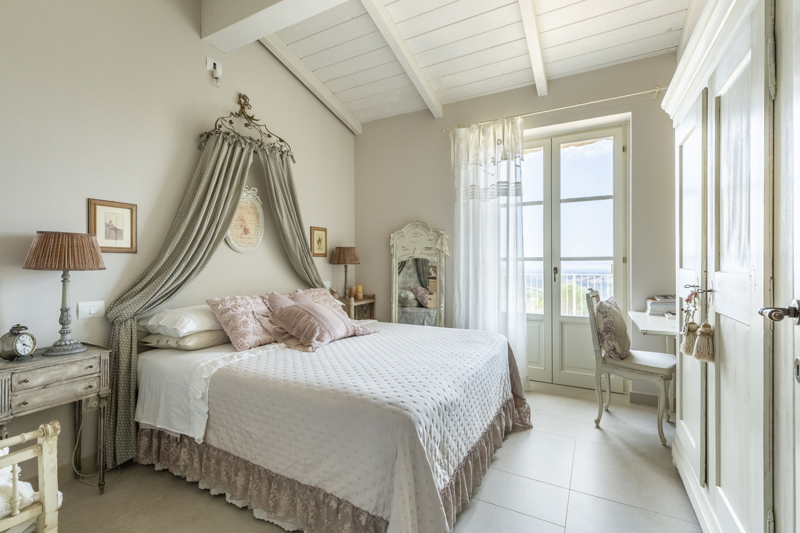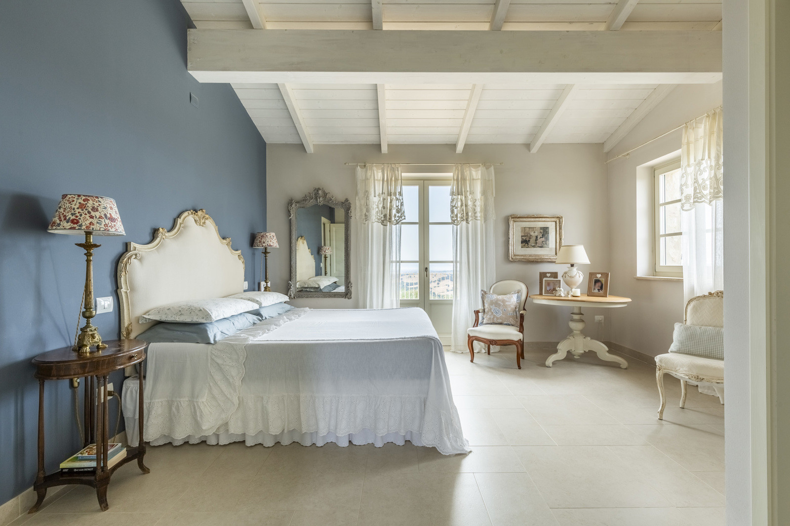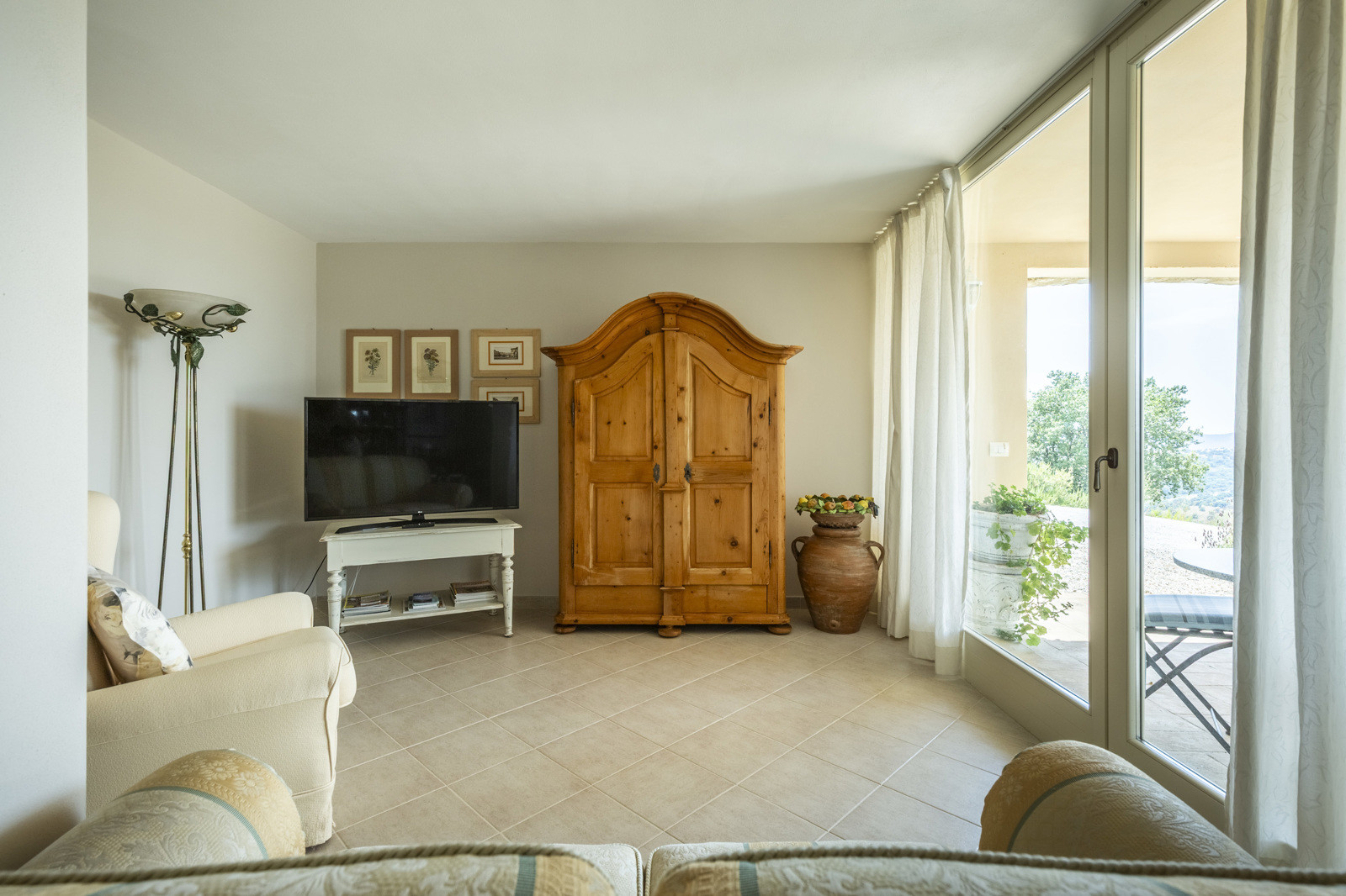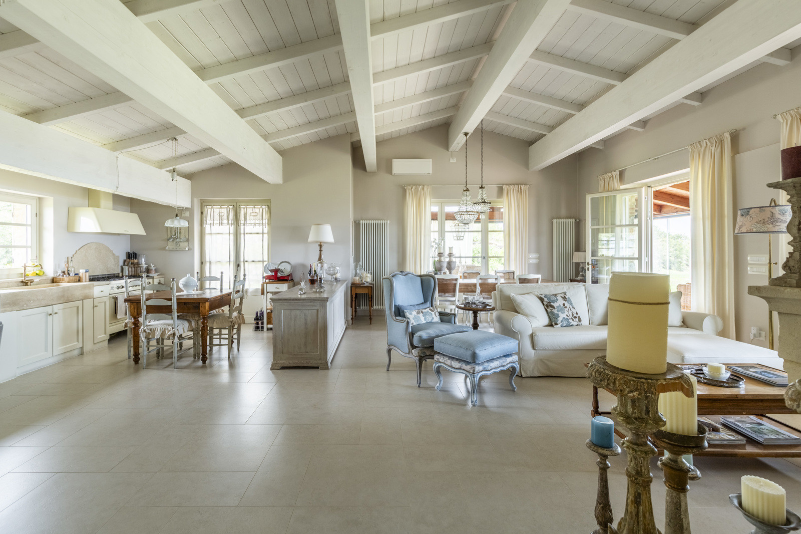The villa is the result of a recent and careful renovation carried out in keeping with Tuscan style: exposed stone, wooden ceilings, terracotta floors, travertine, and neutral colors dominate the rooms. The light wood fixtures, integrated mosquito nets, and the elegant simplicity of the furnishings lend charm without ostentation.