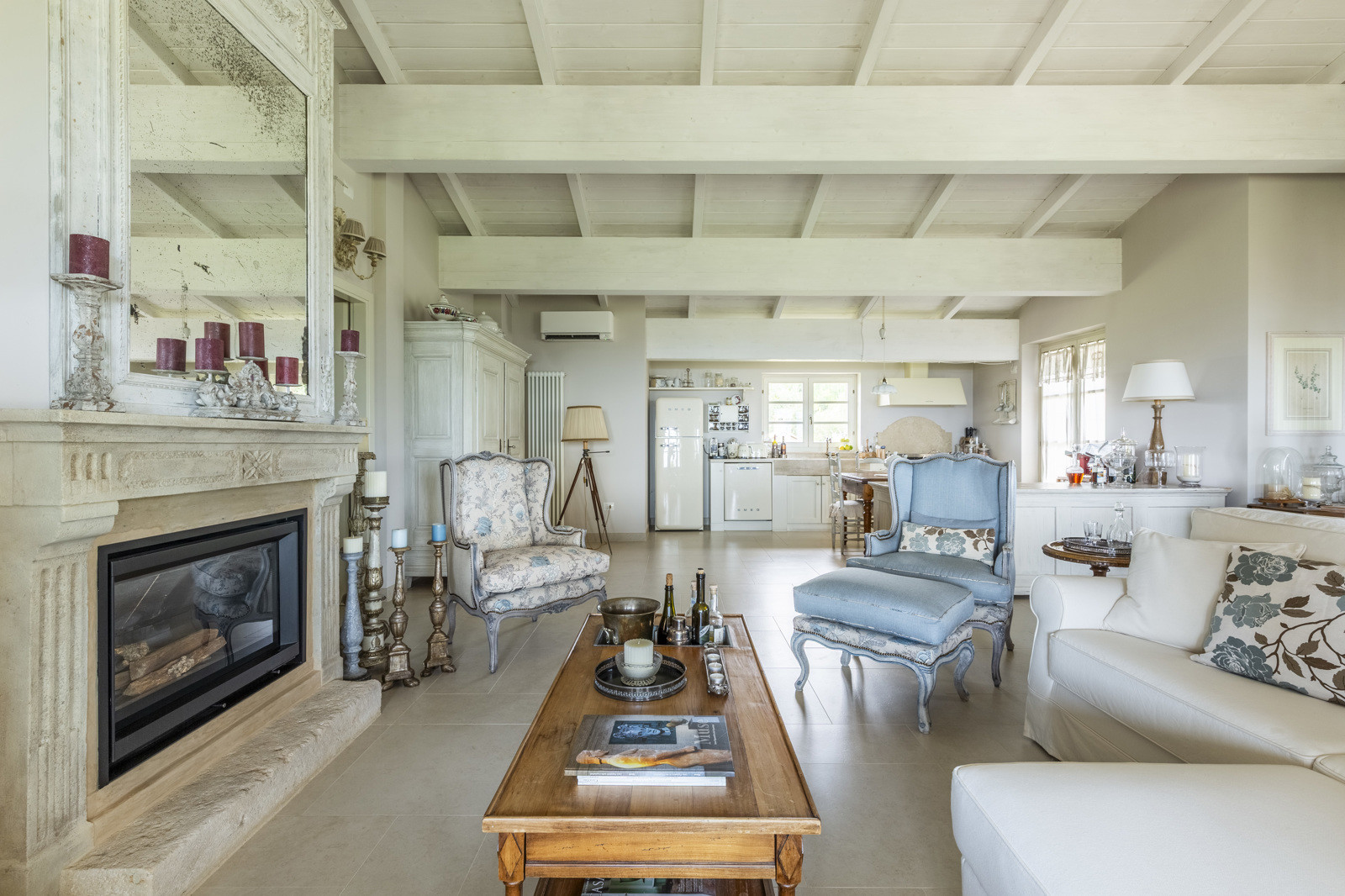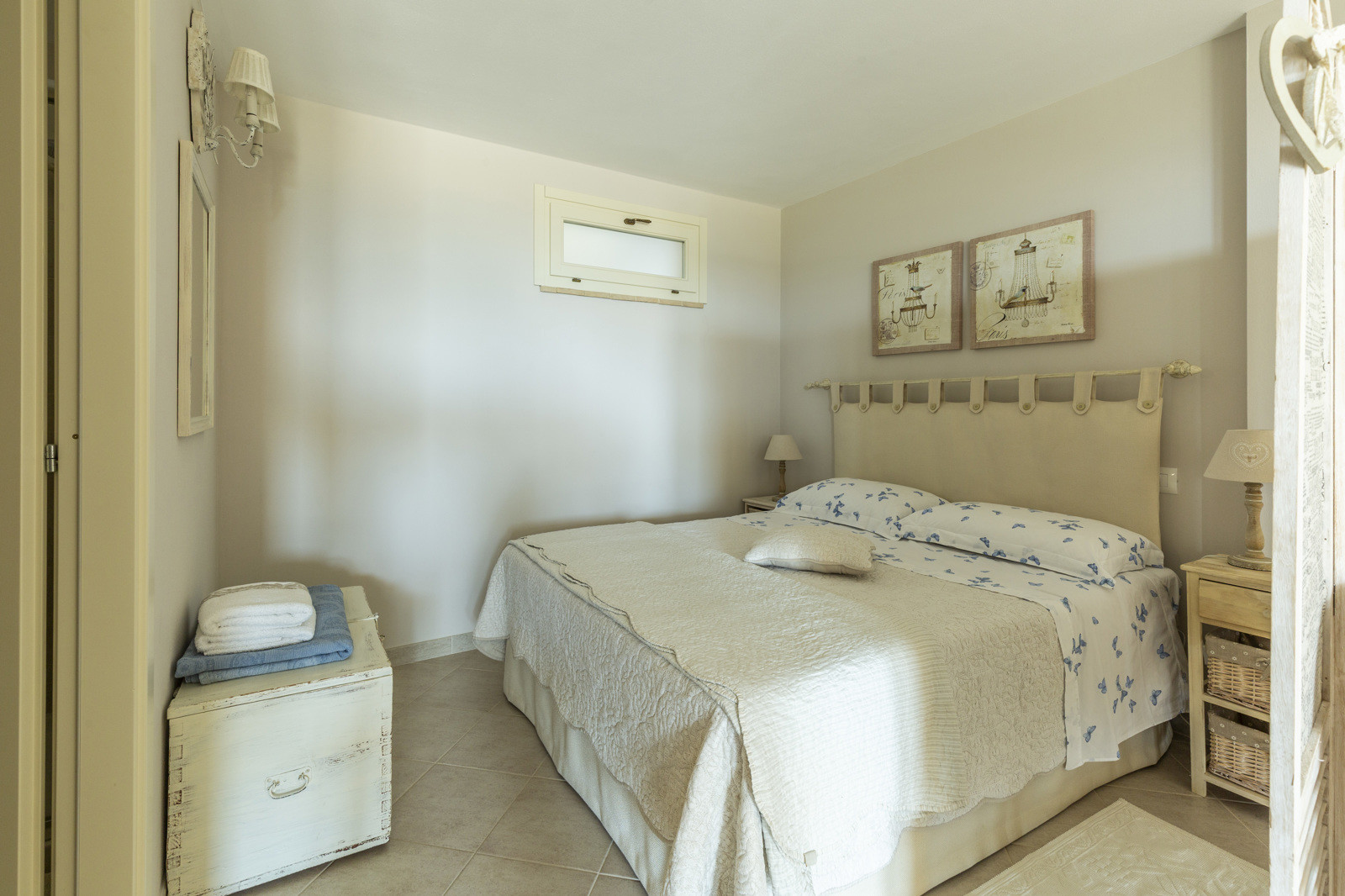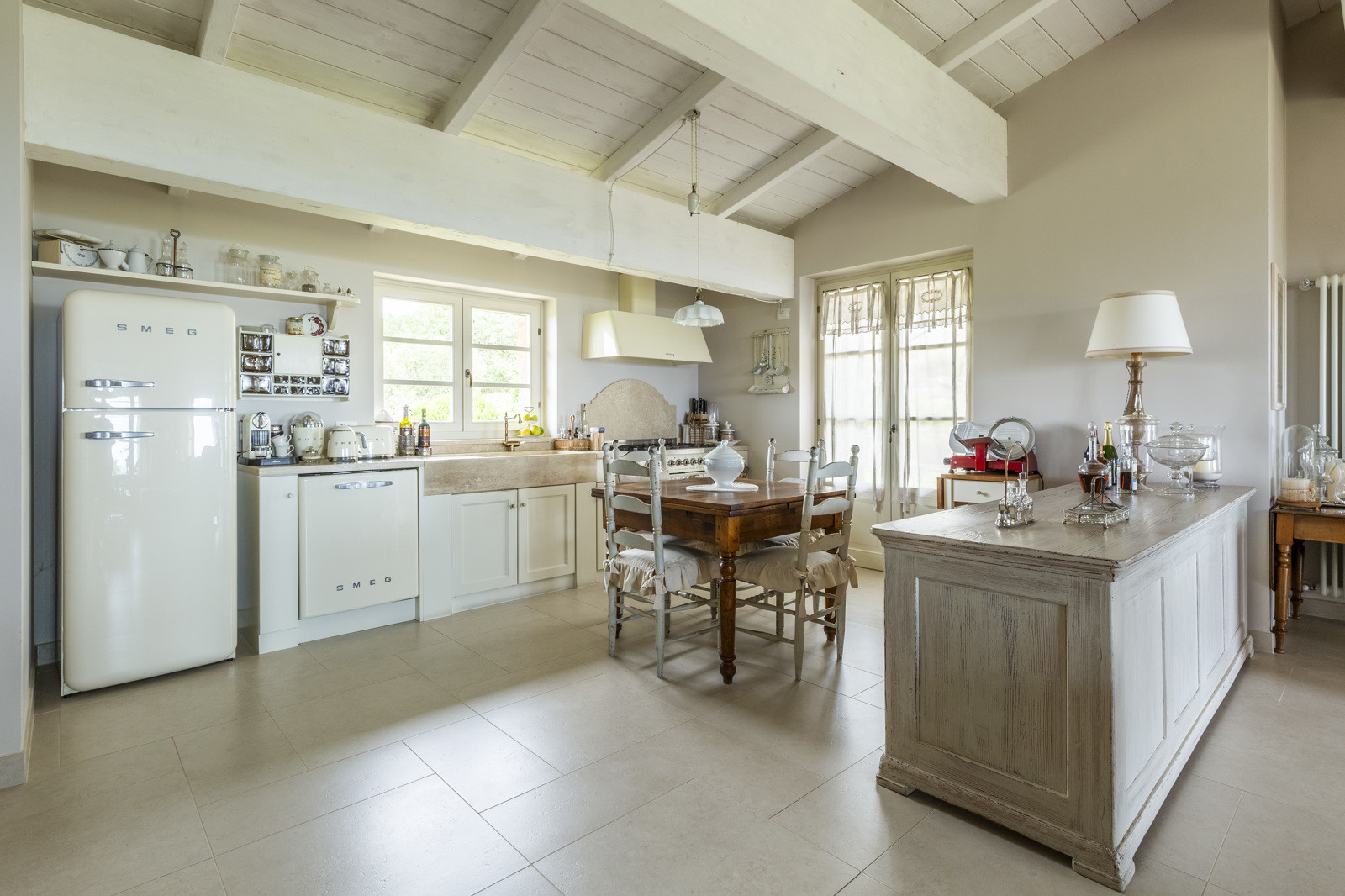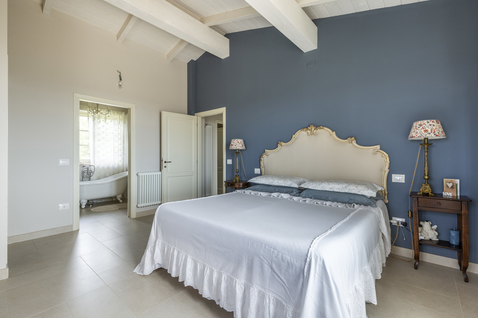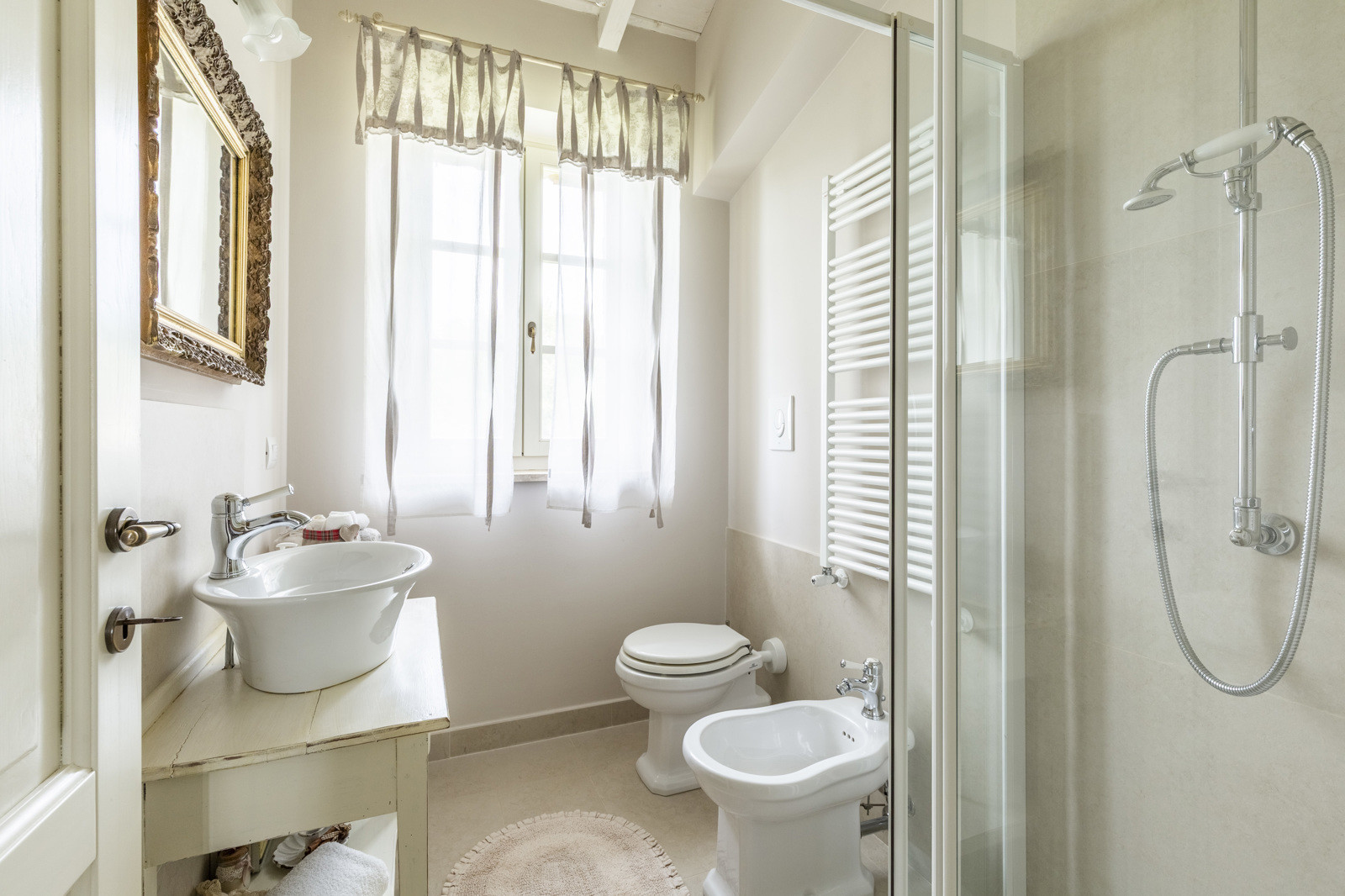 The villa is the result of a recent and careful renovation carried out in keeping with Tuscan style: exposed stone, wooden ceilings, terracotta floors, travertine, and neutral colors dominate the rooms. The light wood fixtures, integrated mosquito nets, and the elegant simplicity of the furnishings lend charm without ostentation.