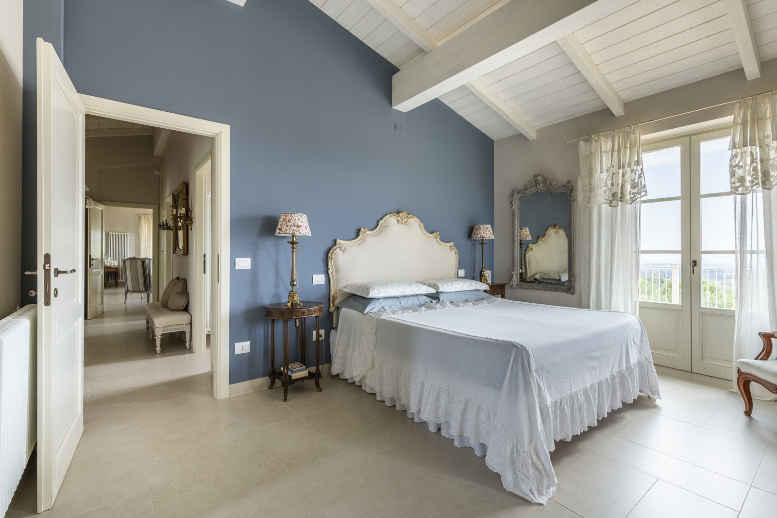 The main villa, measuring approximately 376 sqm (over 540 sqm gross), is mainly on one level and has 3 bedrooms and 3 bathrooms, a living room with a stone fireplace, a bright dining room, a fully equipped kitchen, exposed beam ceilings, and neutral tones that create an elegant and relaxing atmosphere. The main bedroom, with en-suite bathroom featuring a beautiful cast iron bathtub with a view and a comfortable dressing room, enjoys double exposure with views of the sea and the village of Montiano.