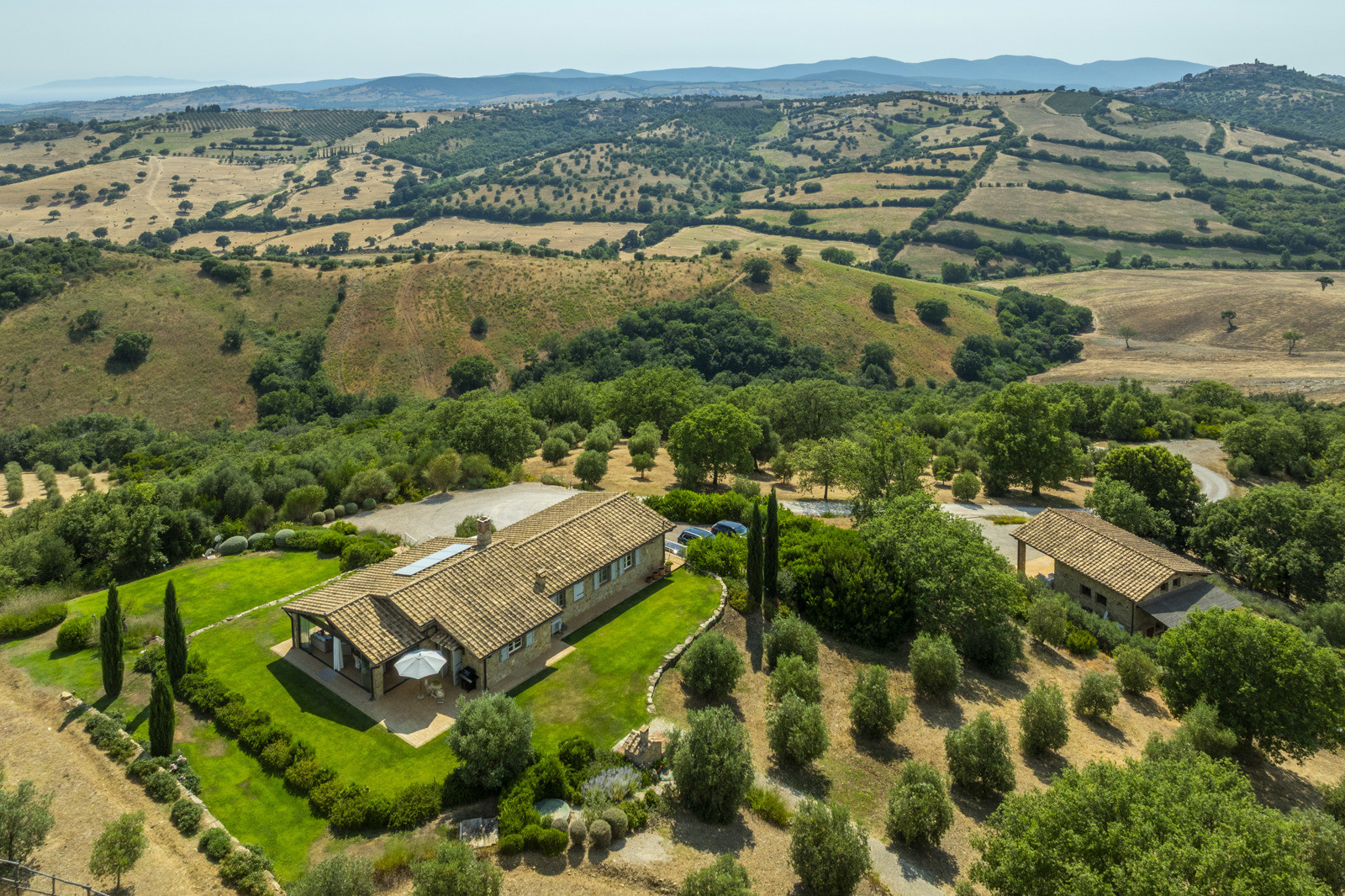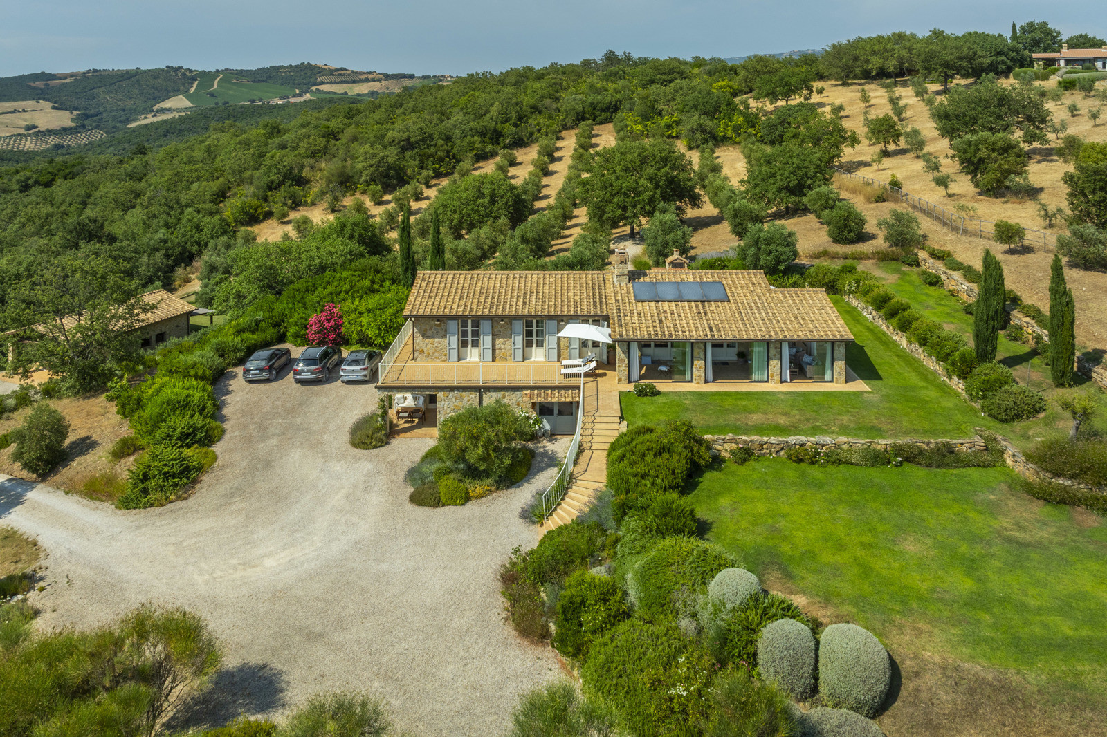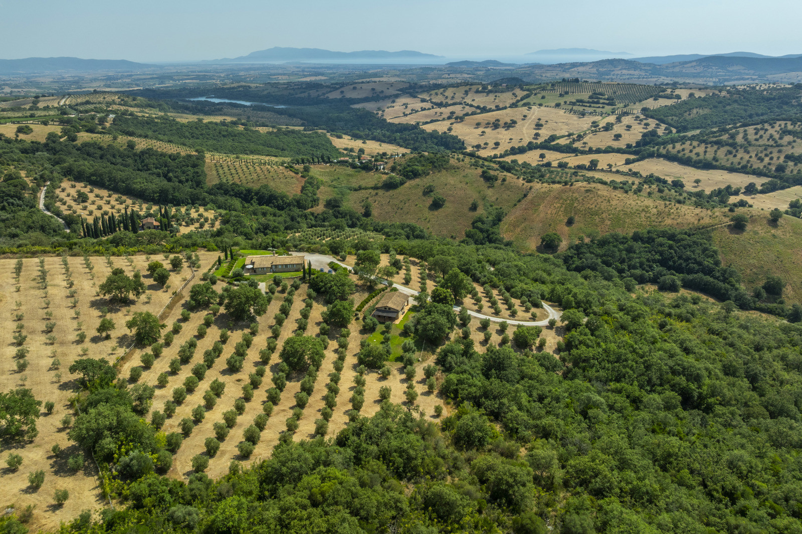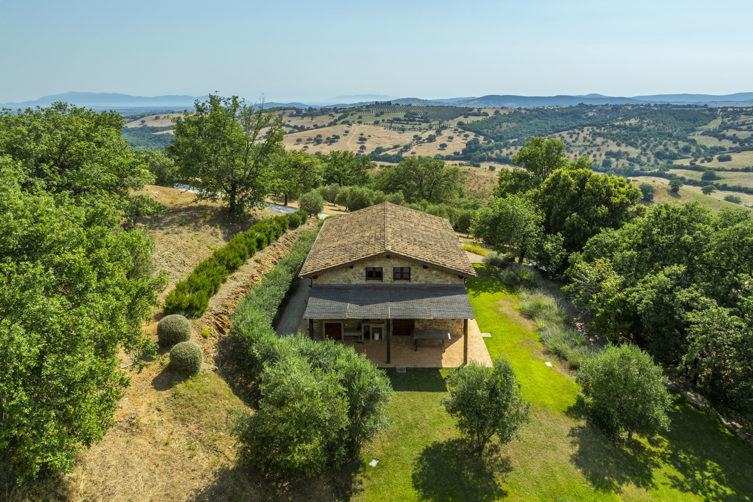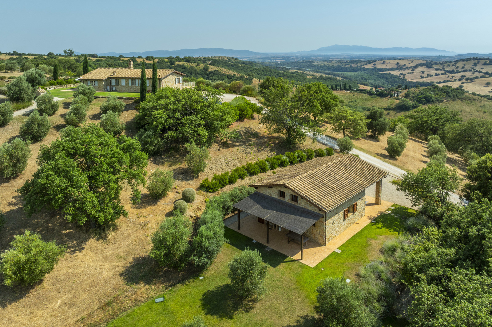 The estate is located near Magliano in Toscana, renowned for its Morellino vineyards, hilly landscapes, and proximity to the sea. Although in the countryside, it is easily accessible and surrounded by prestigious residences that guarantee privacy in an authentic setting. The beaches of Monte Argentario, such as Talamone, Porto Ercole, and Porto Santo Stefano, can be reached in 20–30 minutes. Rome is about two hours away, as is Florence; Siena and Pisa airport are about an hour and a half away.