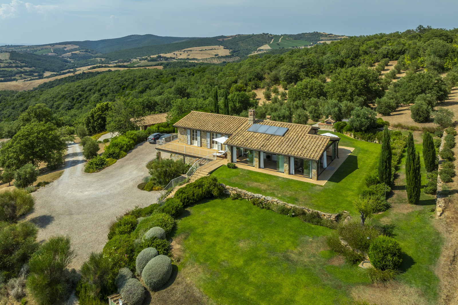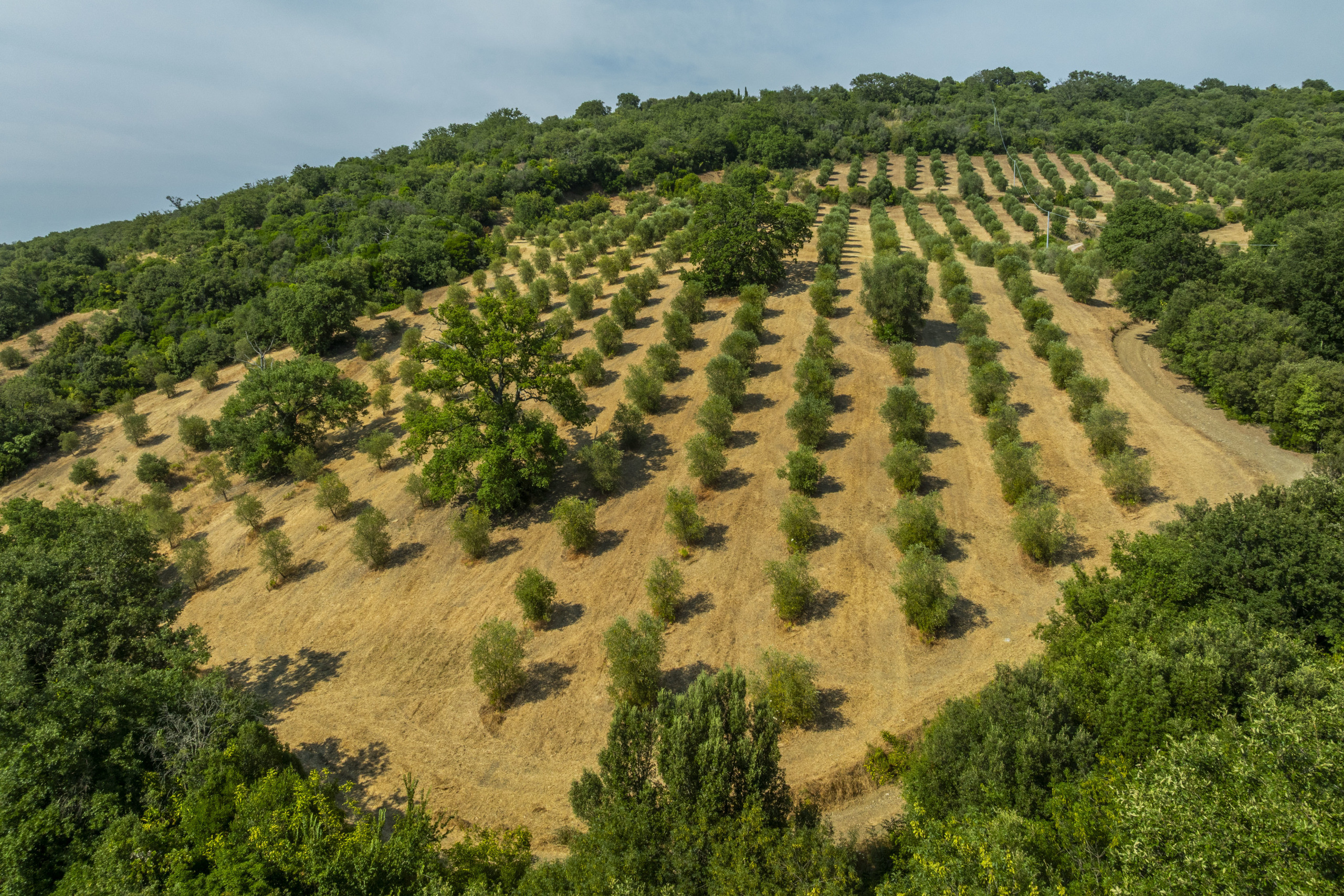 From the private road, a path winds through centuries-old trees to the stone villa, which blends perfectly into the landscape. The 17 hectares of land include an olive grove with around 700 trees, oak and holm oak woods, and arable land ideal for developing the existing agricultural activity.