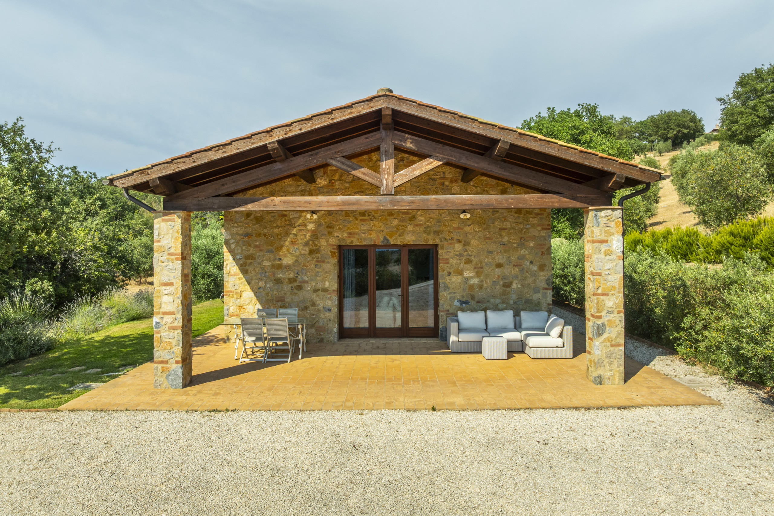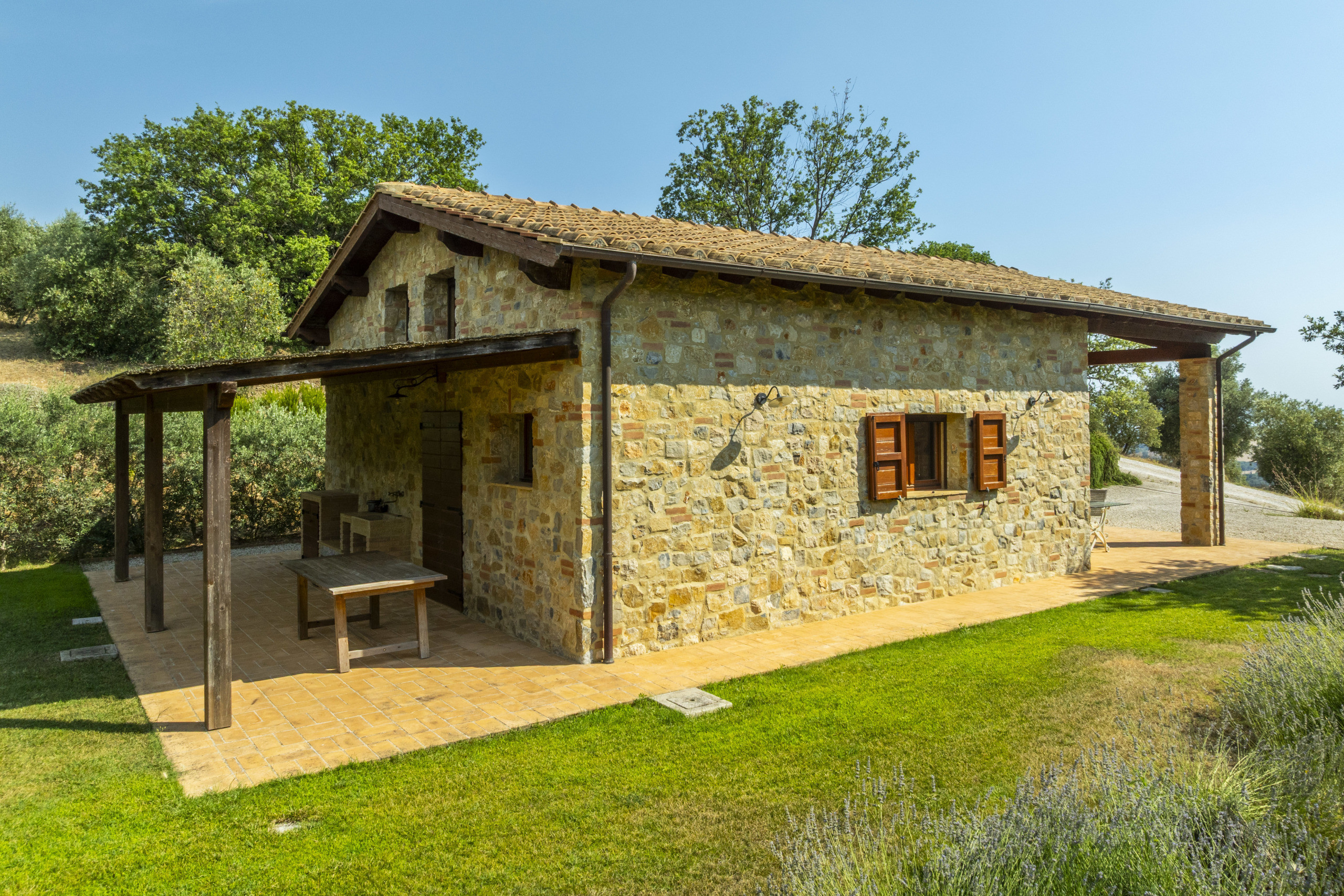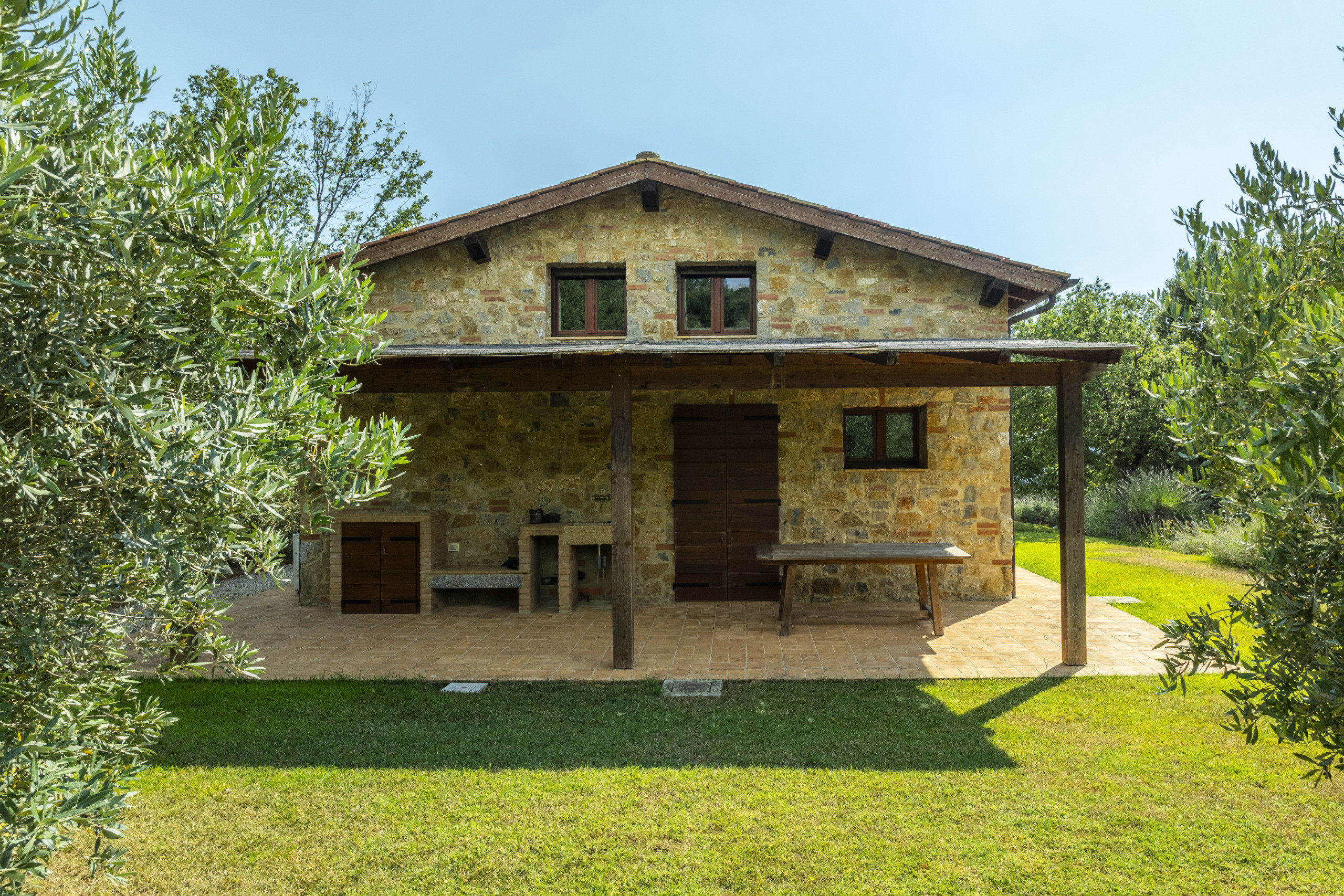 Not far away stands the two-storey annex, with a porch, private garden, living room, kitchen, bedroom, and bathroom, built with traditional Tuscan materials. The buildings are harmoniously distributed.