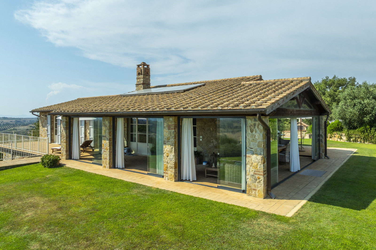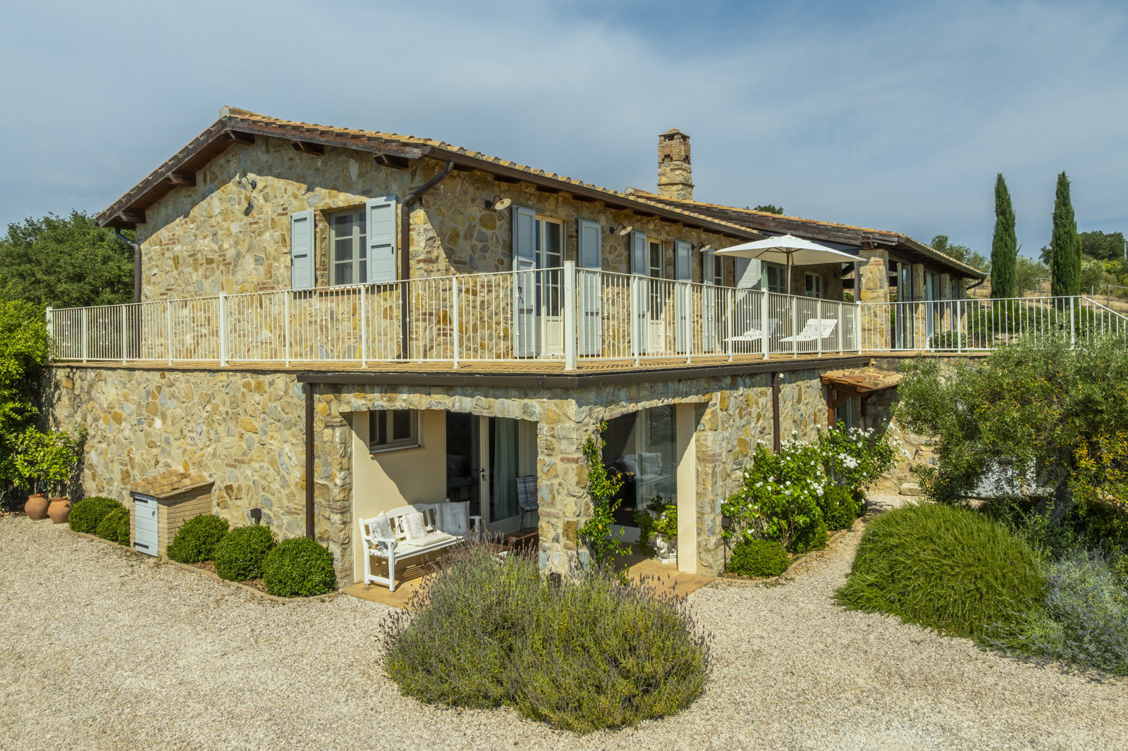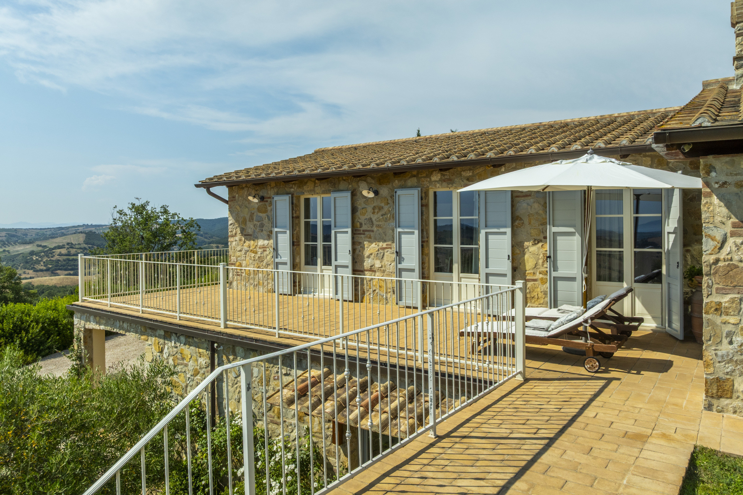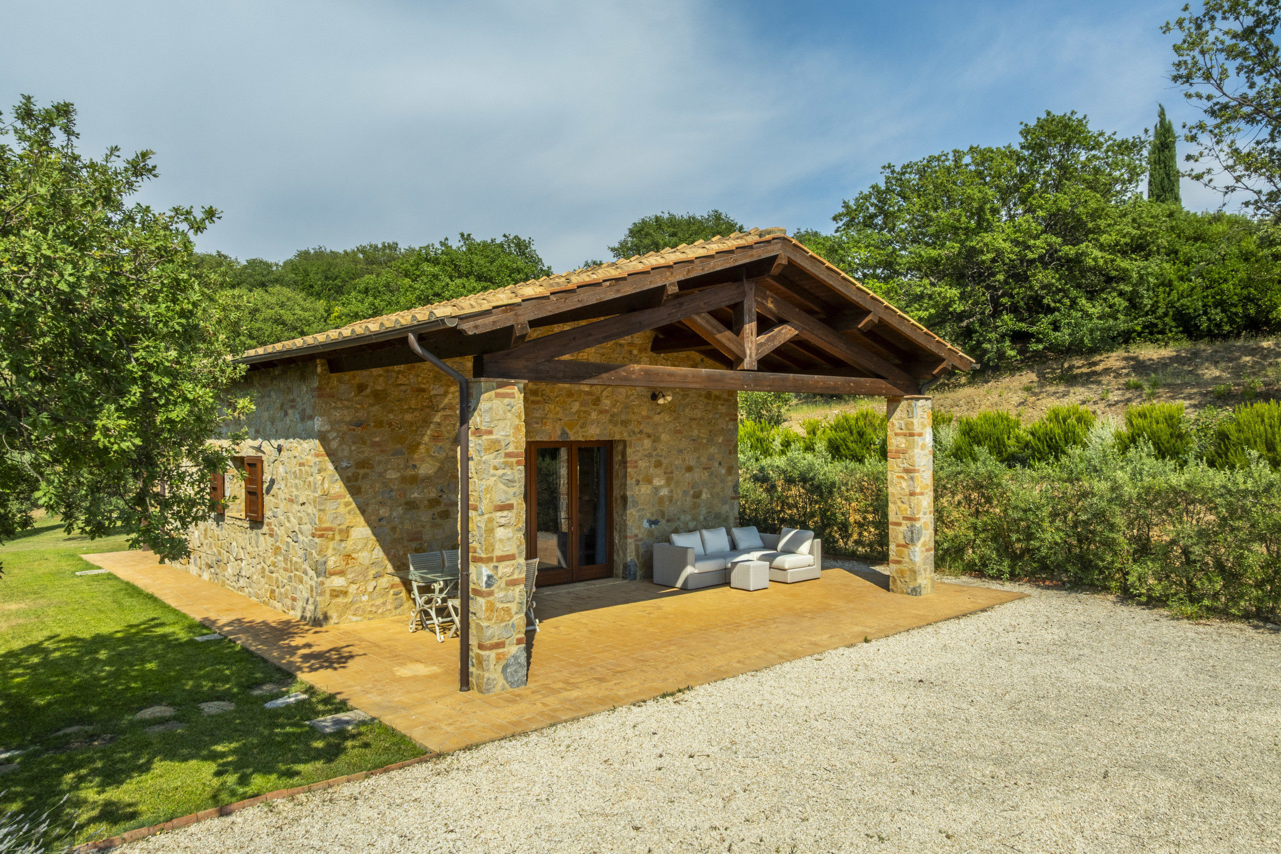 Not far away stands the two-storey annex, with a porch, private garden, living room, kitchen, bedroom, and bathroom, built with traditional Tuscan materials. The buildings are harmoniously distributed.