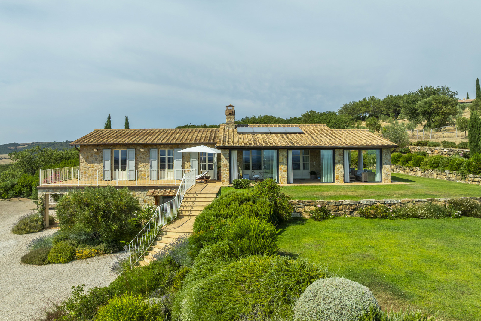 A dirt road leads to the main stone villa, located in a dominant position on a hill and surrounded by beautiful gardens with aromatic and flowering plants from which there is a unique view.