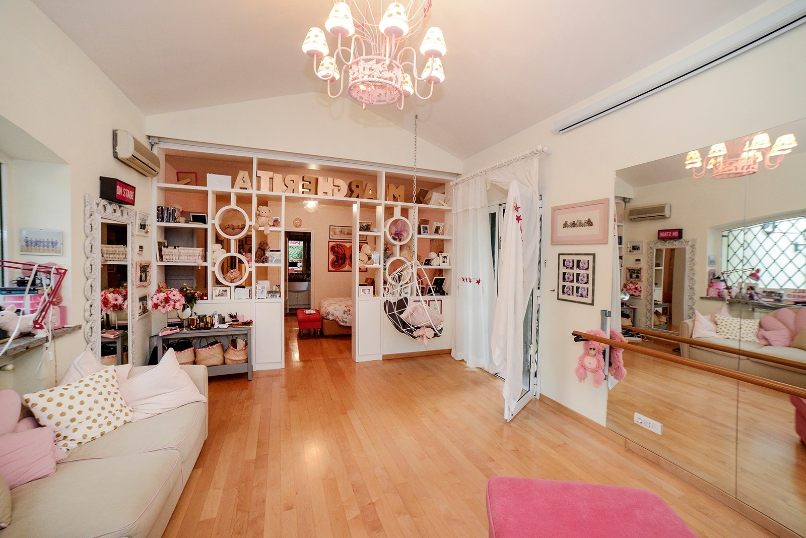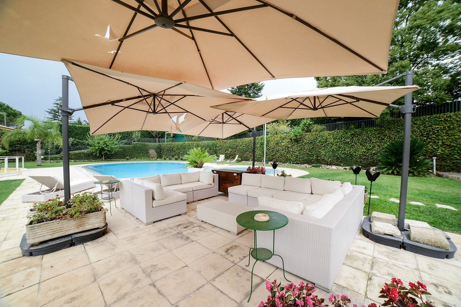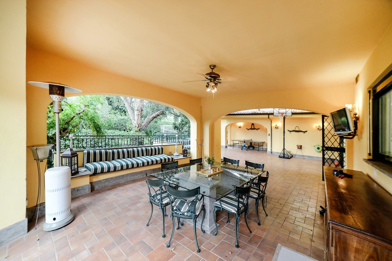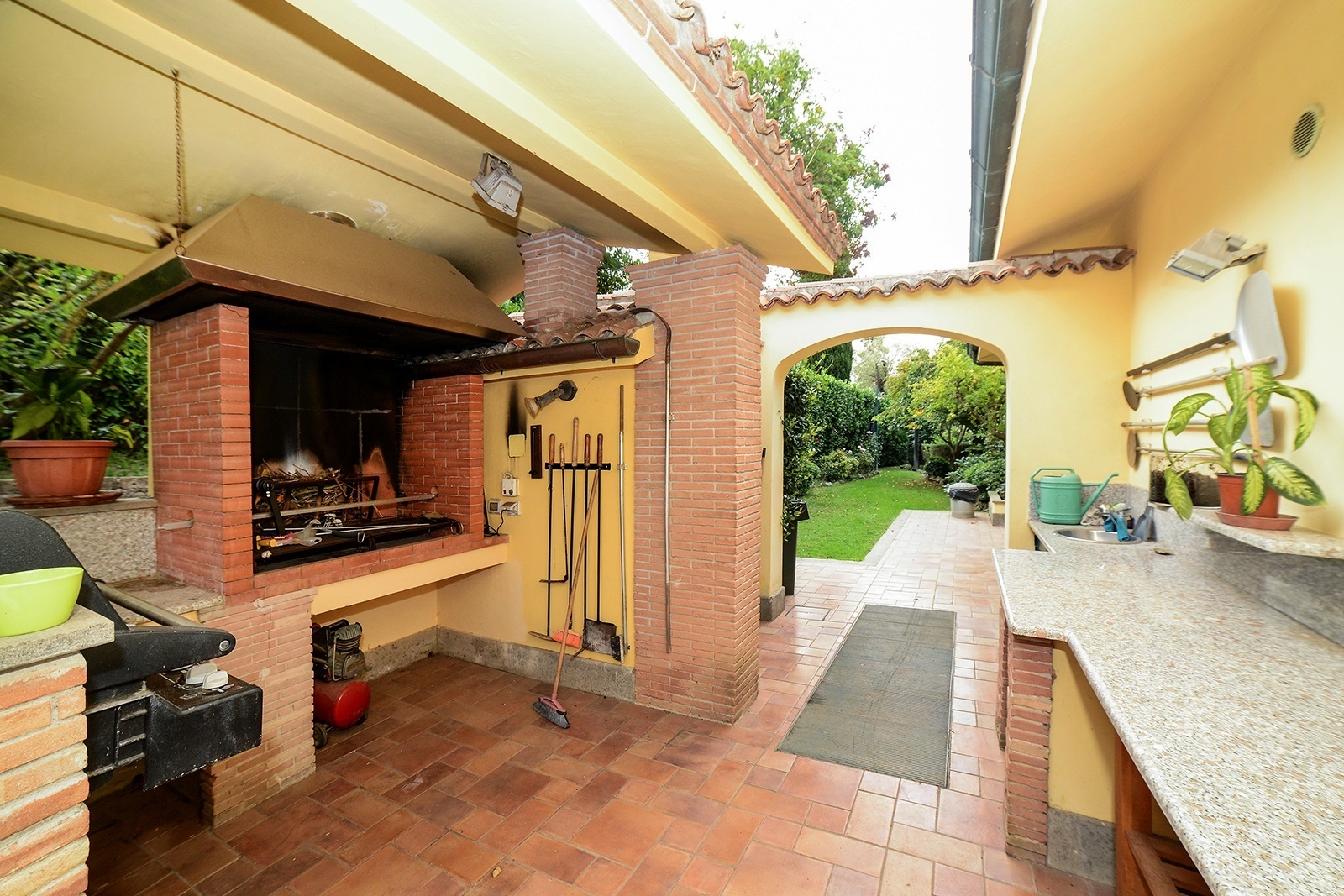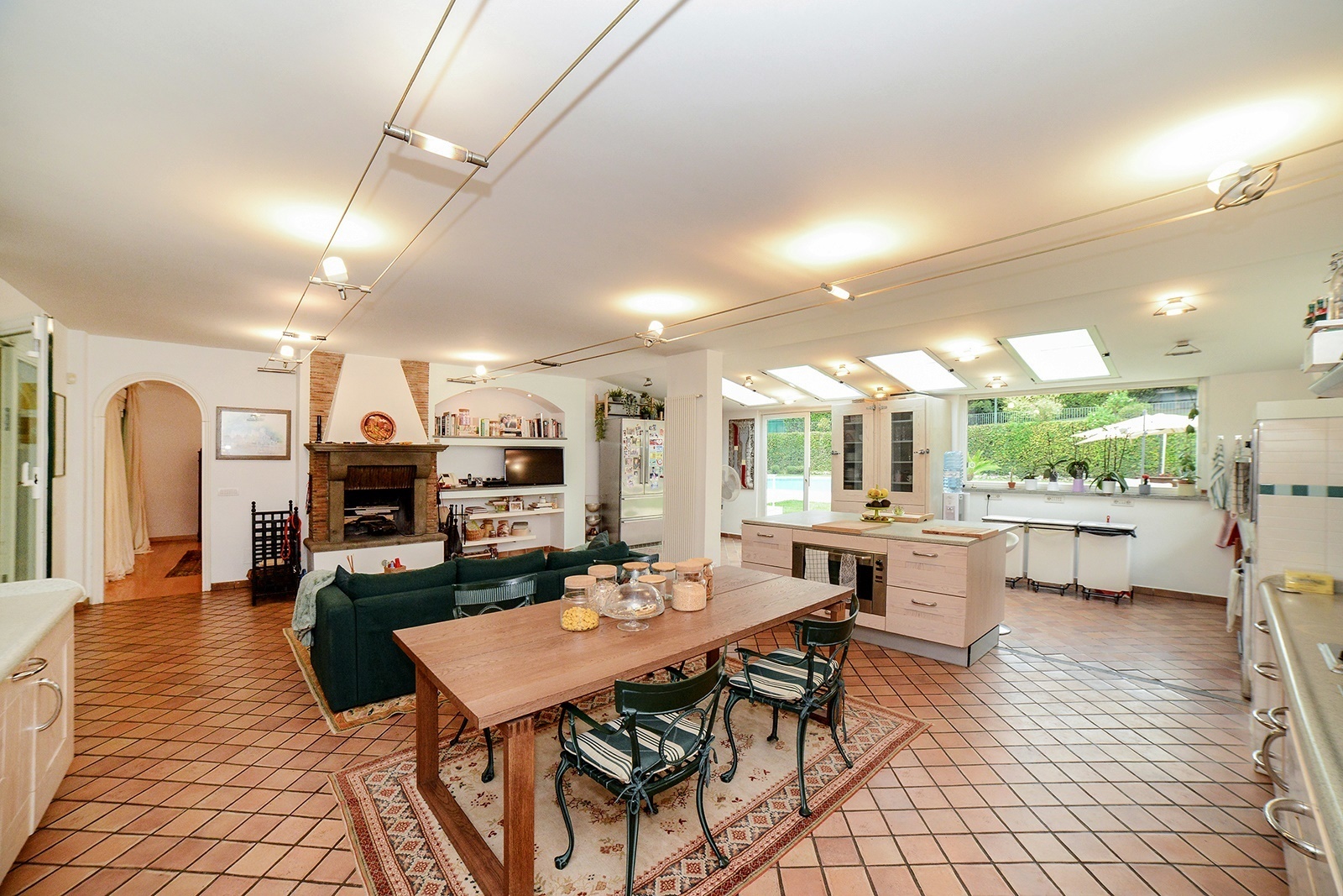 The large and bright kitchen with fireplace and dining table for 8 people, is characterized by two French windows which give access to the two external areas of the house: on one side it leads to the patio that can accommodate 2 dining tables for 20 people, as well as a ping pong area and on the other side to the exclusive swimming pool, which has a large area furnished with umbrellas and sofas for relaxing. It would be easy to set up an outdoor bar next to the pool.