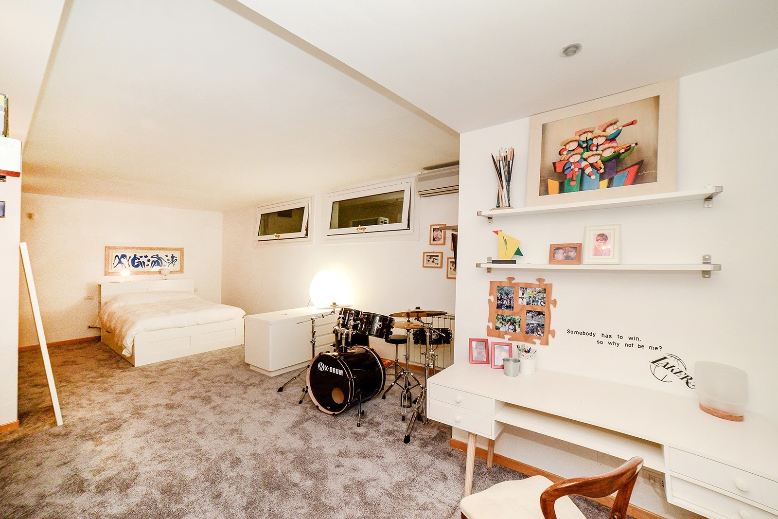 Downstairs there is a hobby room furnished with billiards and another room furnished with comfortable sofas partially divided by a fireplace.