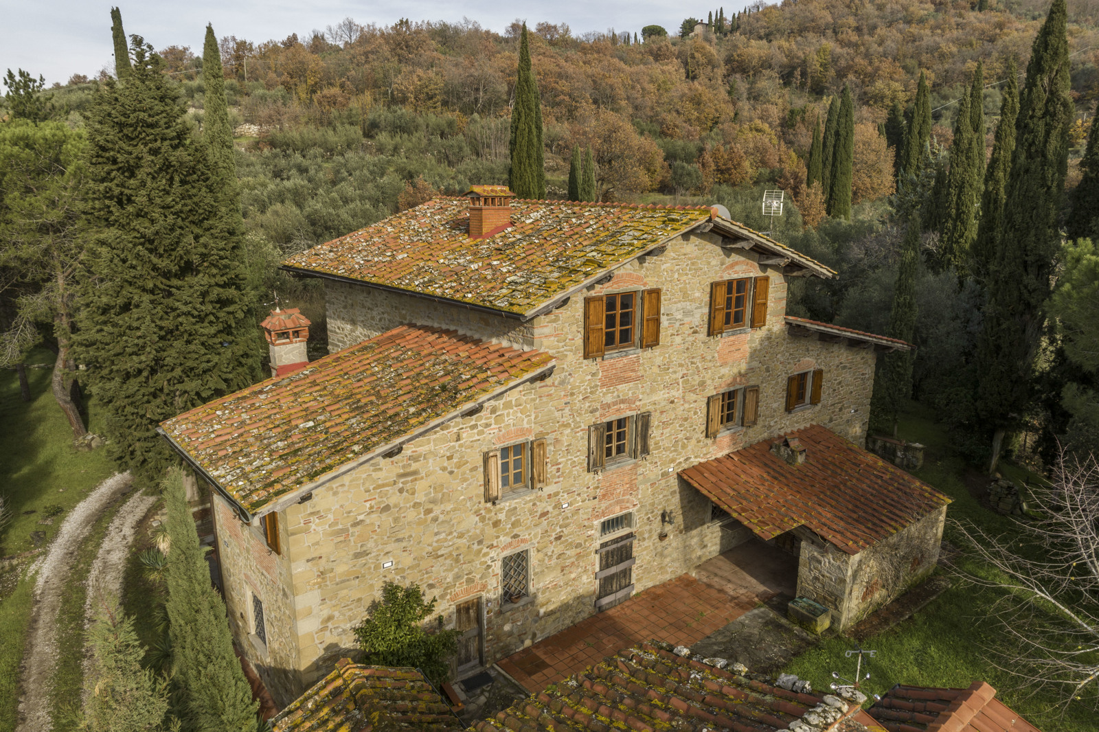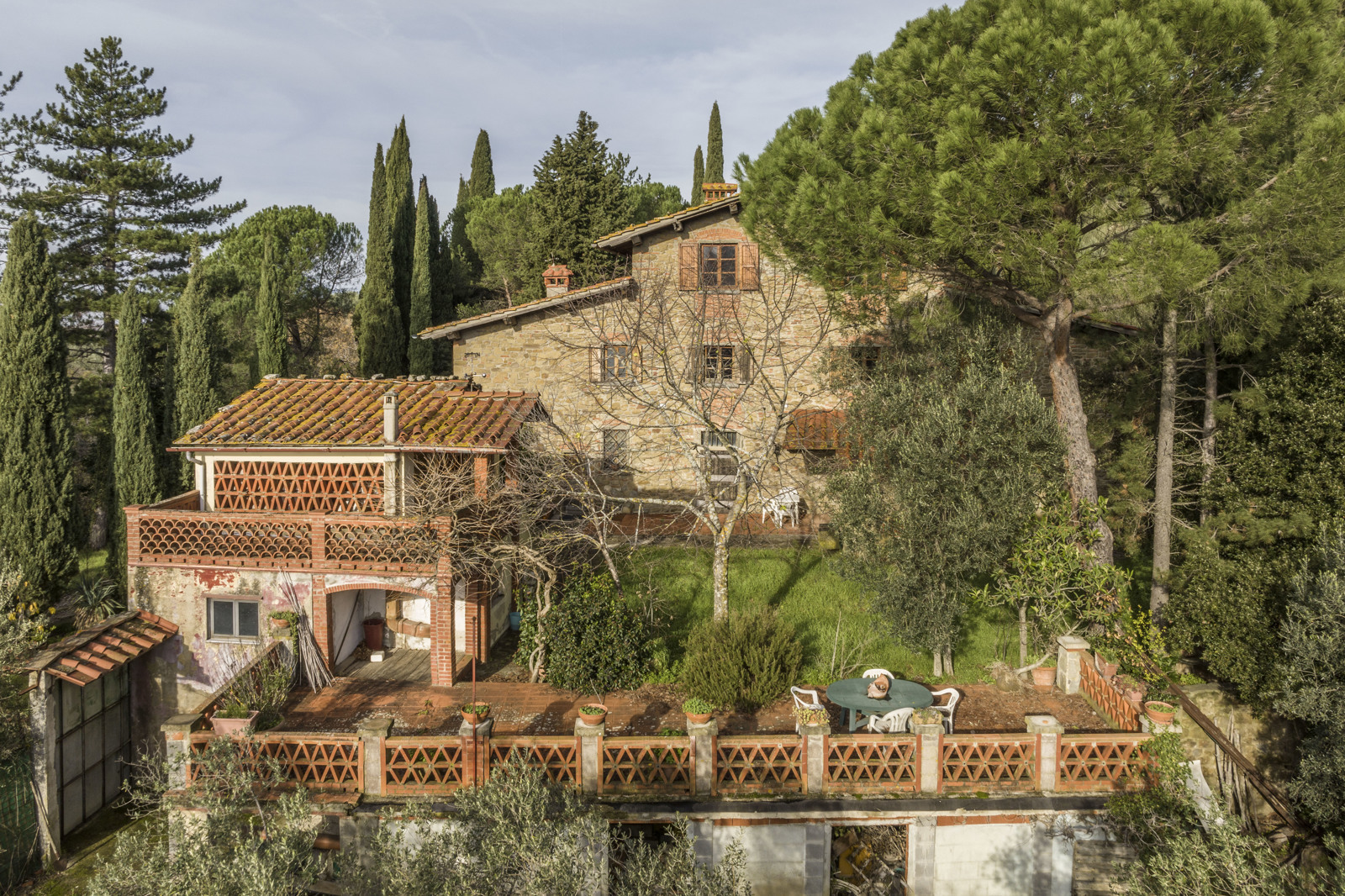Typical Tuscan farmhouse complex of about 560 sqm total with land of about 6 hectares and wonderful panoramic terrace overlooking the Tuscan countryside, surrounded by greenery in a beautiful location in Reggello, near Florence.