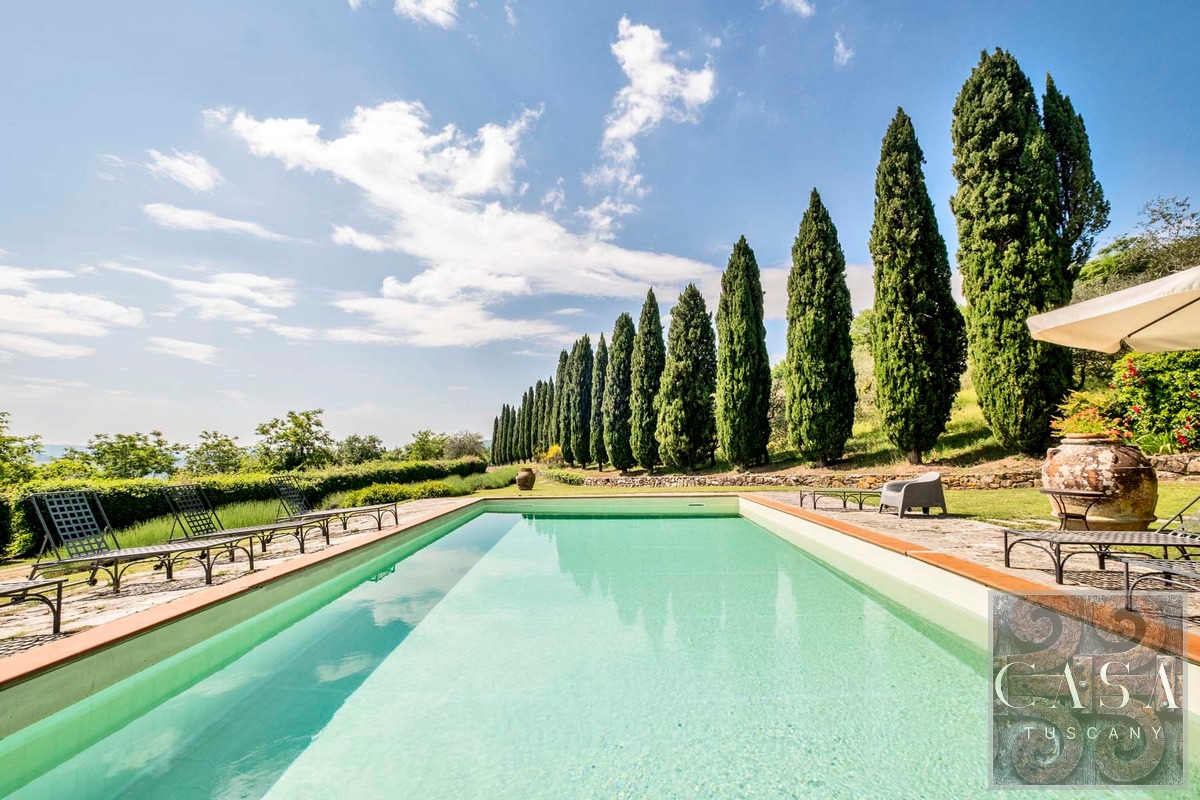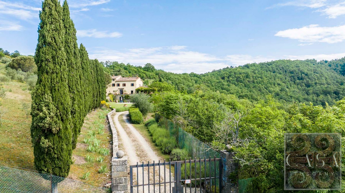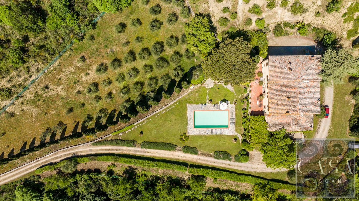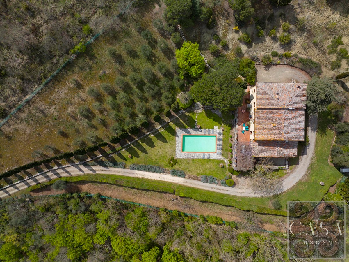 Surrounded by around 3.5 hectares of land including olive groves, this very private property looks over its beautiful swimming pool, down its cypress-lined driveway and on southwards over woods and hills.