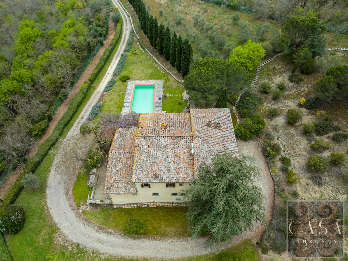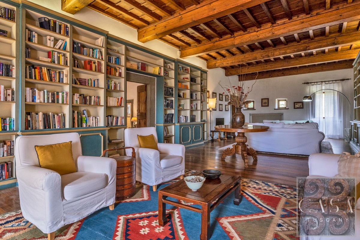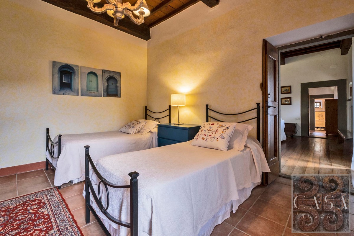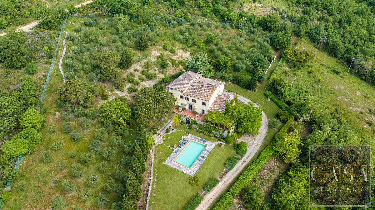 Surrounded by around 3.5 hectares of land including olive groves, this very private property looks over its beautiful swimming pool, down its cypress-lined driveway and on southwards over woods and hills.