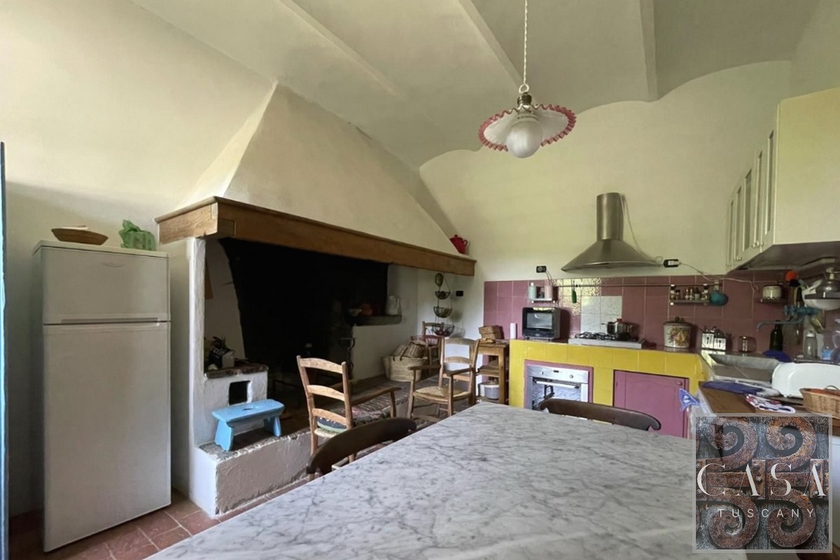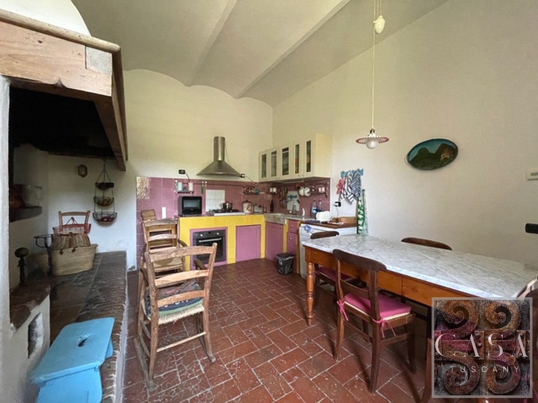 You enter the house through the main front door to find the original kitchen with open hearth and bread oven, an adjacent dining room/study, a guest bathroom with shower and laundry area and a large living room with fireplace that is potentially an independent apartment with a kitchenette and bathroom with shower.