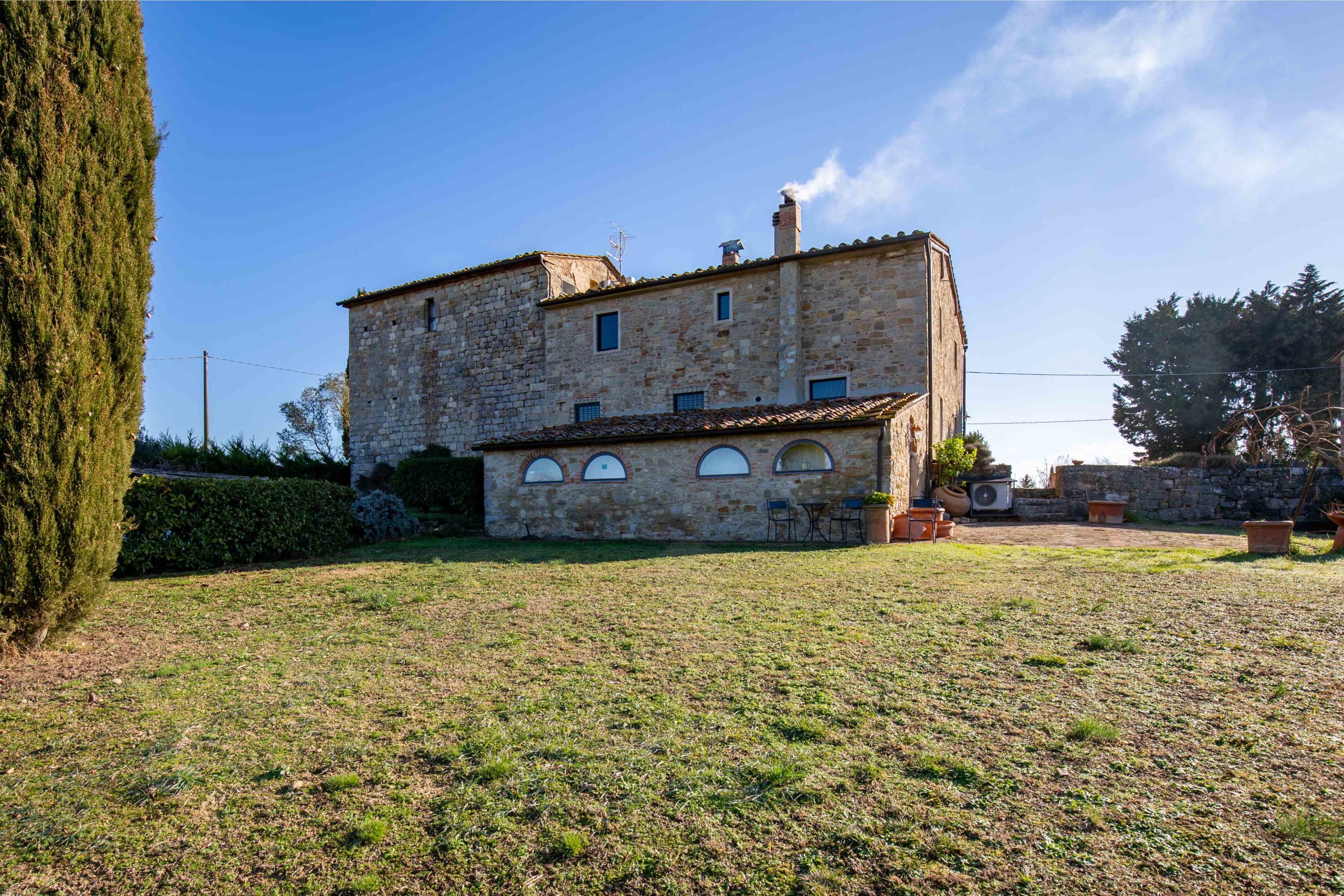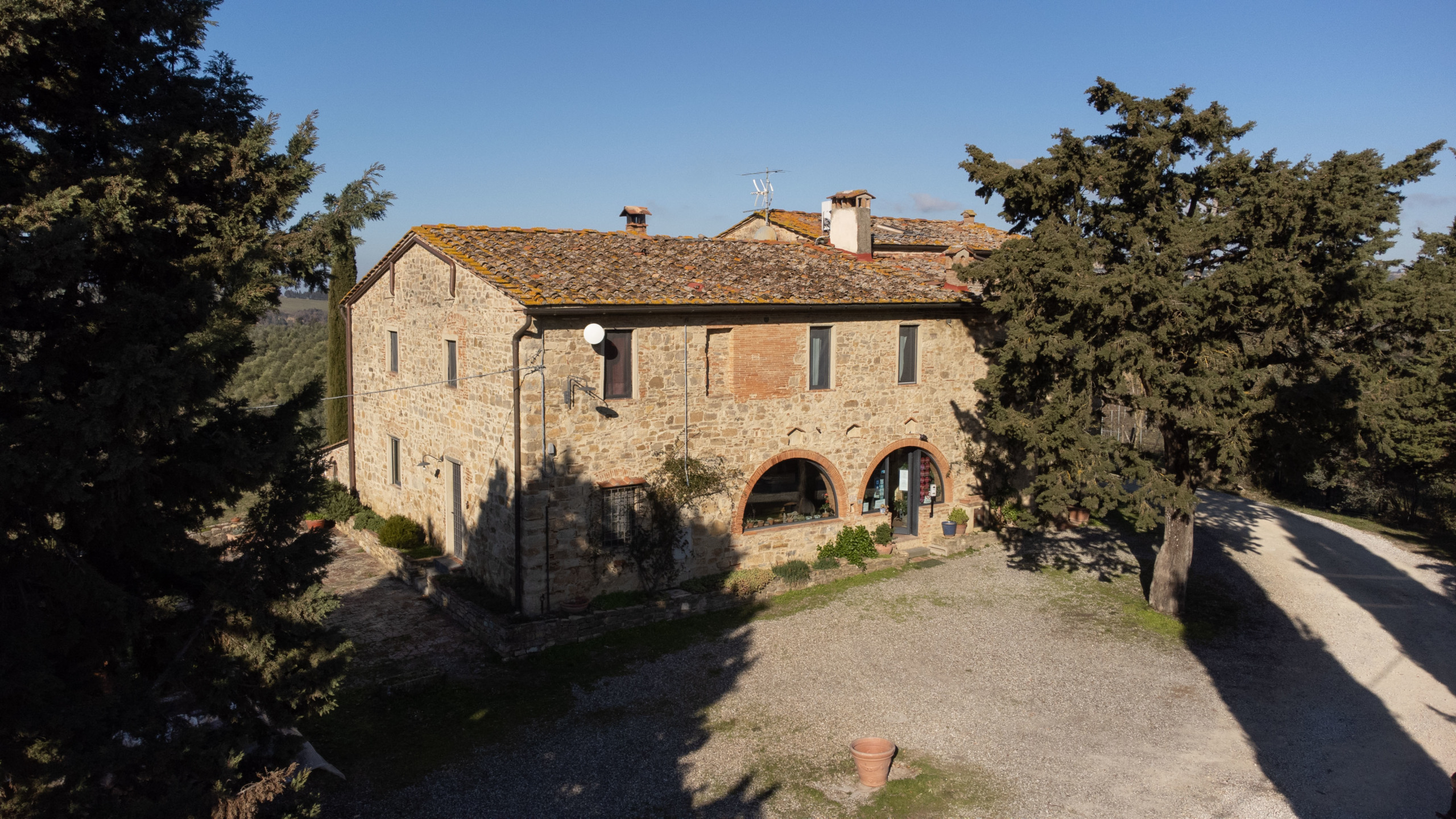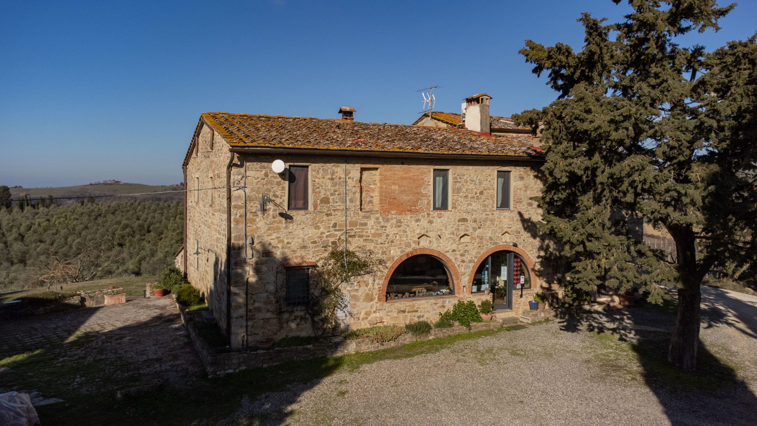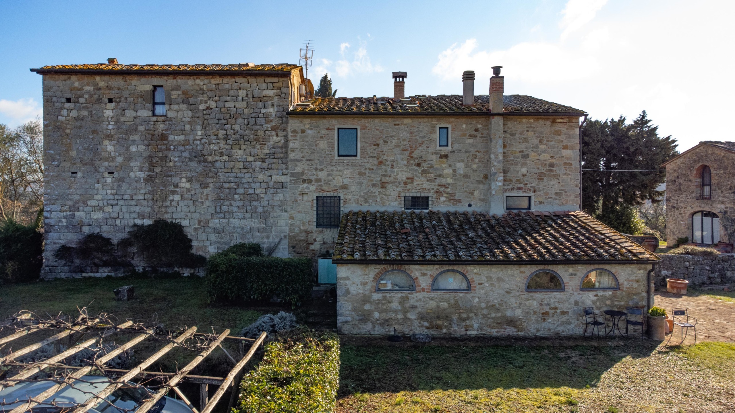 In a context of rolling hills planted with olive trees and vines, in a dominant position, this beautiful stone farmhouse of about 500 square metres has an ancient tower of Lombard origin, and is surrounded by private land of about 9000 square metres of land with olives which produce an excellent Tuscan oil.