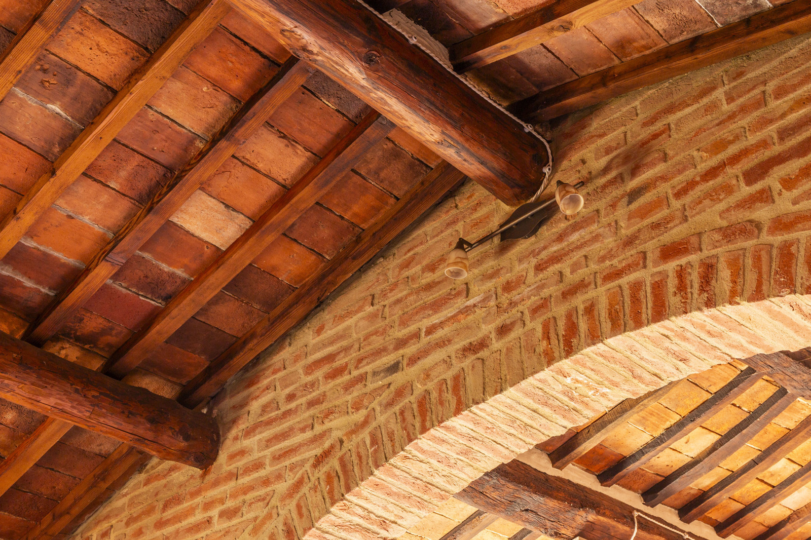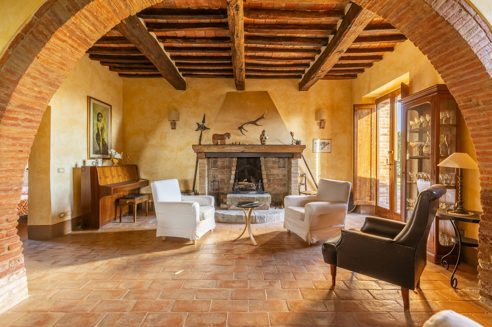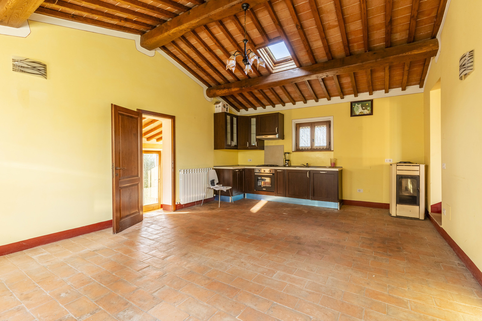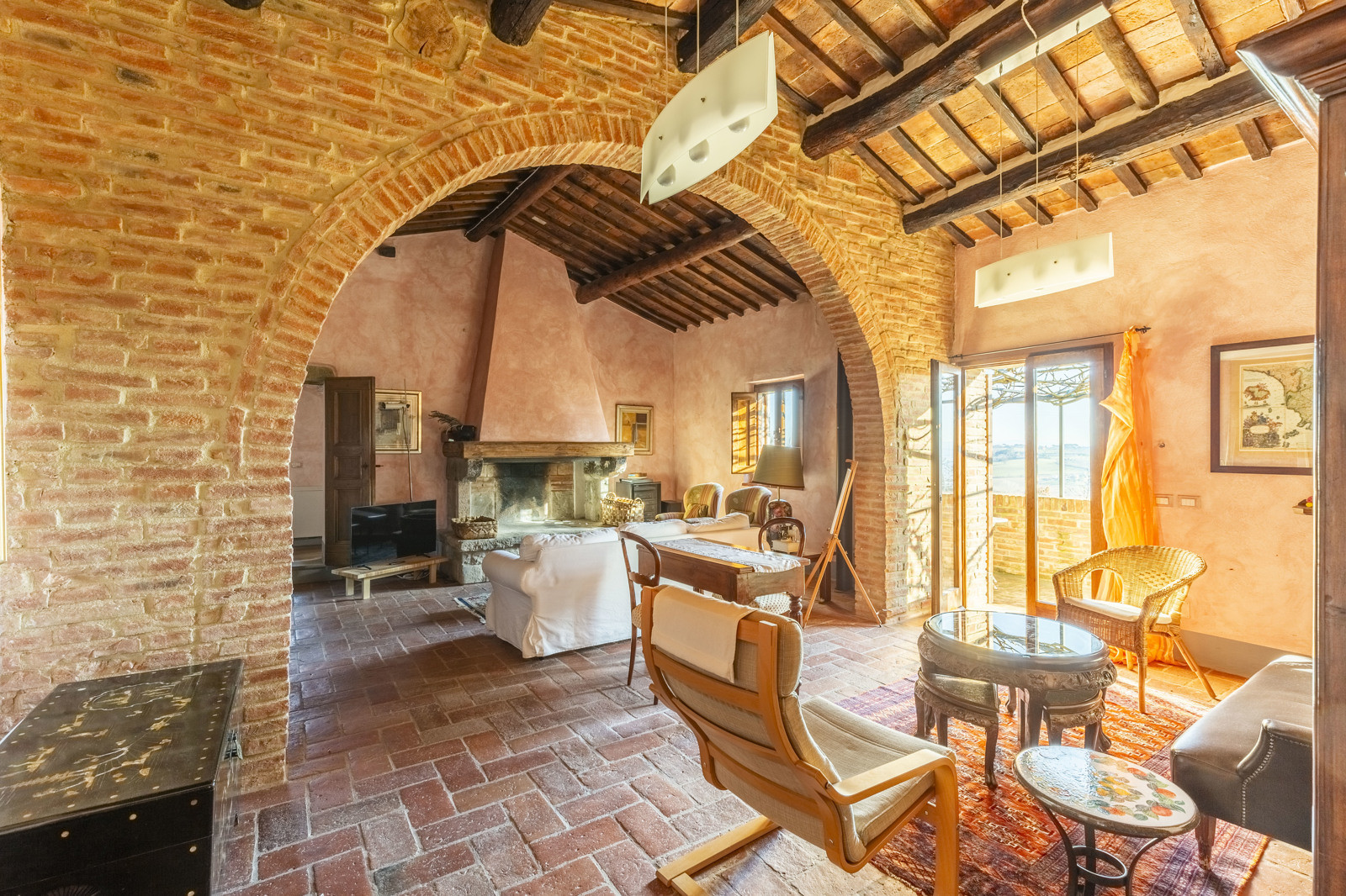 The property is in excellent condition, renovated about 15 years ago. It has valuable original materials such as antique terracotta for the floors (parquet in the sleeping area), exposed wooden beams with terracotta tiles for the ceilings. The exterior is in stone and red brick.