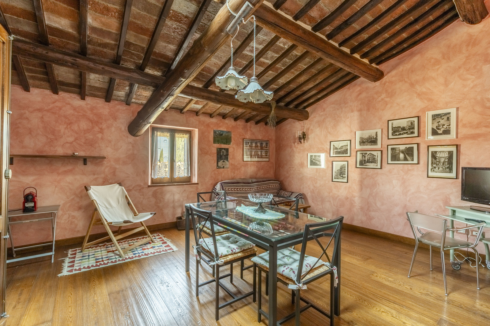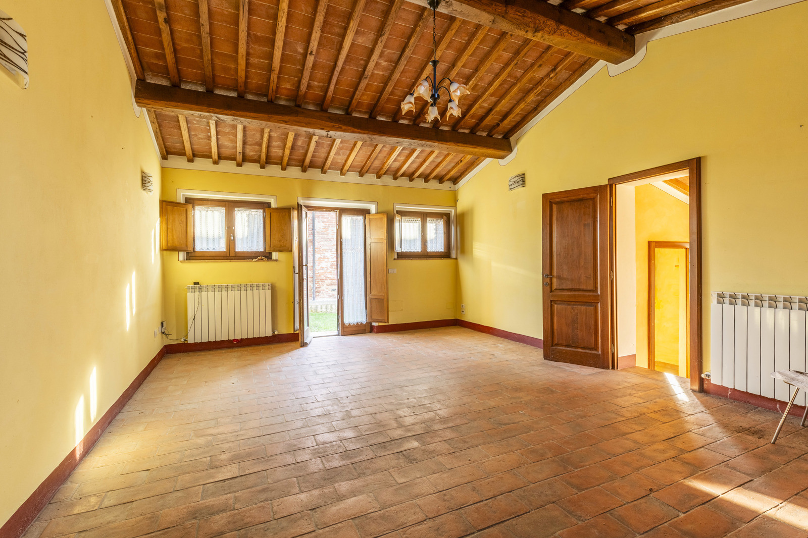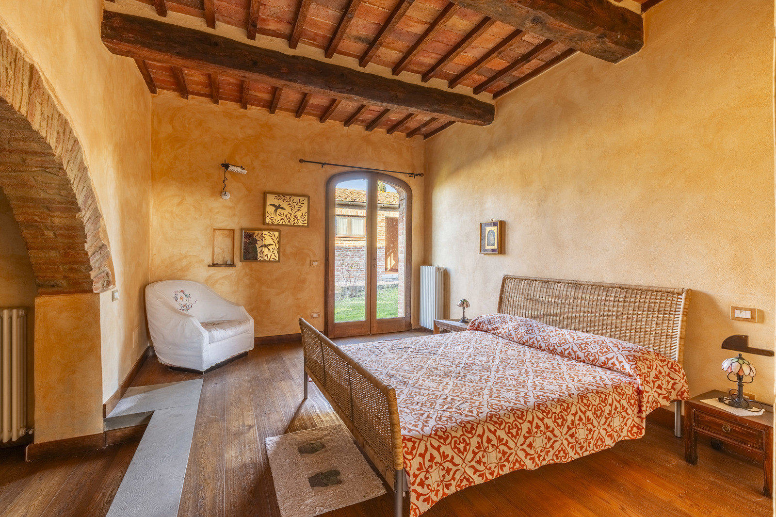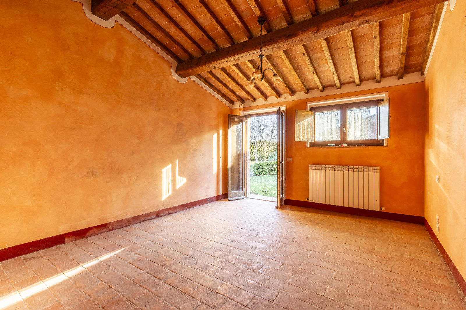 The property is in excellent condition, renovated about 15 years ago. It has valuable original materials such as antique terracotta for the floors (parquet in the sleeping area), exposed wooden beams with terracotta tiles for the ceilings. The exterior is in stone and red brick.