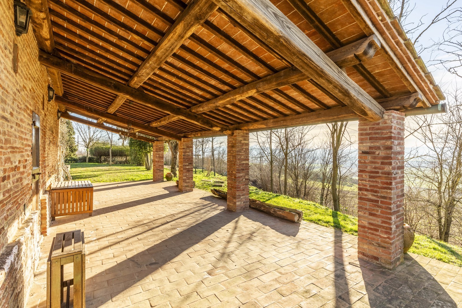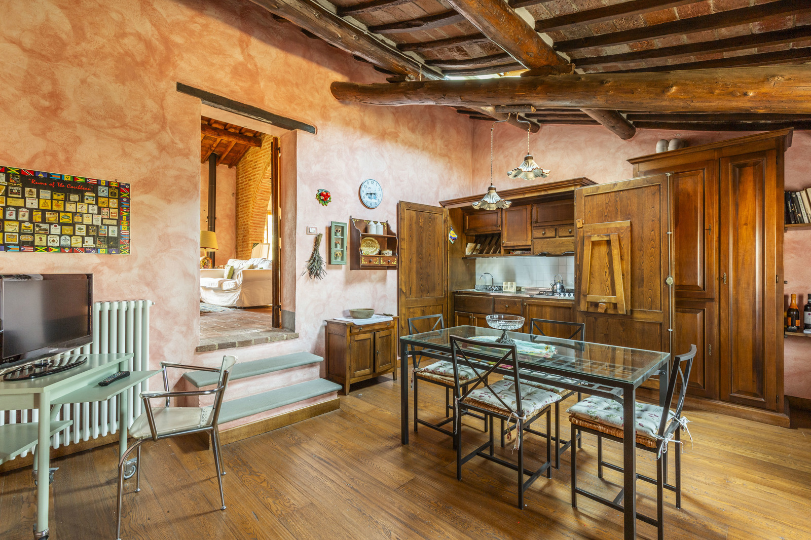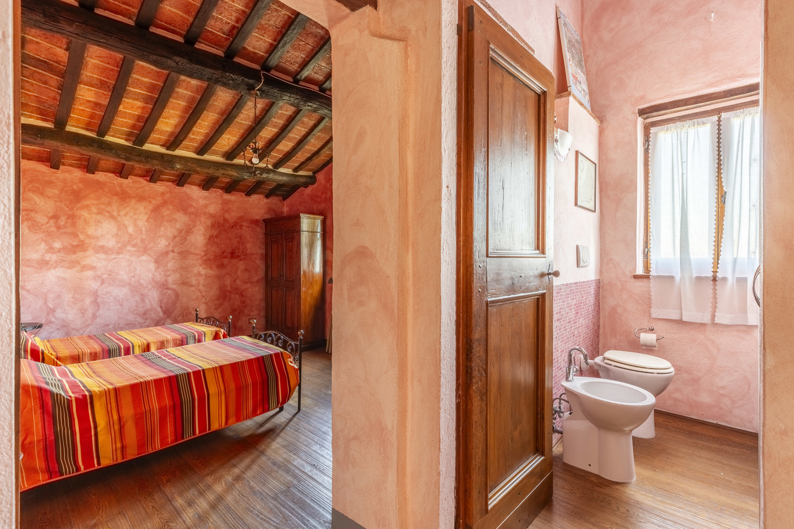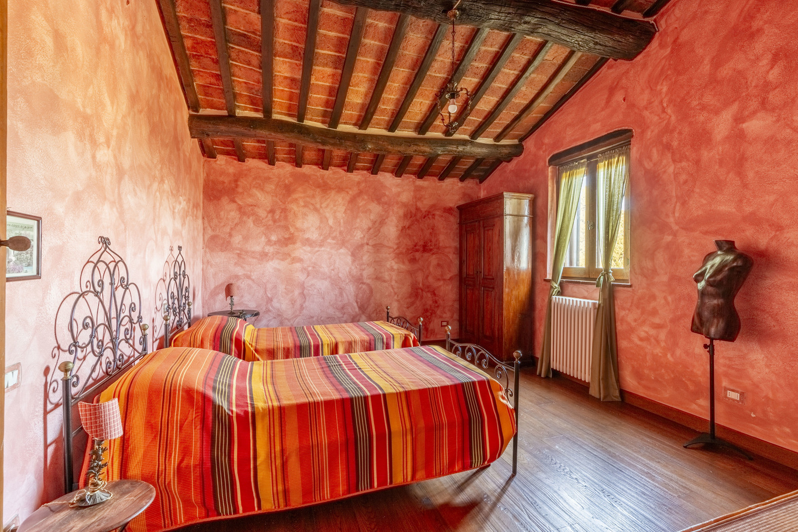 The property is in excellent condition, renovated about 15 years ago. It has valuable original materials such as antique terracotta for the floors (parquet in the sleeping area), exposed wooden beams with terracotta tiles for the ceilings. The exterior is in stone and red brick.
