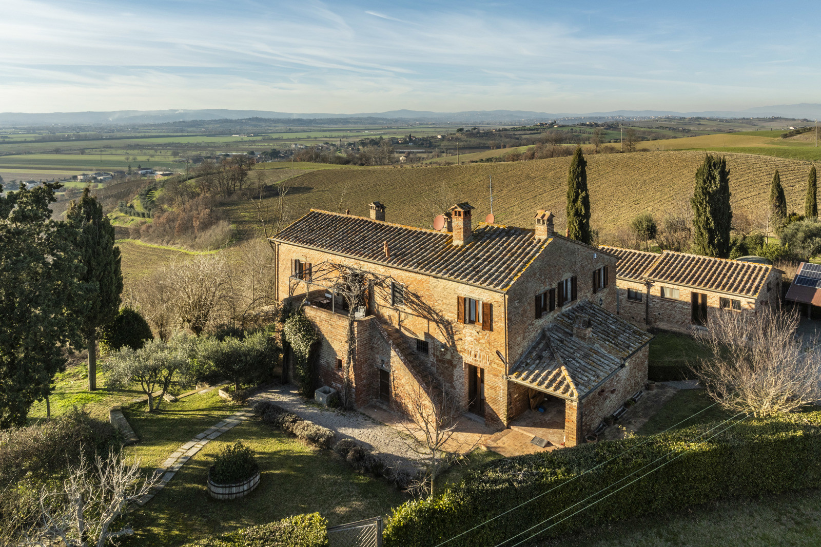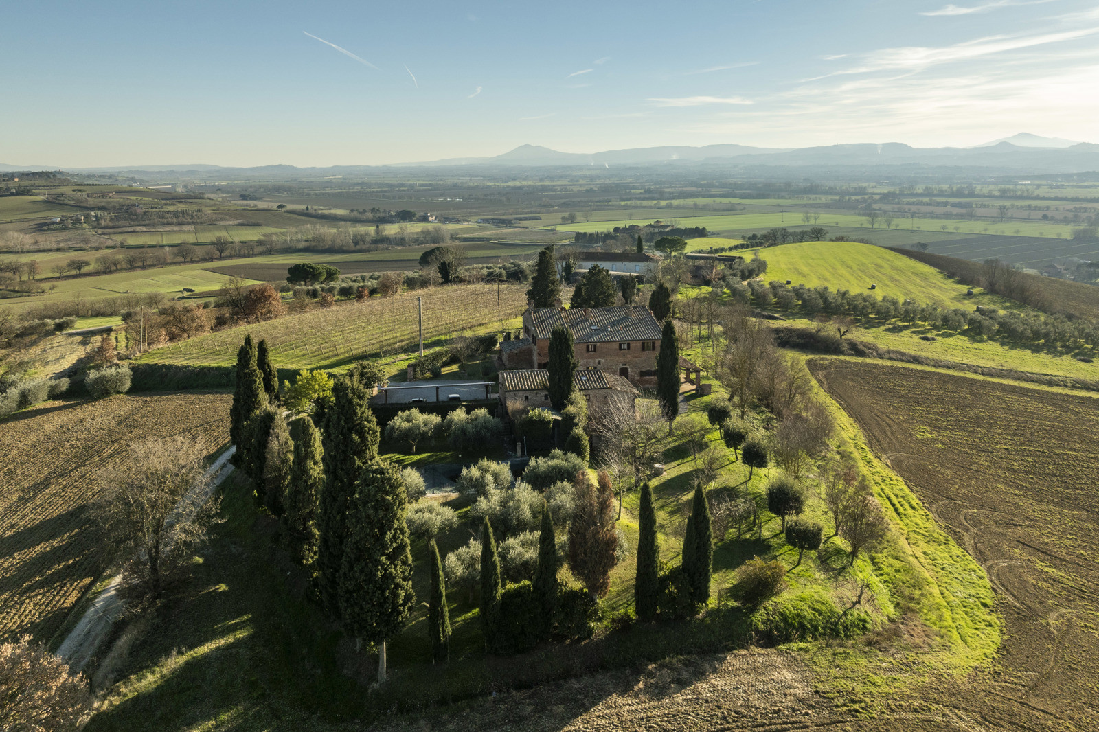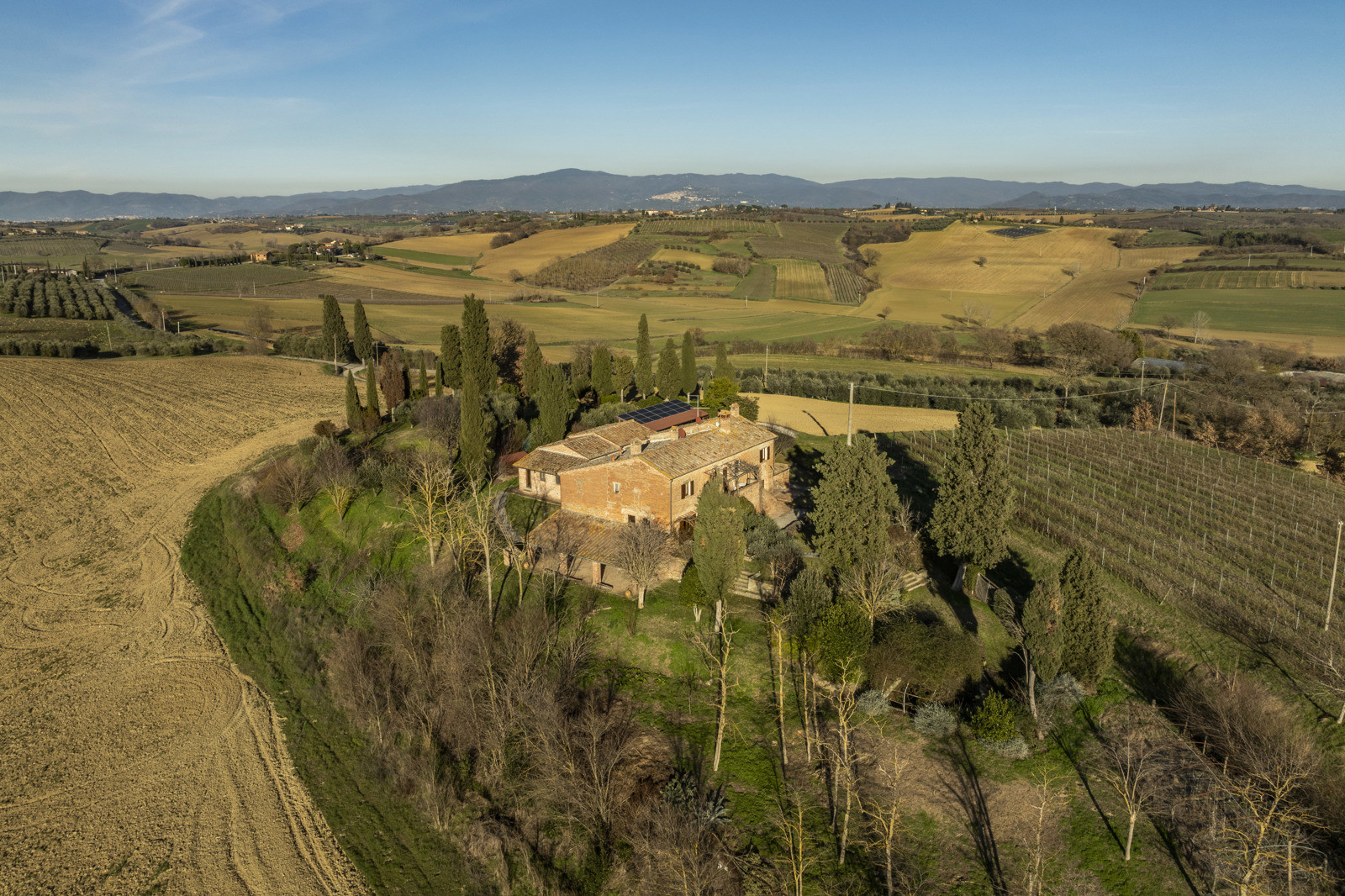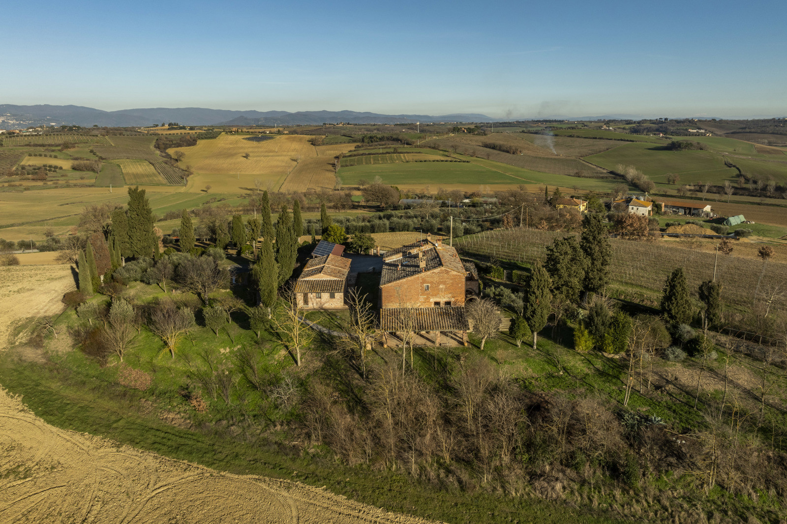 In the beautiful hills of Tuscany, in a quiet and dominant position with a 360-degree view, the farmhouse is inserted in the unique context of the Val di Chiana that offers unique possibilities in terms of tourism, food and wine and landscape, very close to highway connections to Arezzo, Florence and Rome and direct links to Siena and Perugia. Located about 15 km from the historic center of Cortona, the farmhouse is 10/15 from the train station and school services, supermarkets and sports facilities. Major tourist centers in the area such as Montepulciano, Pienza, Asciano, Monticchiello and Lucignano are all within 40 km.