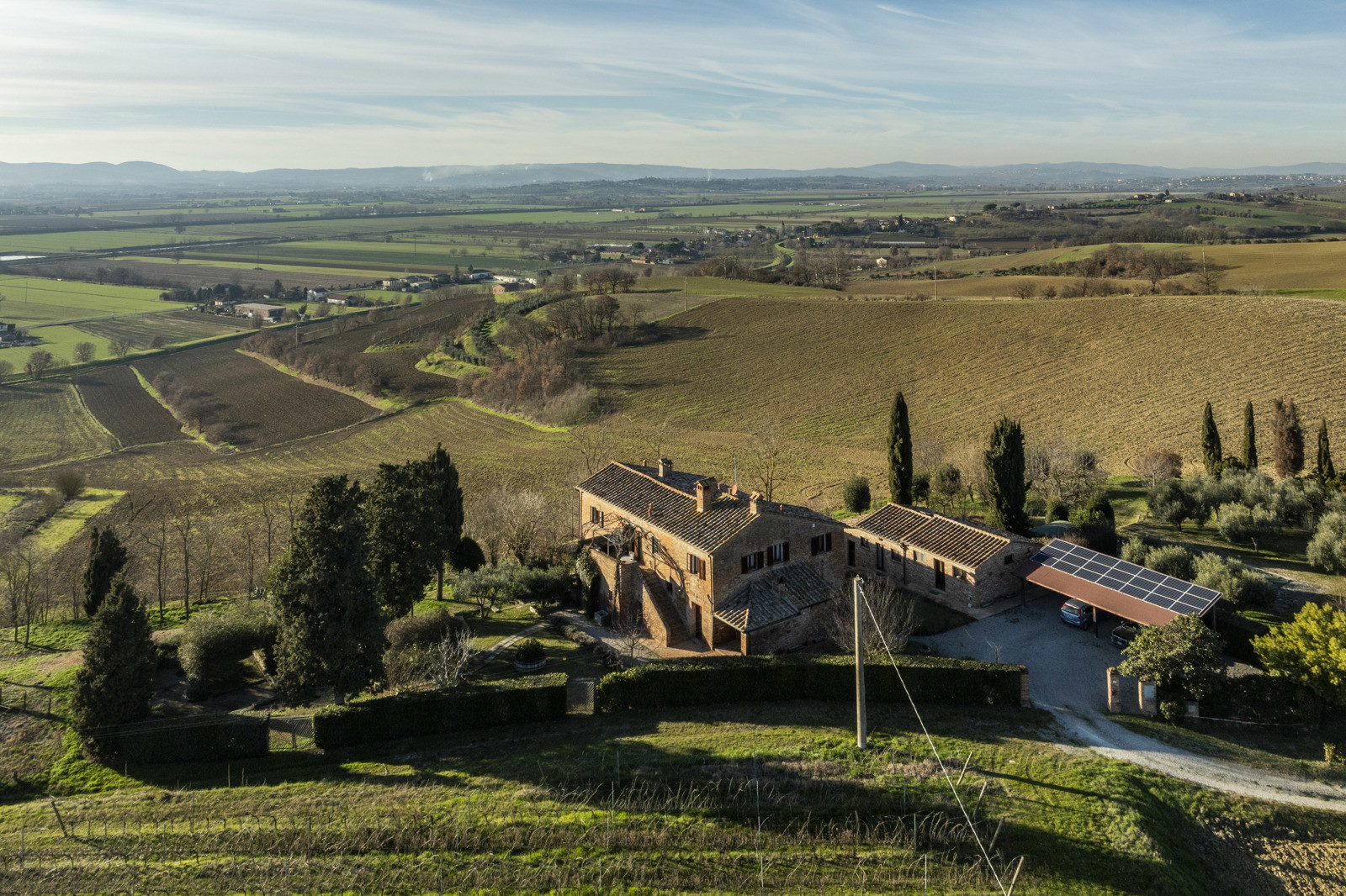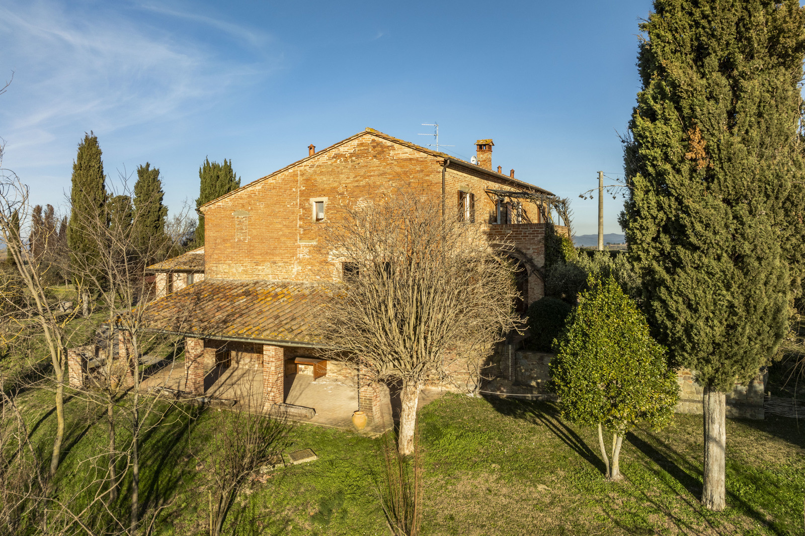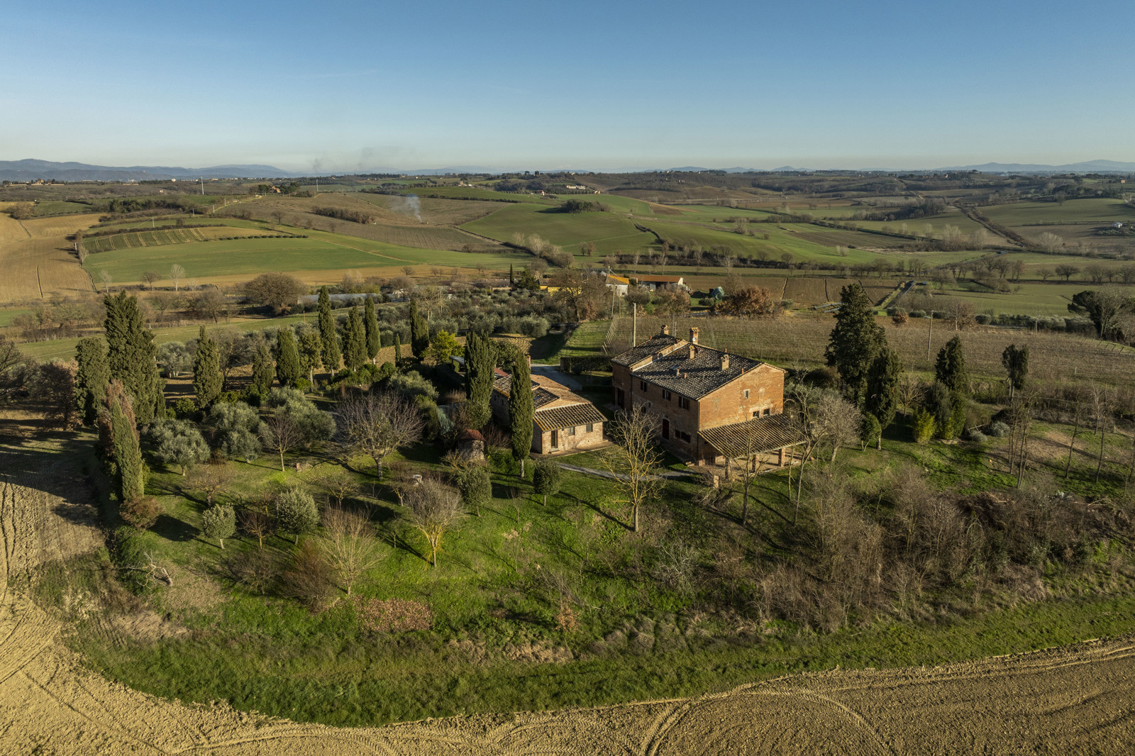 In the beautiful hills of Tuscany, in a quiet and dominant position with a 360-degree view, the farmhouse is inserted in the unique context of the Val di Chiana that offers unique possibilities in terms of tourism, food and wine and landscape, very close to highway connections to Arezzo, Florence and Rome and direct links to Siena and Perugia. Located about 15 km from the historic center of Cortona, the farmhouse is 10/15 from the train station and school services, supermarkets and sports facilities. Major tourist centers in the area such as Montepulciano, Pienza, Asciano, Monticchiello and Lucignano are all within 40 km.