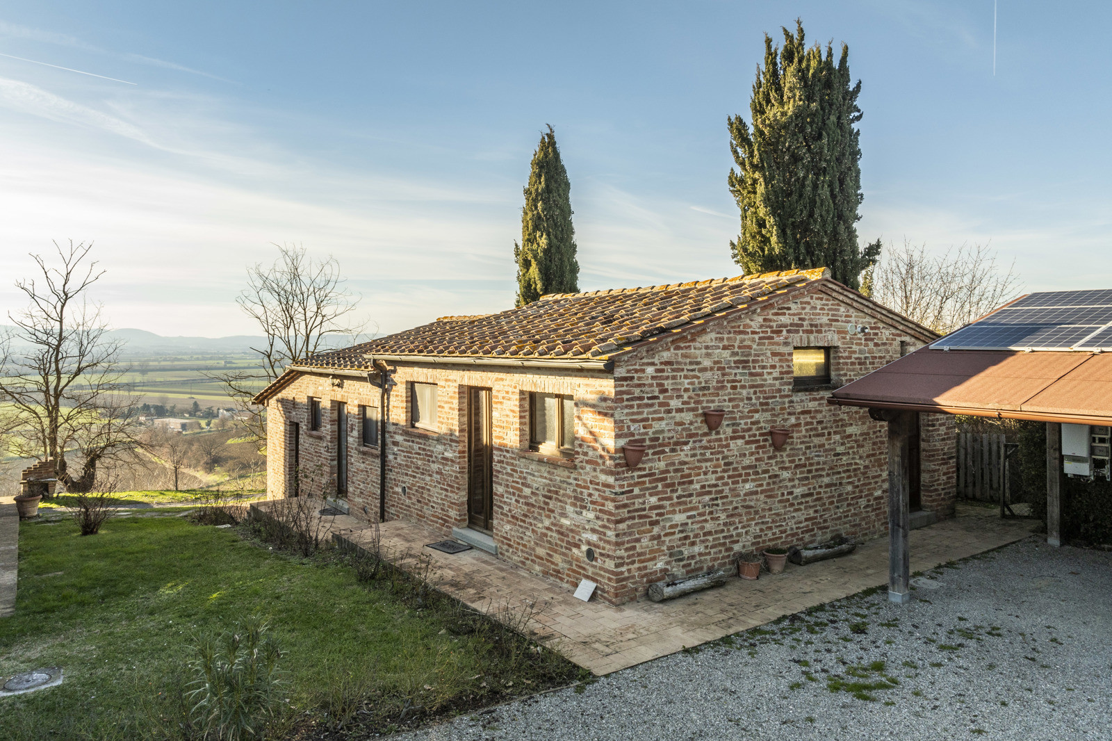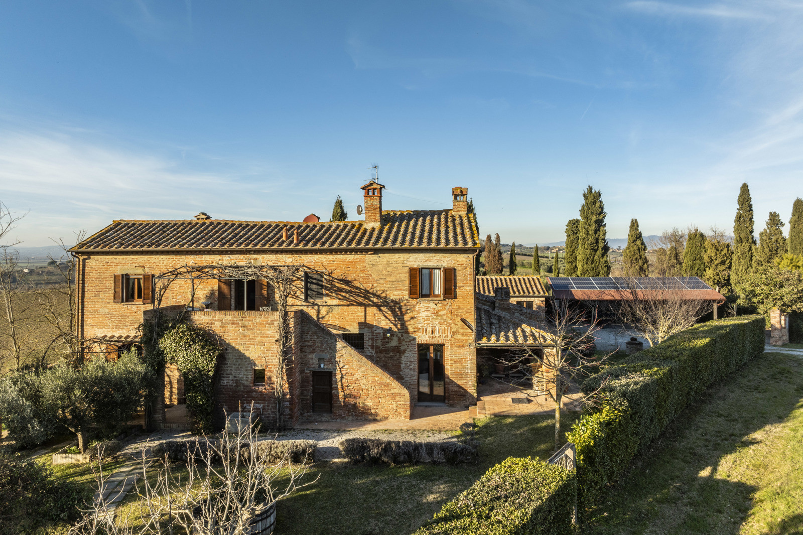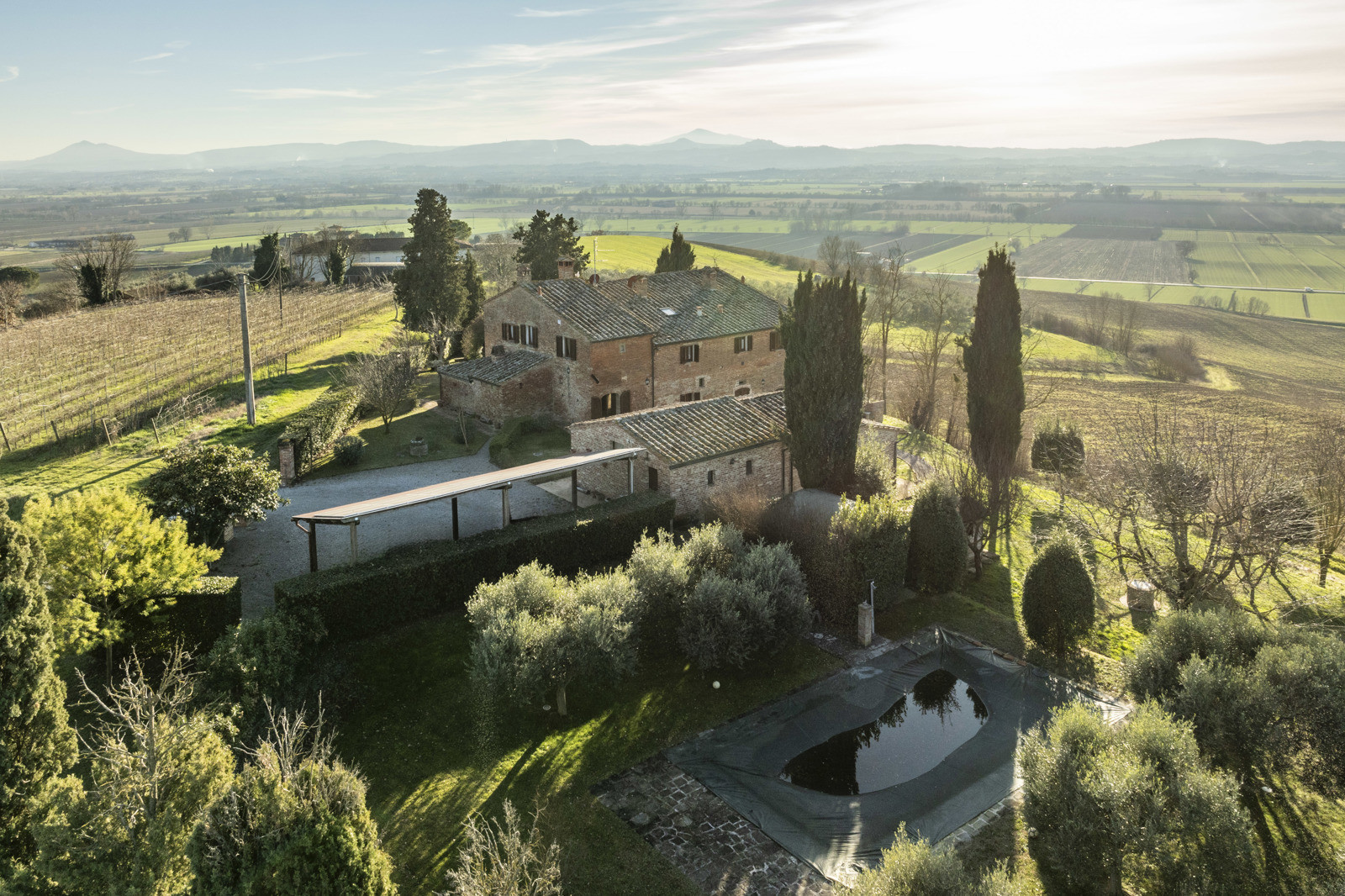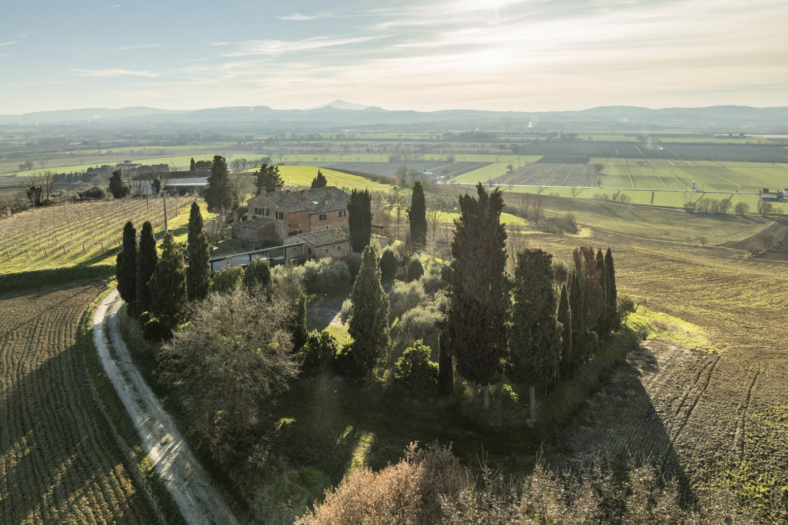 In the beautiful hills of Tuscany, in a quiet and dominant position with a 360-degree view, the farmhouse is inserted in the unique context of the Val di Chiana that offers unique possibilities in terms of tourism, food and wine and landscape, very close to highway connections to Arezzo, Florence and Rome and direct links to Siena and Perugia. Located about 15 km from the historic center of Cortona, the farmhouse is 10/15 from the train station and school services, supermarkets and sports facilities. Major tourist centers in the area such as Montepulciano, Pienza, Asciano, Monticchiello and Lucignano are all within 40 km.