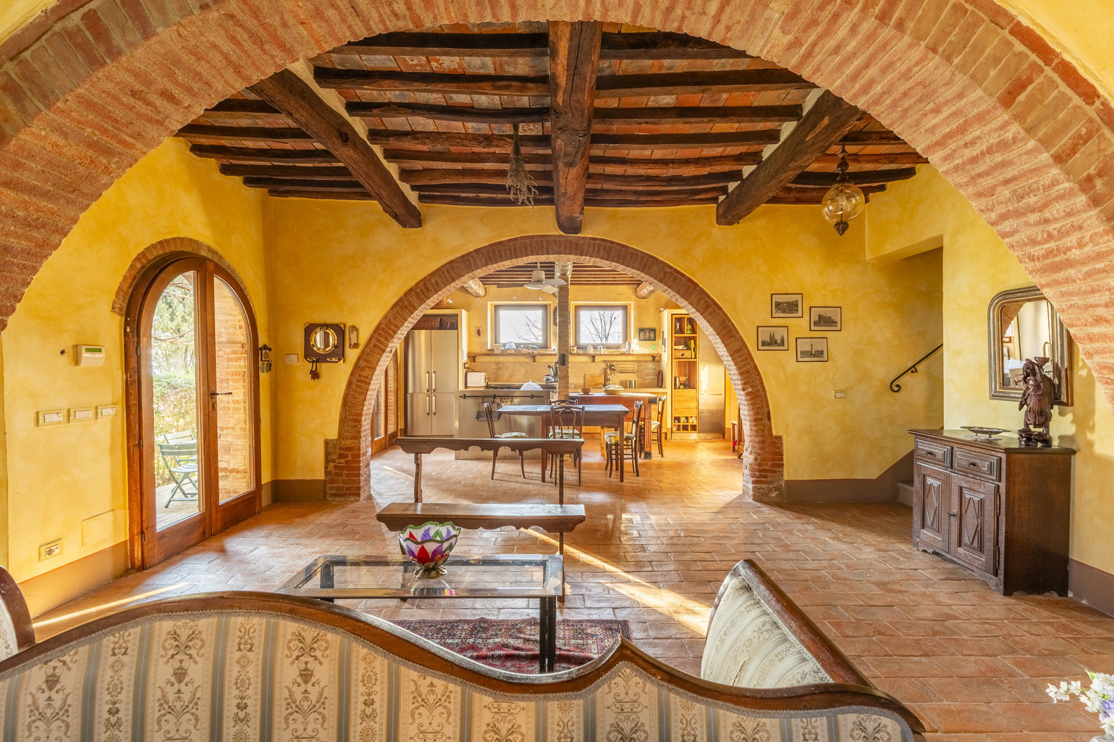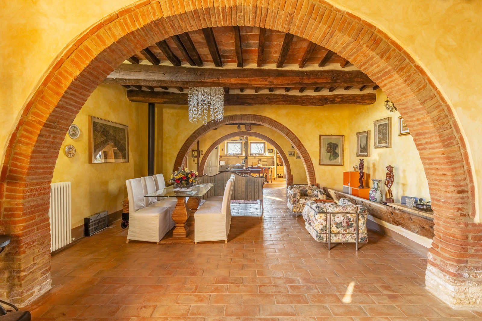 From the entrance you enter the spacious living area with arches and exposed beams connected to the dining area and a first open kitchen.