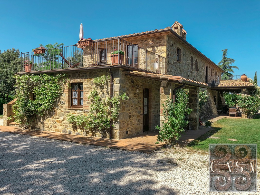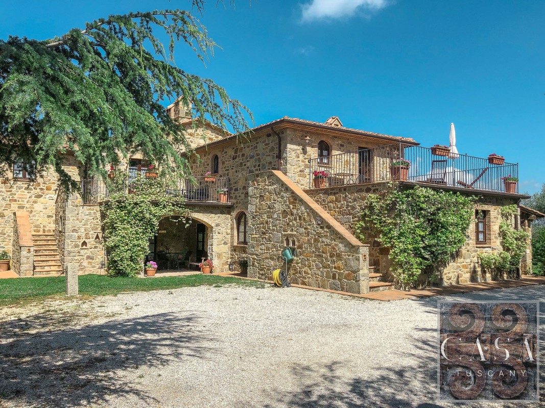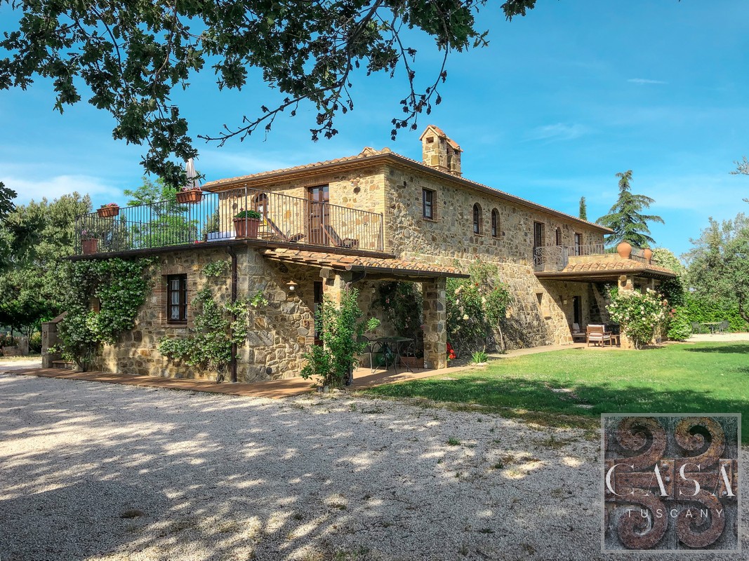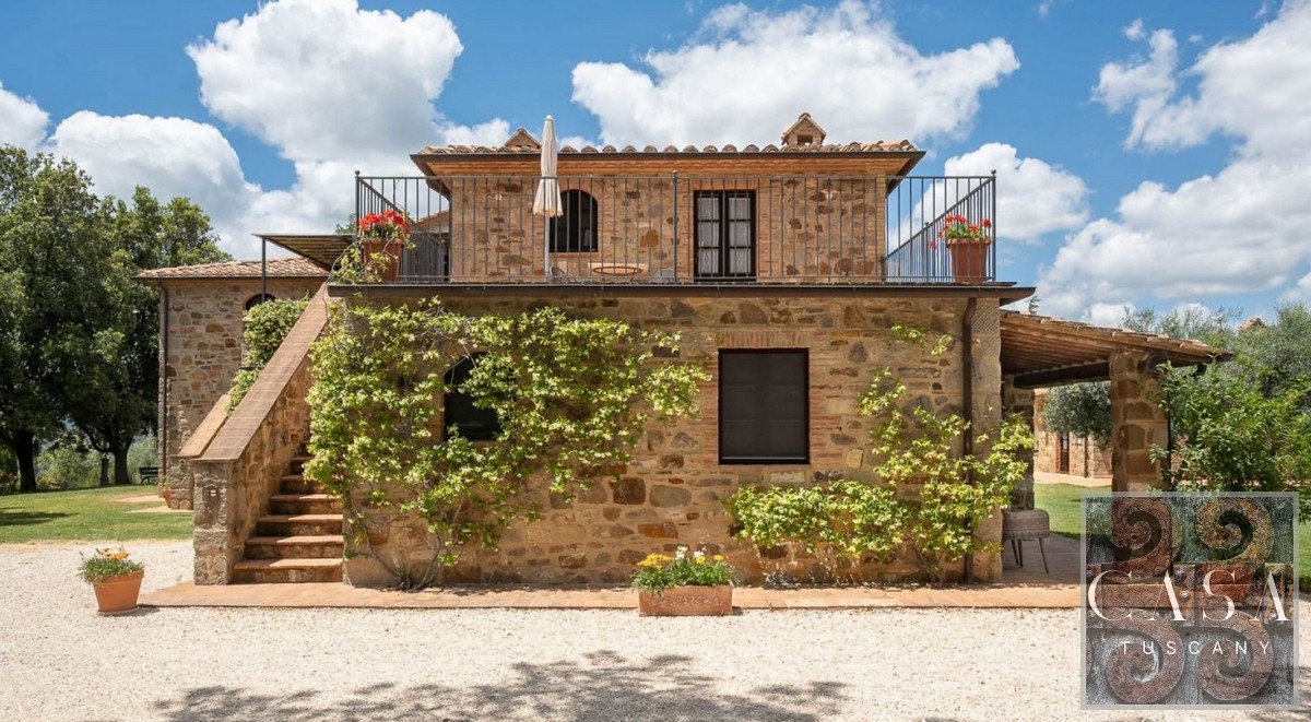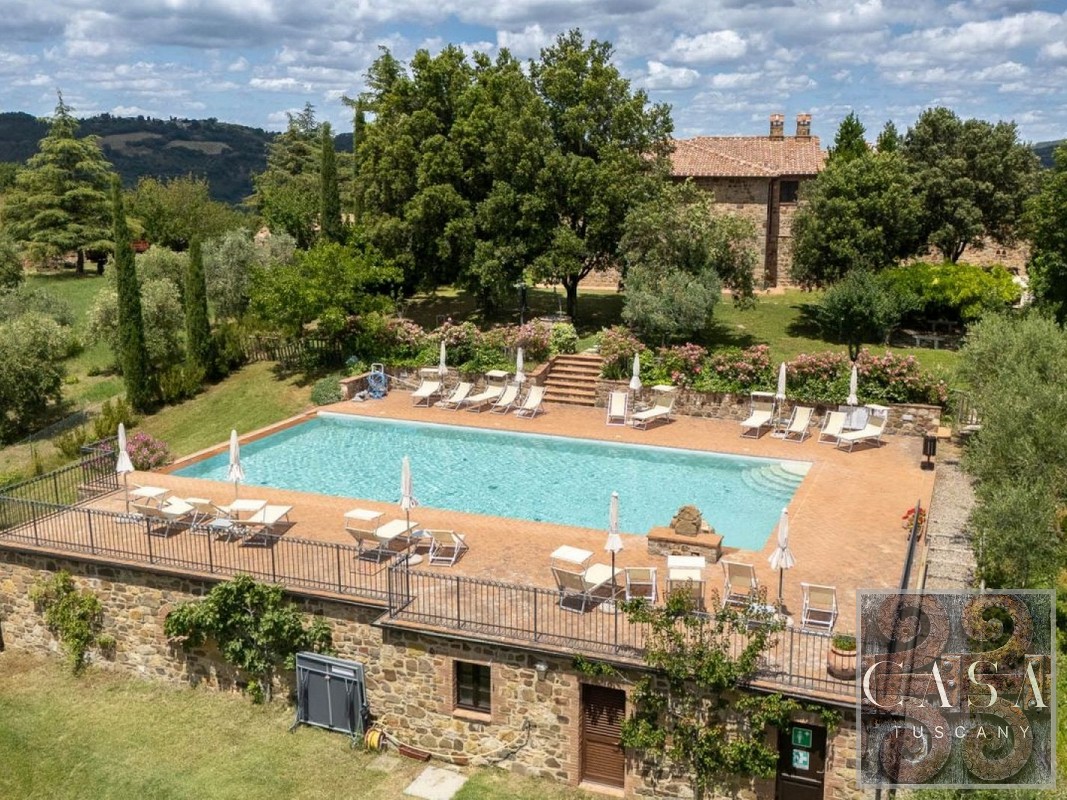Charming 16th-century stone farmhouse, elegantly restored and currently operating as an agriturismo with 6 apartments and a pool, for sale in Val d’Orcia, Tuscany.