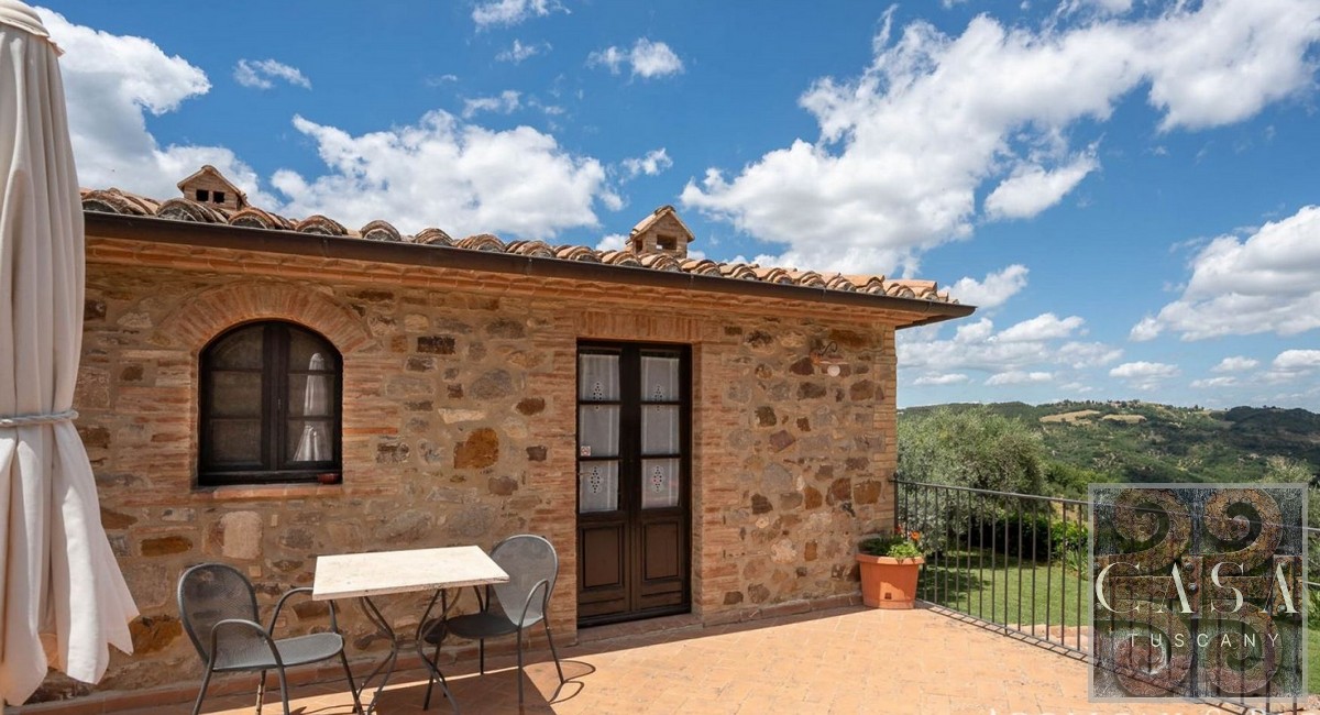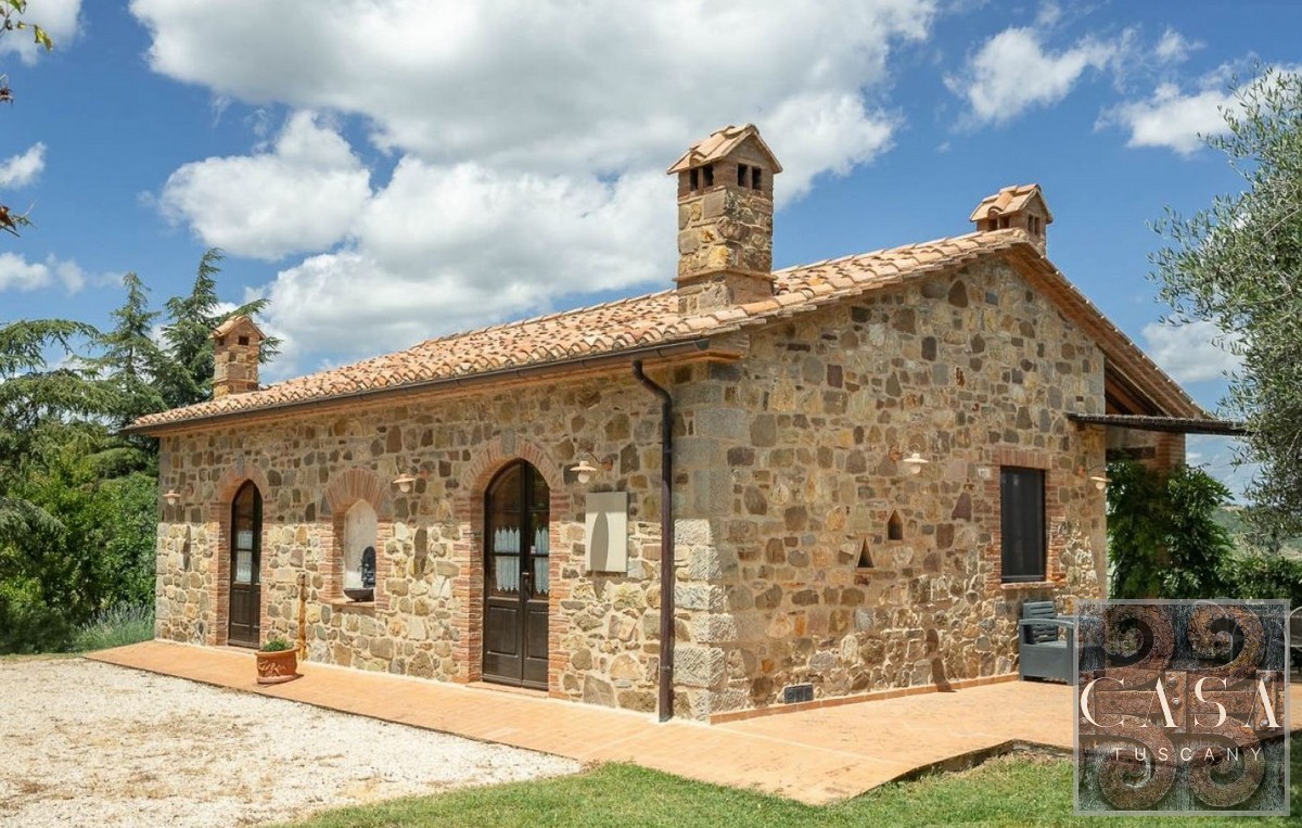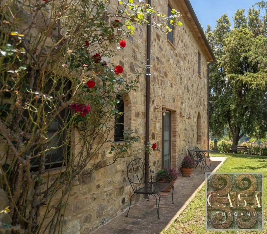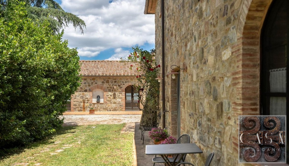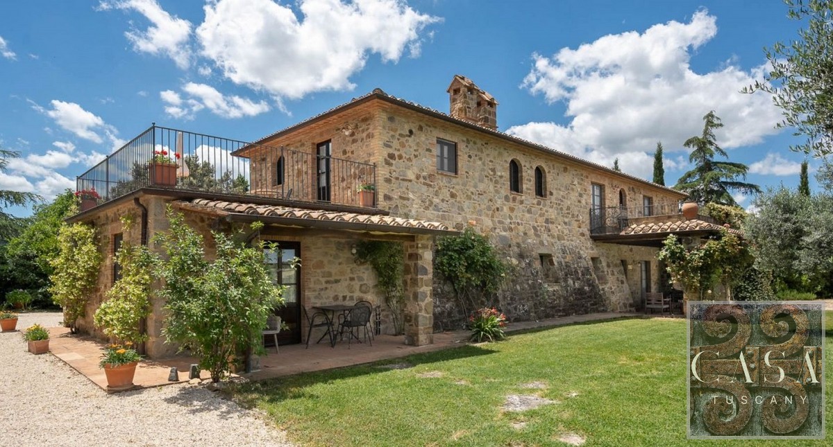 Charming 16th-century stone farmhouse, elegantly restored and currently operating as an agriturismo with 6 apartments and a pool, for sale in Val d’Orcia, Tuscany.
