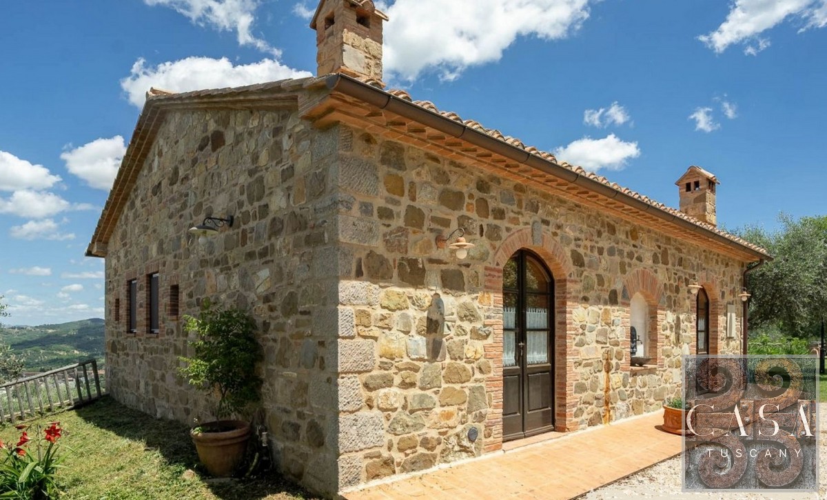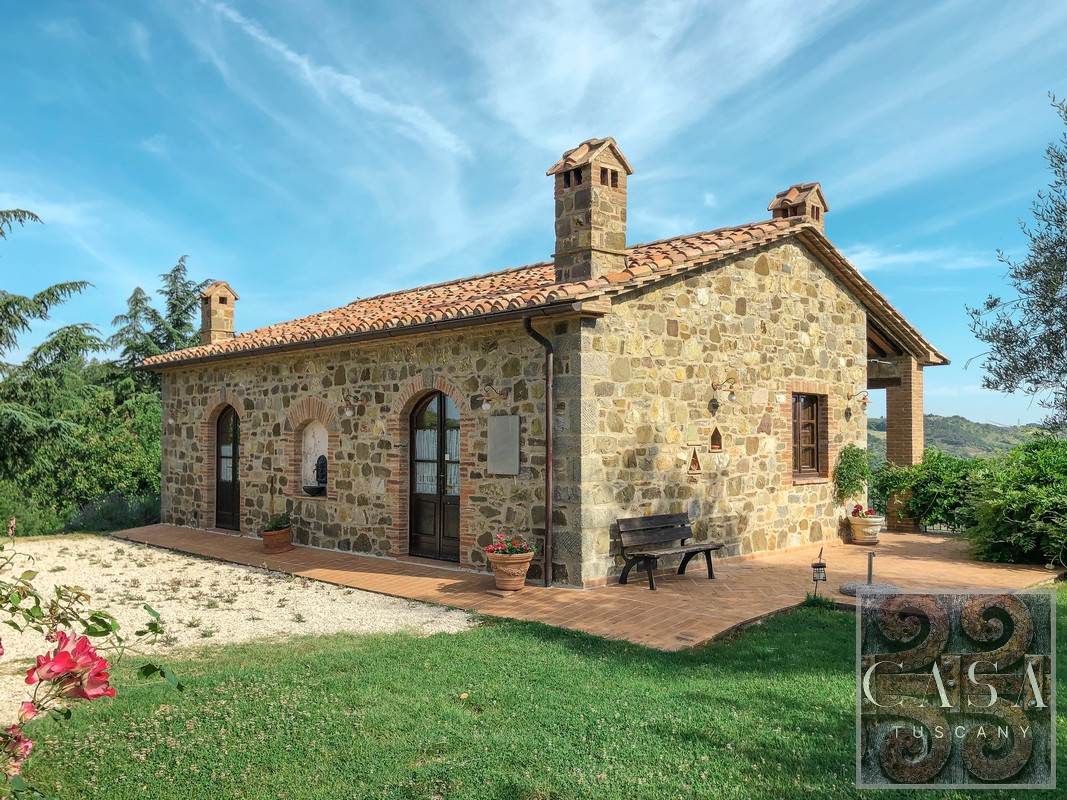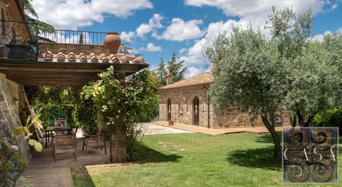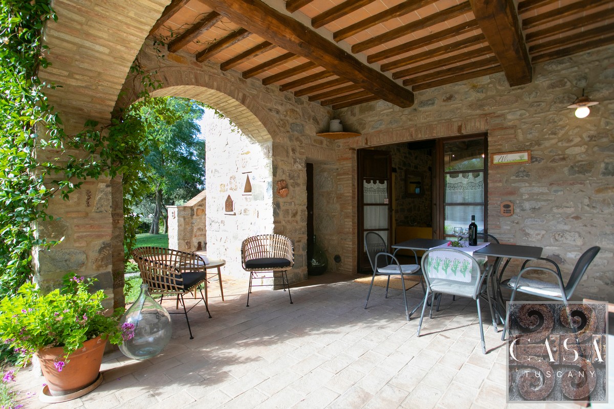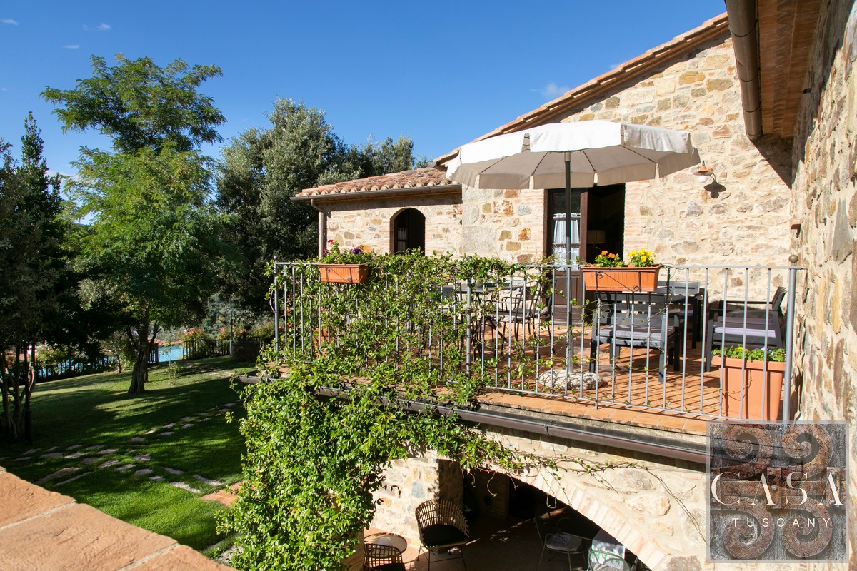 Charming 16th-century stone farmhouse, elegantly restored and currently operating as an agriturismo with 6 apartments and a pool, for sale in Val d’Orcia, Tuscany.