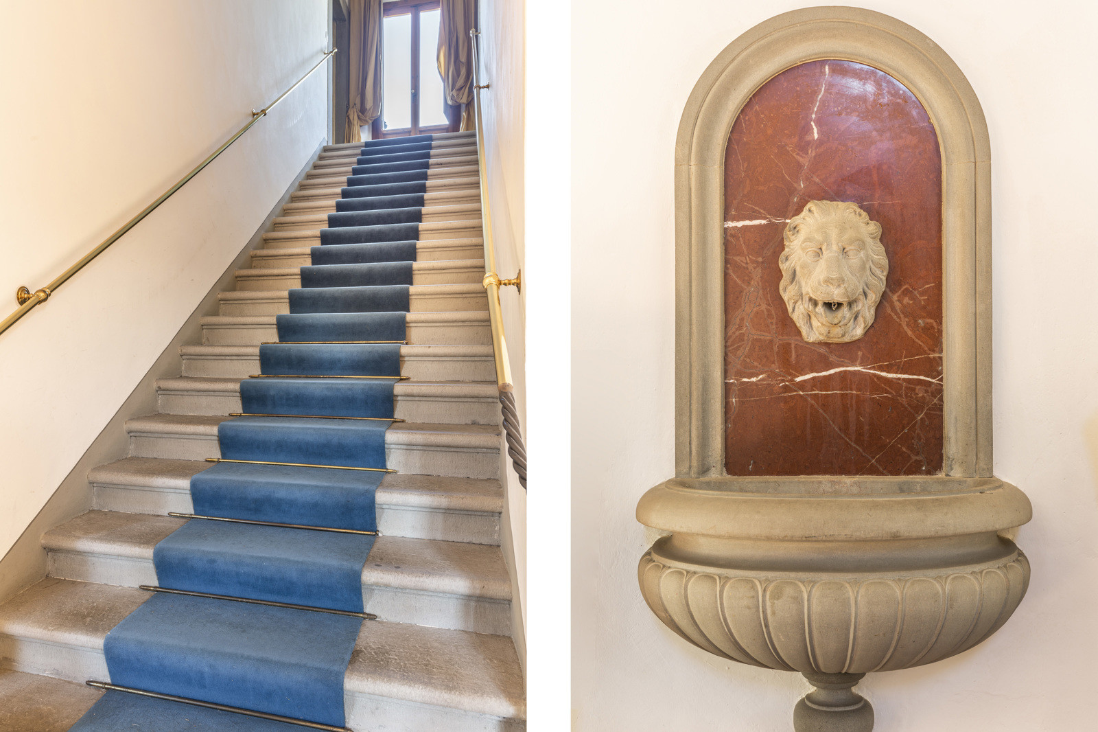With independent access from the terrace the other residential portion could be easily rejoined to the master part in order to recreate a single residence if wished. Three bedrooms and large spaces intended for the living area in addition to the kitchen and study characterize this wing of the historic mansion.