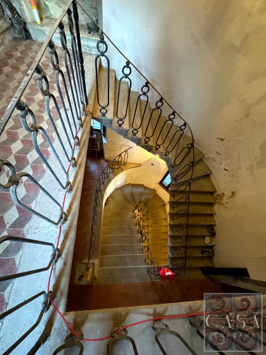 The structure retains many of its original features, including frescoes, historic balconies, stone fireplaces and evocative cellars, all immersed in a large private garden.