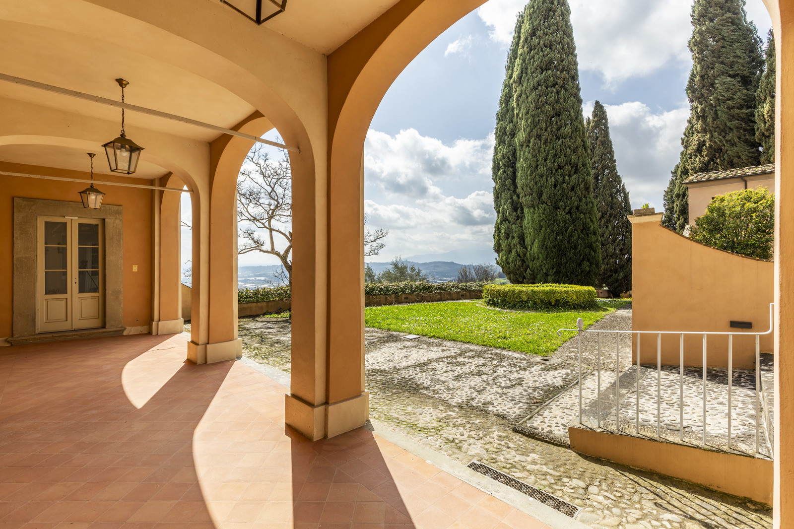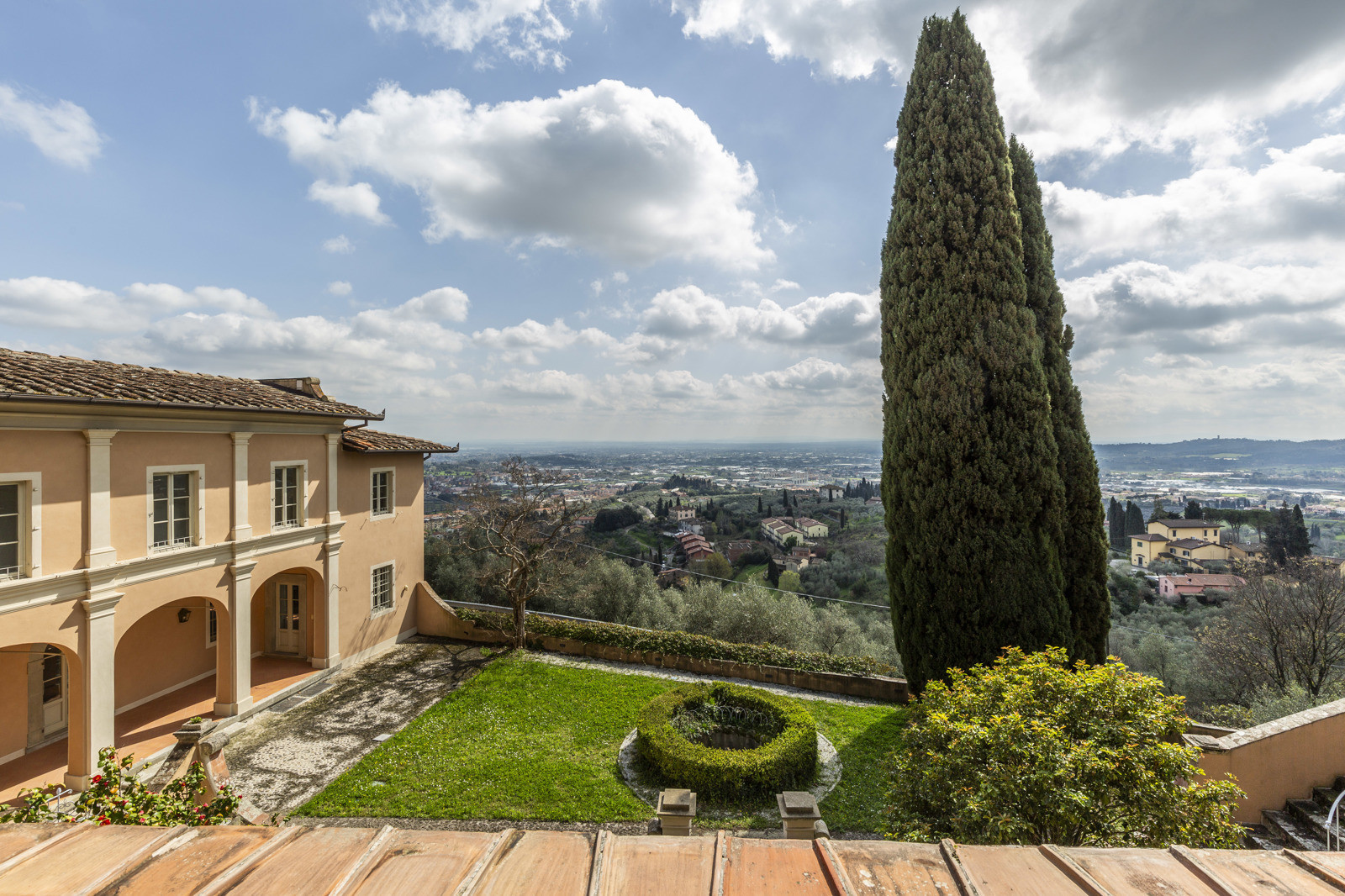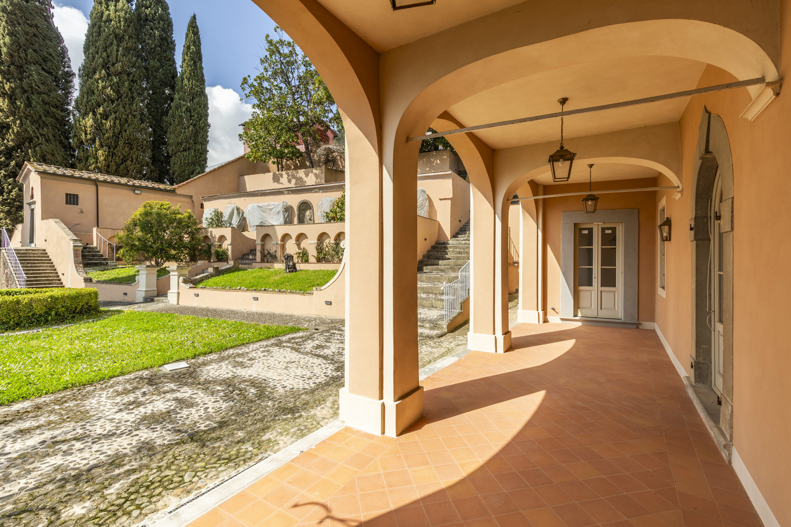In a dominant position, with panoramic views of the plain below, the villa enjoys the well-kept terraced outdoor garden of 2000 square meters with nymphaeum and decorated fountain, the still consecrated private chapel, additional outdoor parking spaces and an additional sloping plot of land where it is possible to build a swimming pool.