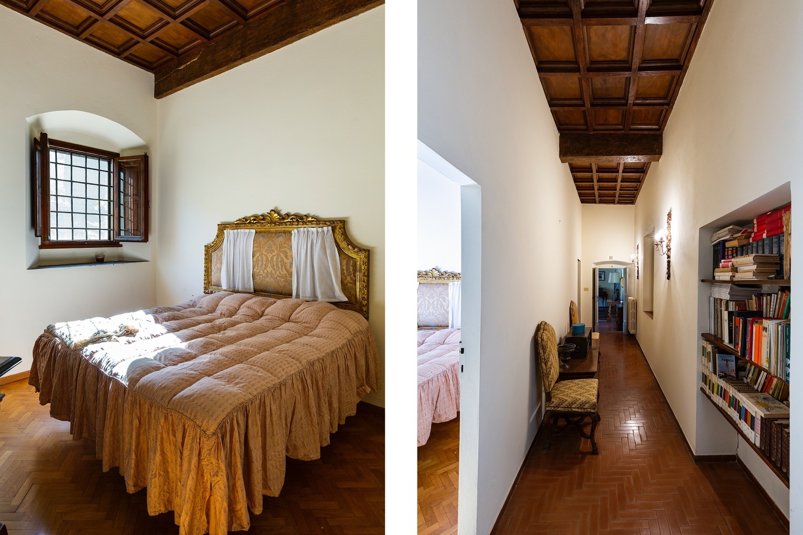 The stone staircase that starts from the courtyard leads to a characteristic covered terrace which through three glass doors allows you to enter this other wing of the villa. A corridor leads on the right to the room with a characteristic fireplace, while on the right the large kitchen with adjoining living room and three bedrooms and two other bathrooms.