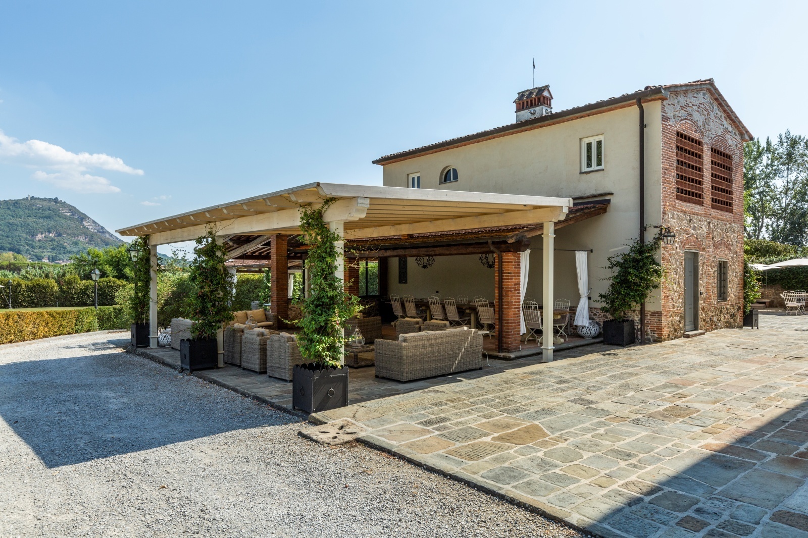 A short distance from the main villa there is the former barn which has been transformed into a residential area for guests. The large heights also characterise this part where a large living and sleeping area has been created.