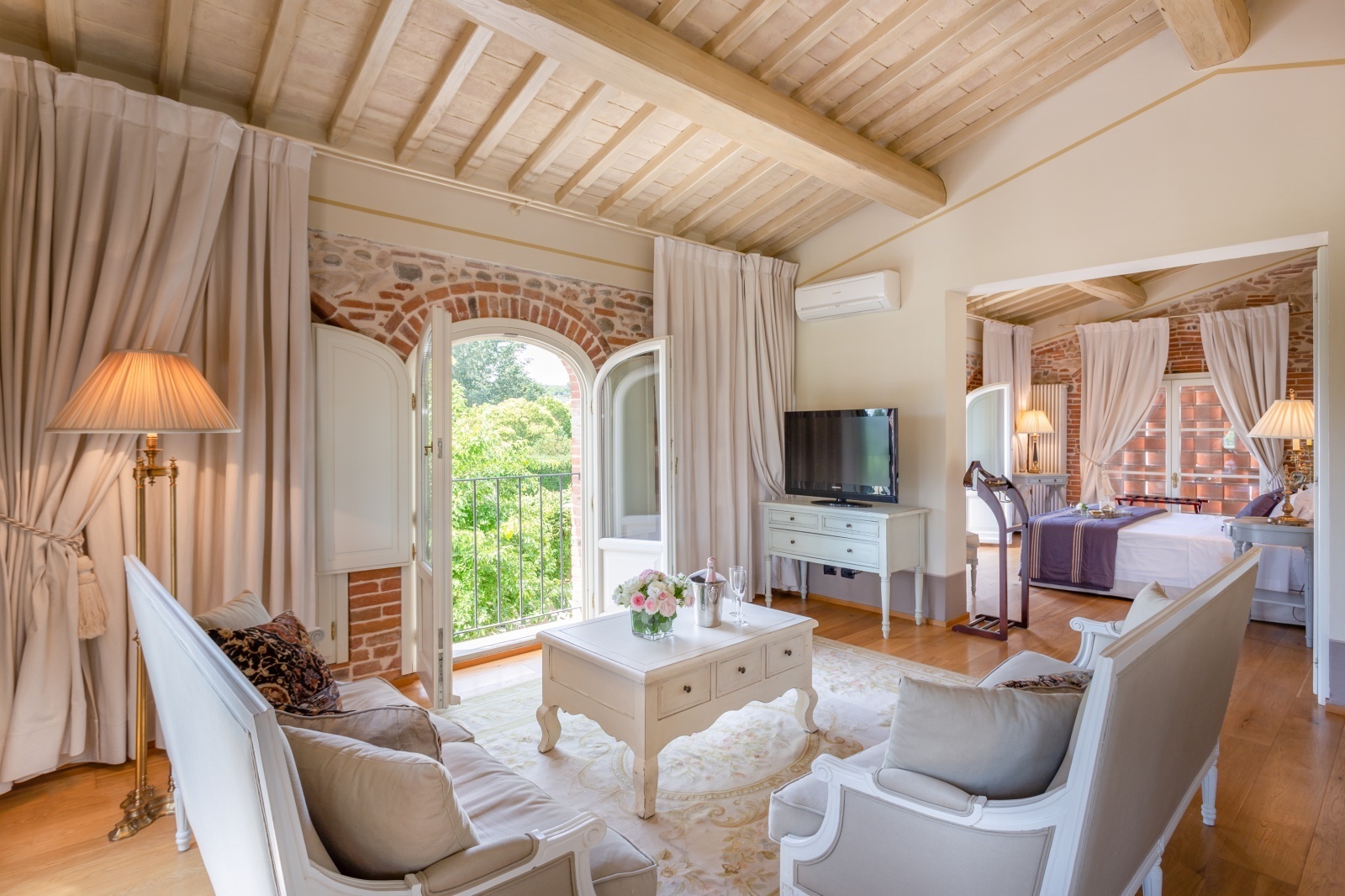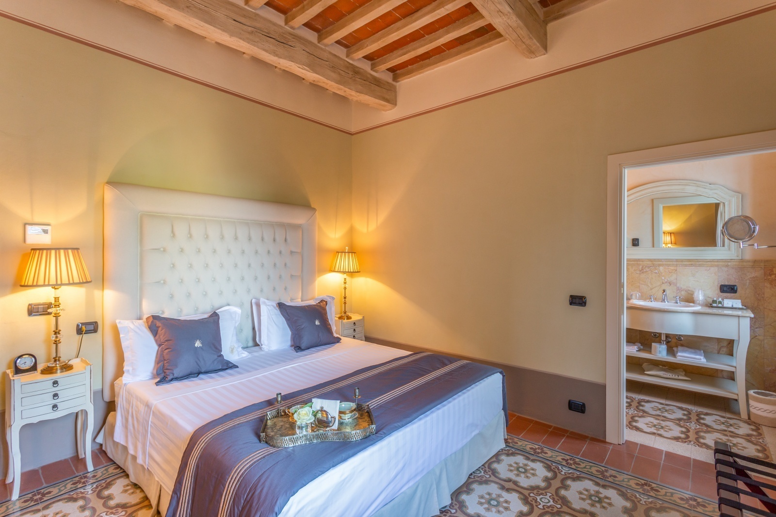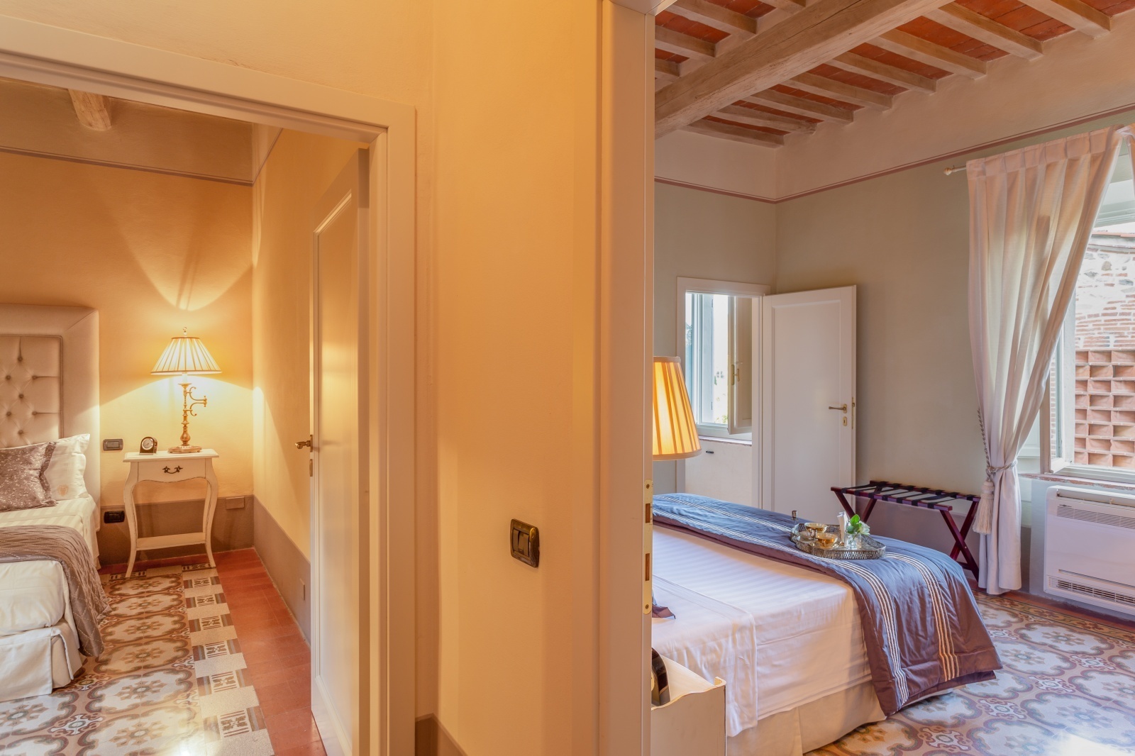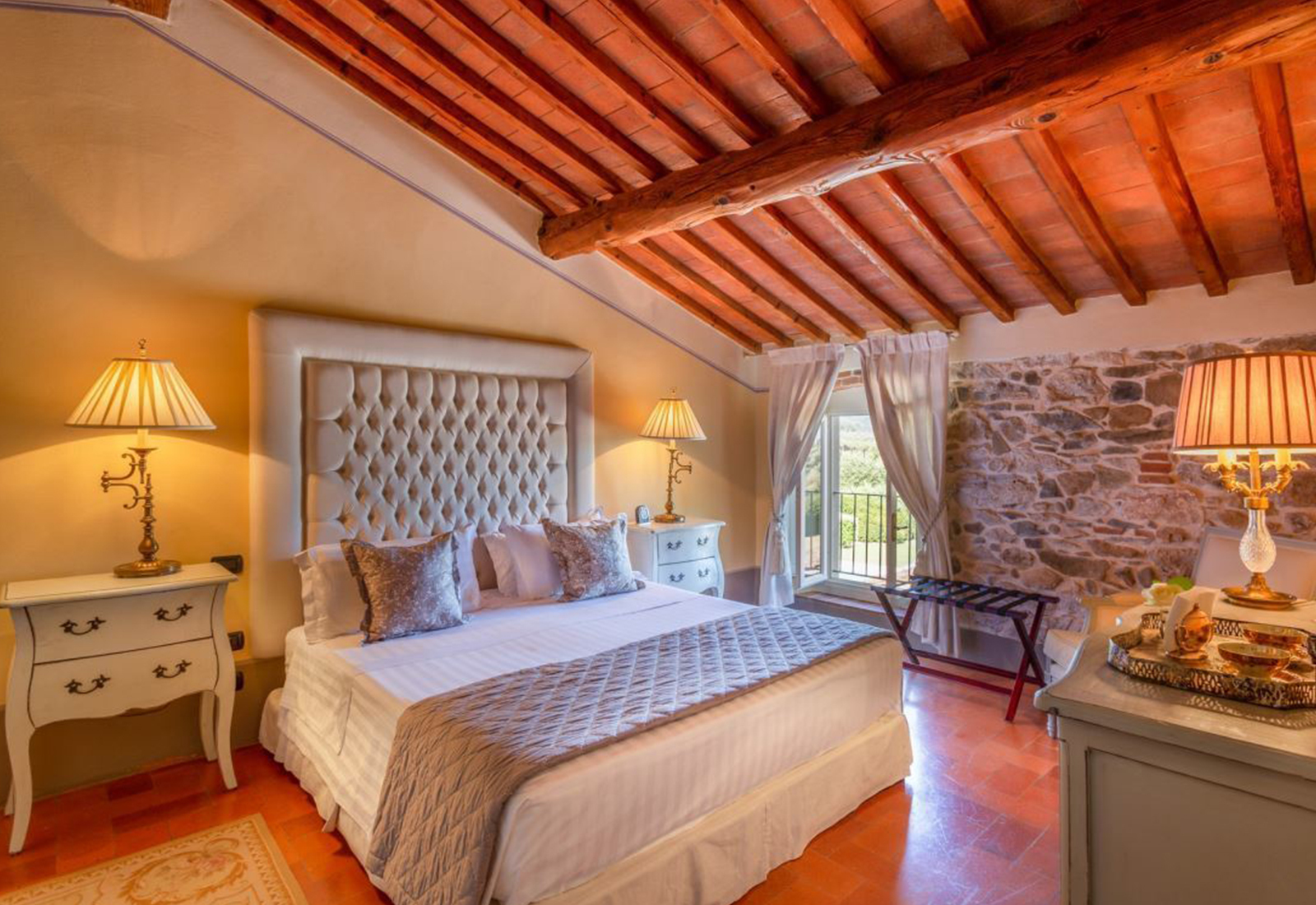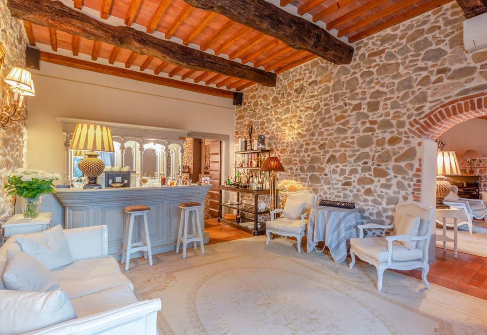 The elegance of this property is the measured luxury of a welcoming and warm historic residence. In the rooms, small details tell the story of this residence in harmony with past and present. Warm wood is the flooring, and the exposed beams and the ancient fireplaces evoke magical atmospheres. The ancient terracotta floors for the living area, the marble and the natural lime workmanship, blend perfectly with modern services and comforts. The outside is perfectly plastered but native stone has also been used internally and externally.