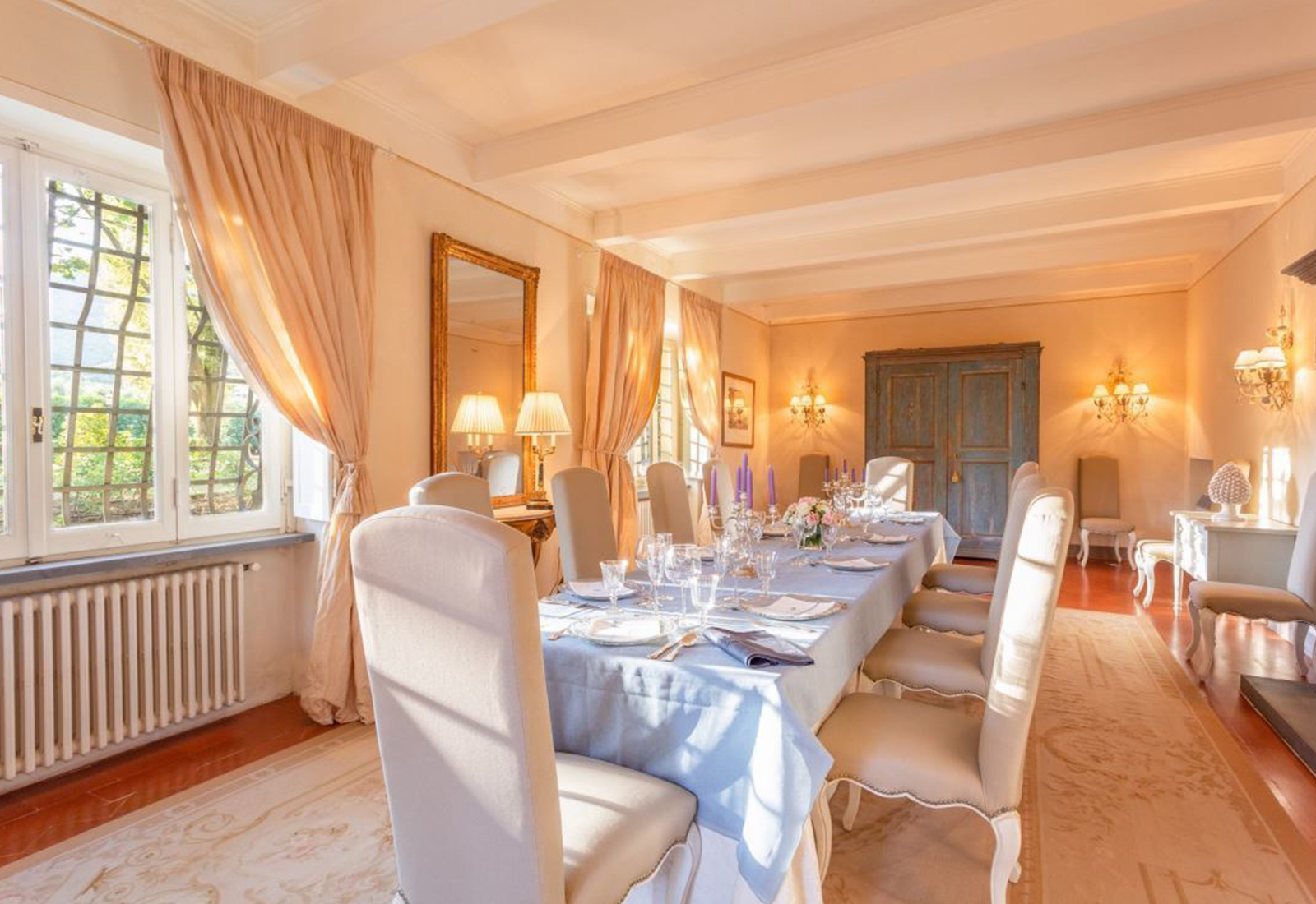The ground floor is a succession of large and bright halls with high ceilings, the well-equipped kitchen is able to comfortably accommodate the whole family, a study area and a bar complete this part of the historic home.