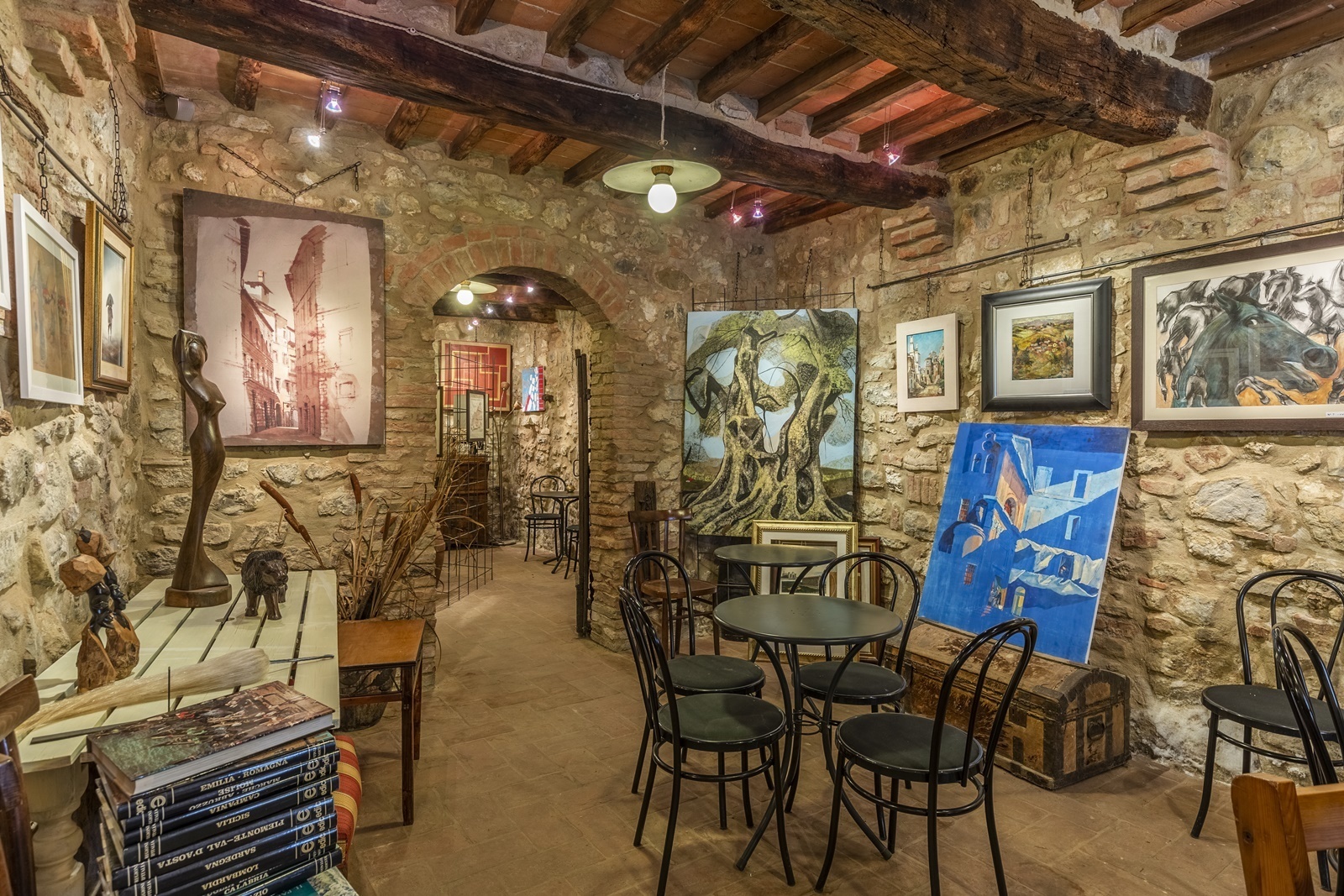 The property is divided into three floors; on the street level we find a wooden door that leads us to two large cellars, one of which is currently used as an exhibition of paintings and photos.