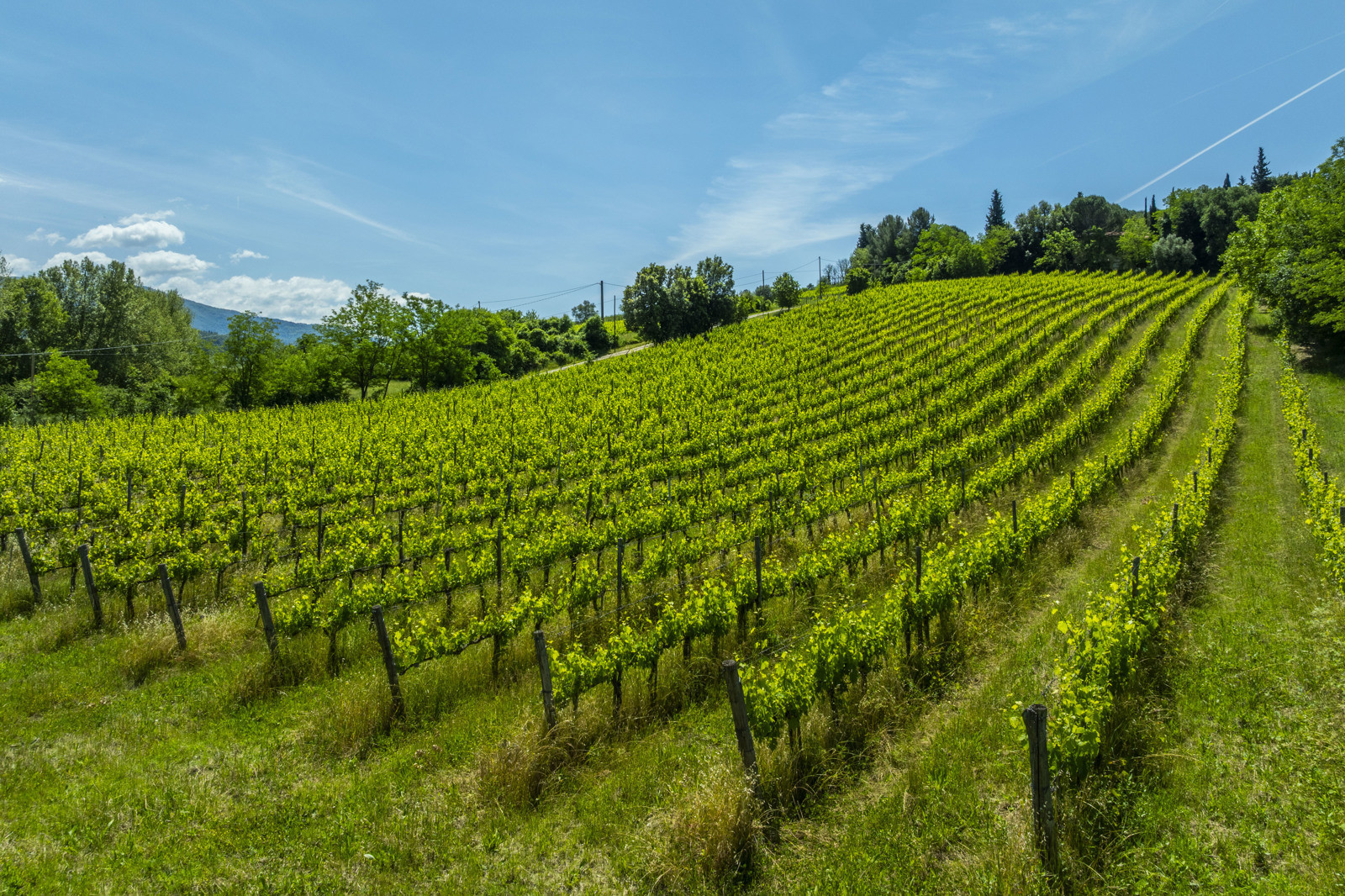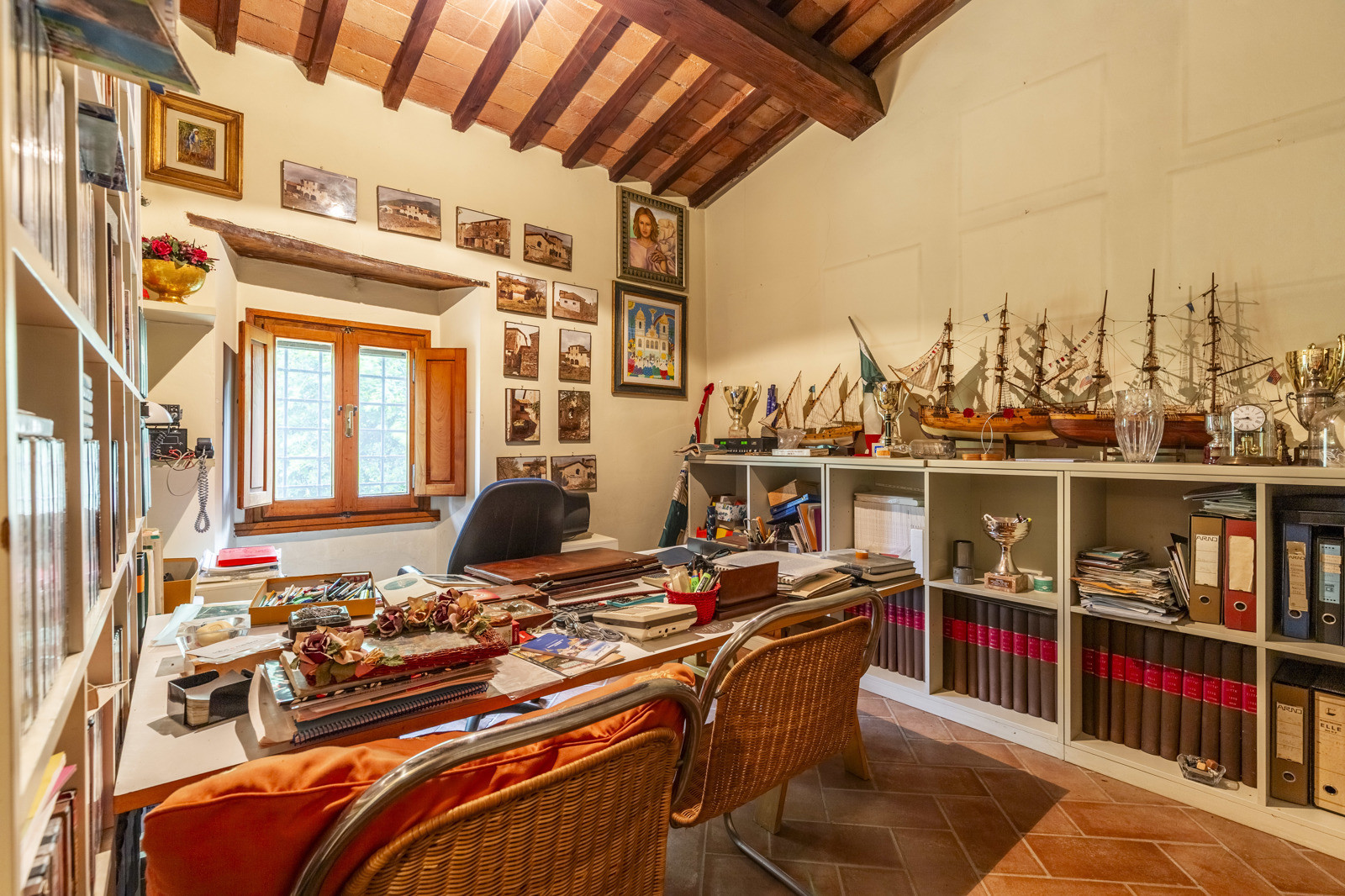 57 hectares of land surround the buildings and are divided as follows: 10 hectares of olive grove with 1,100 trees, 7.2 hectares of vineyards that produce Chianti dei Colli Fiorentini, 4 hectares of woodland, with the remaining hectares arable land.