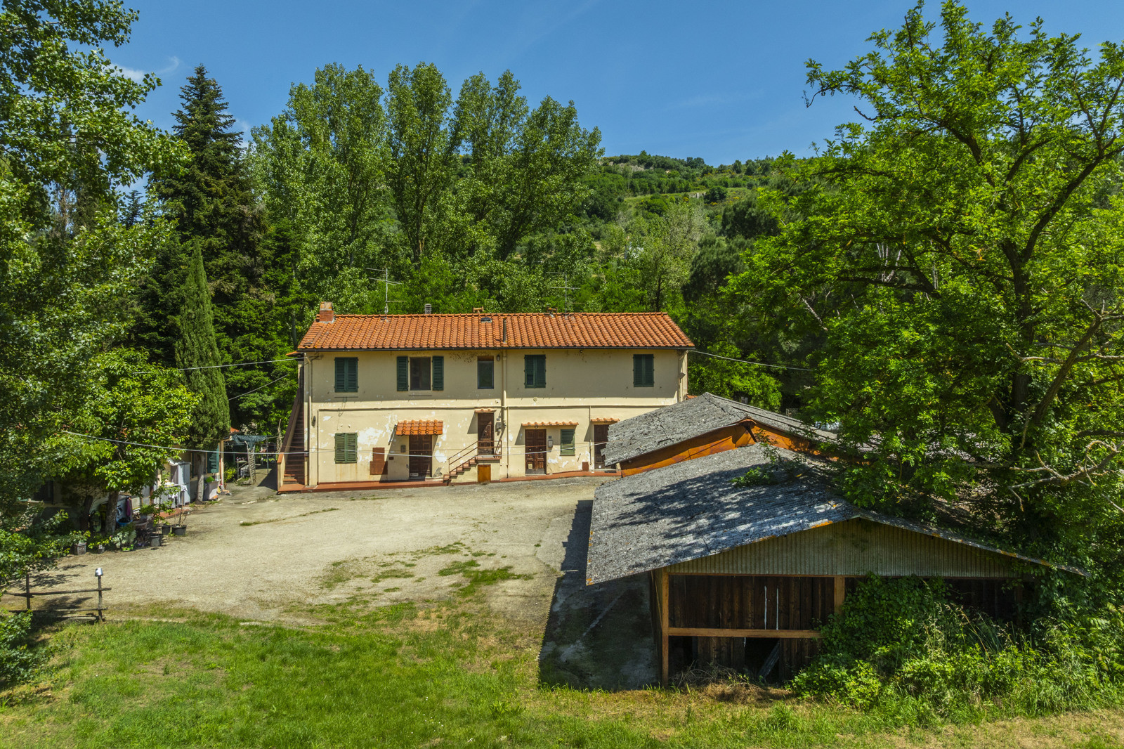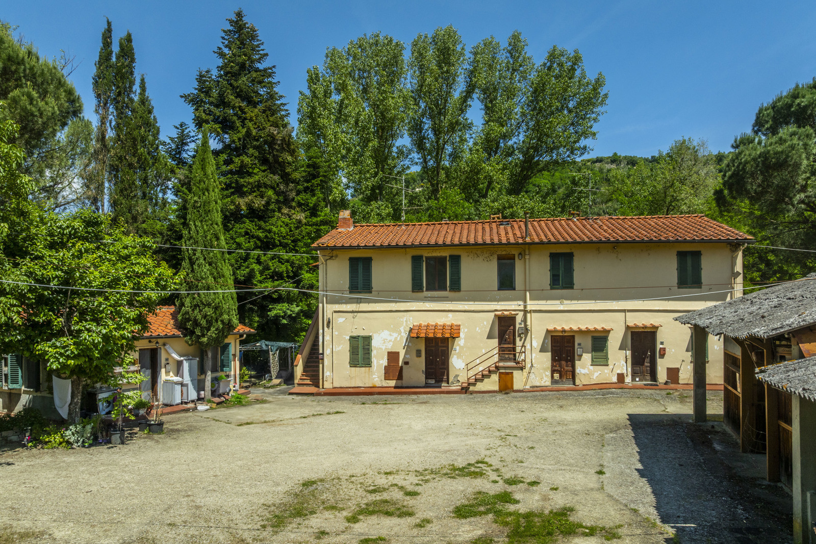 The riding school is located in the flat part of the grounds, close to the bank of the Arno River, which is accessed directly from the property, almost as if it were a private beach, while to the side are the stables for the horses, still in good condition.