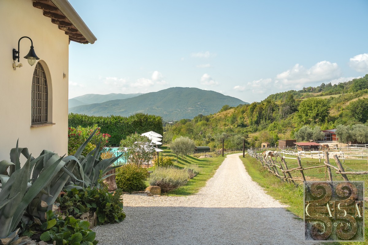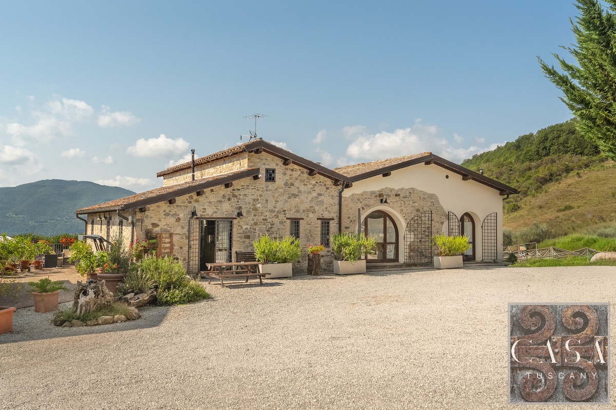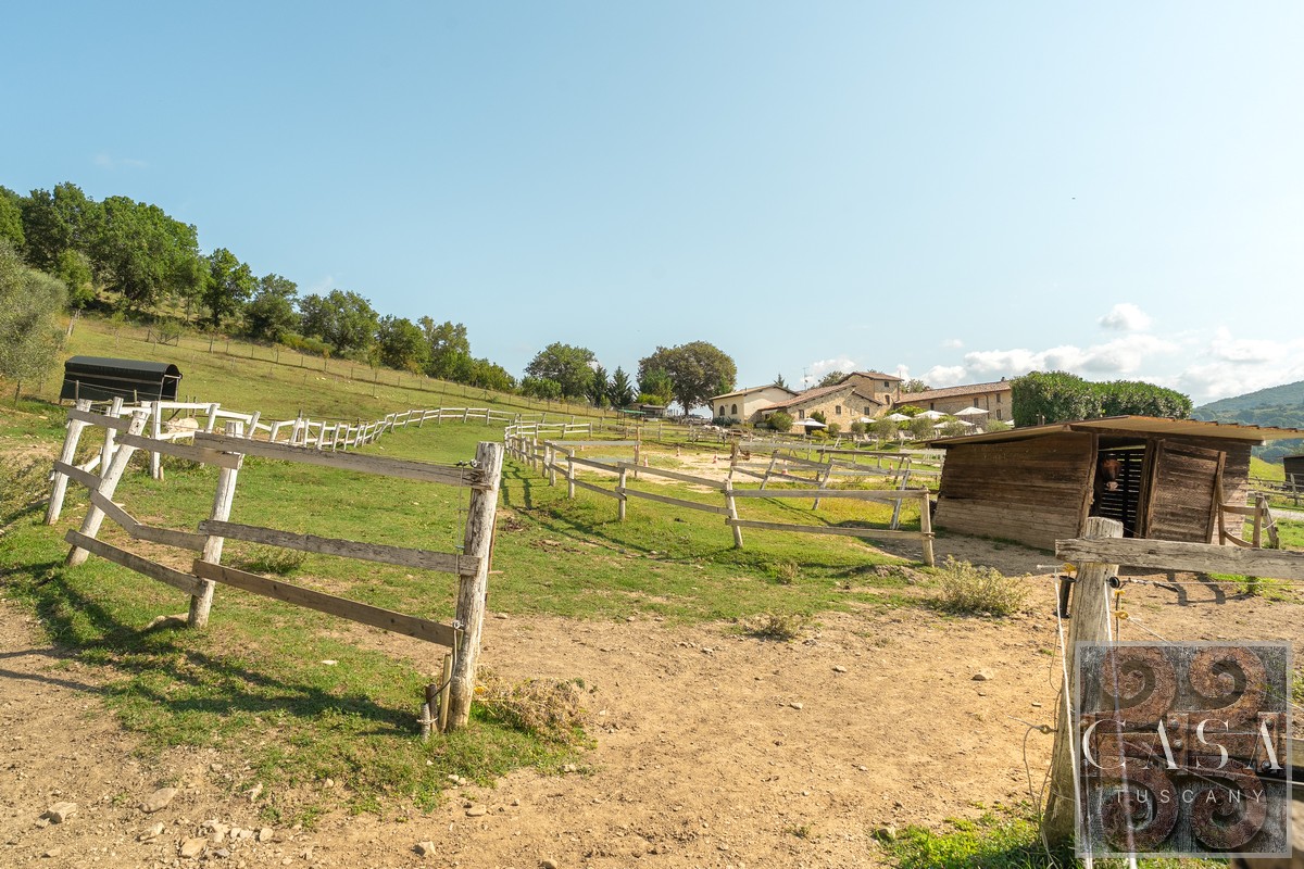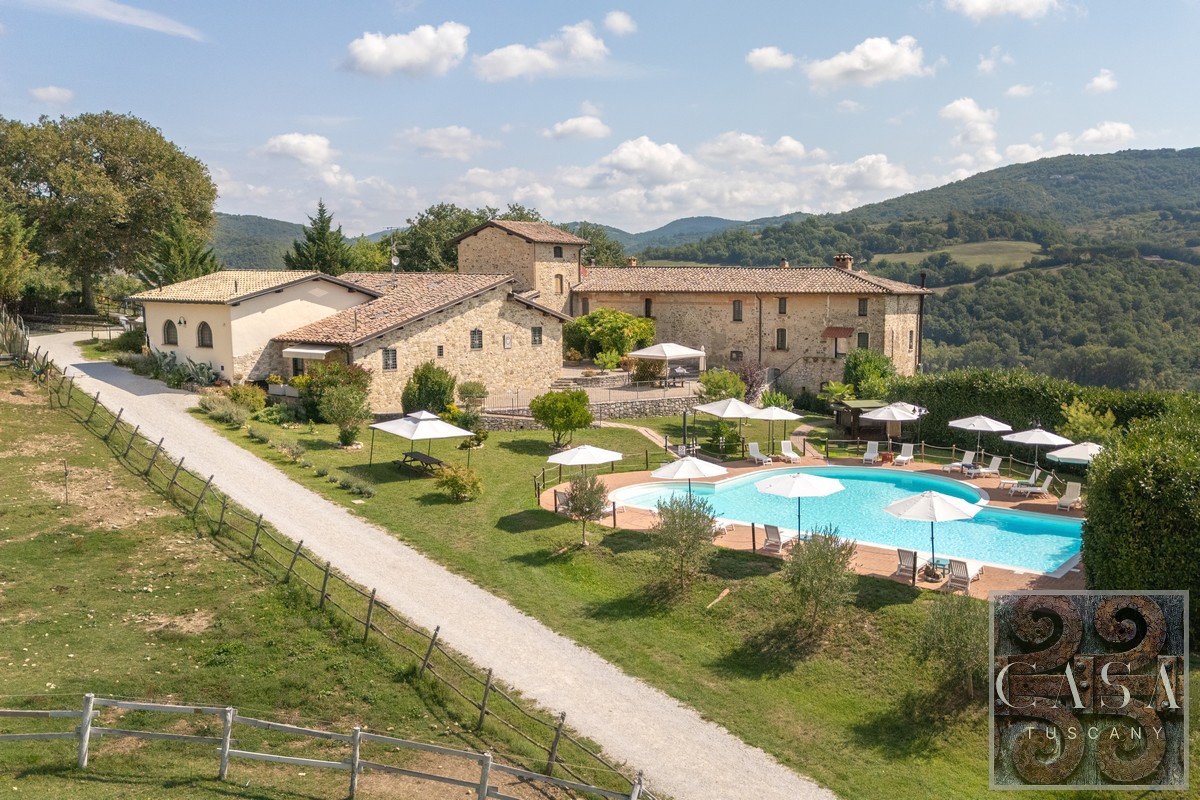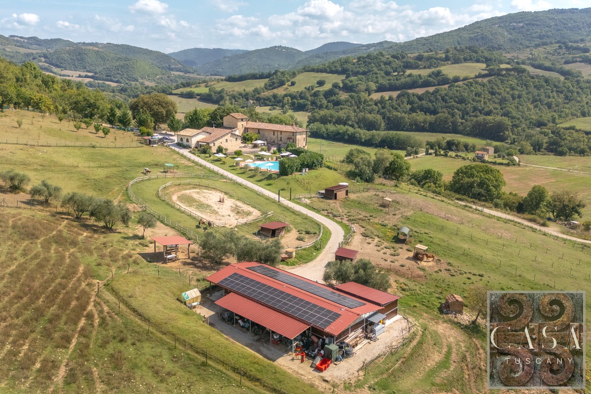 19th-century estate with stone farmhouse, guesthouse, swimming pool, land with olive grove, 6 horse stables, in Umbria, just minutes from the historic town of Umbertide.