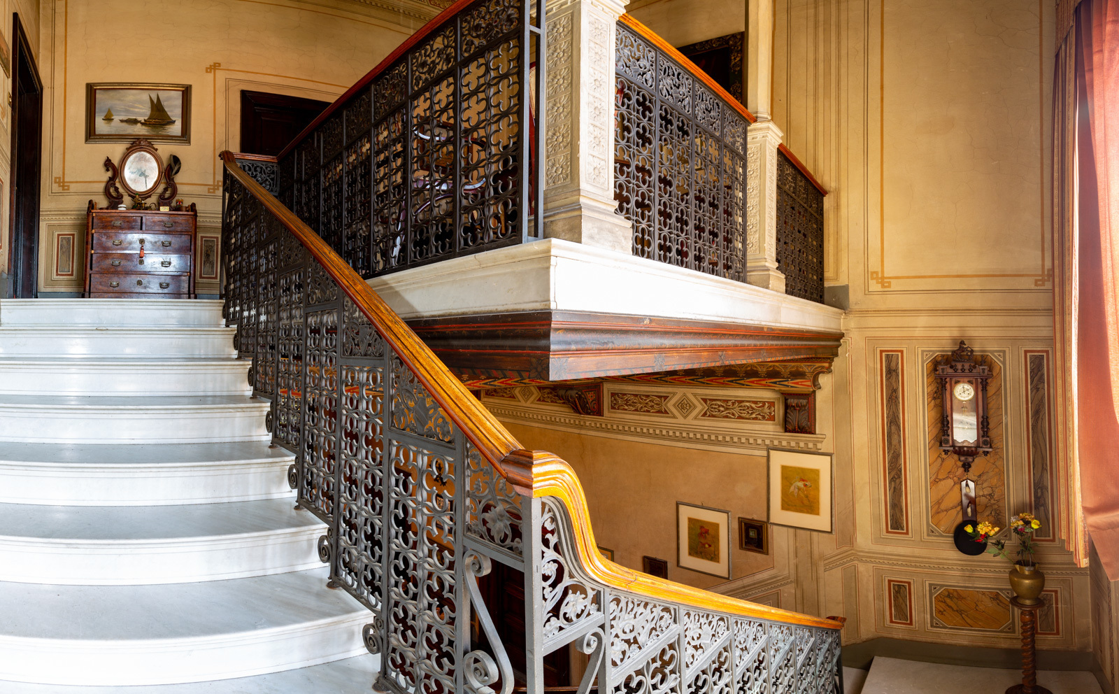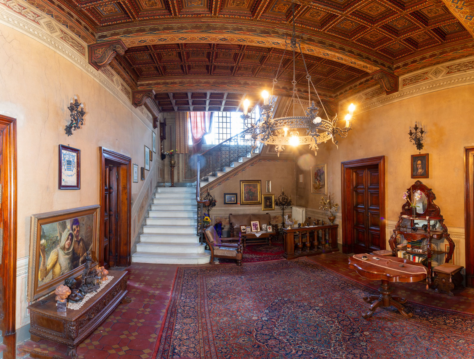 A stone staircase delimited by stone balustrades leads into the house that welcomes us with a huge entrance hall with a beautiful marble staircase at the bottom that leads up to first floor.