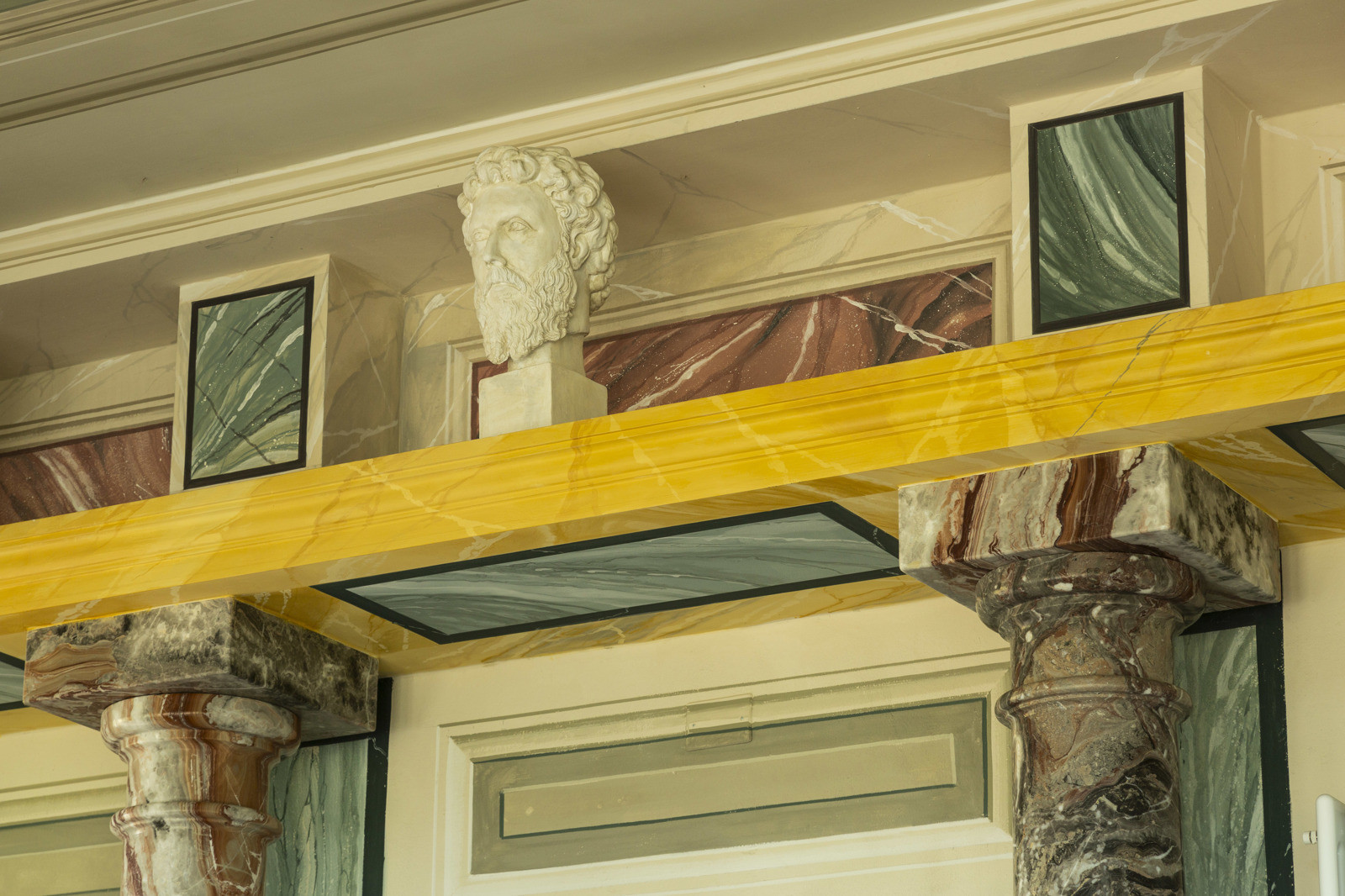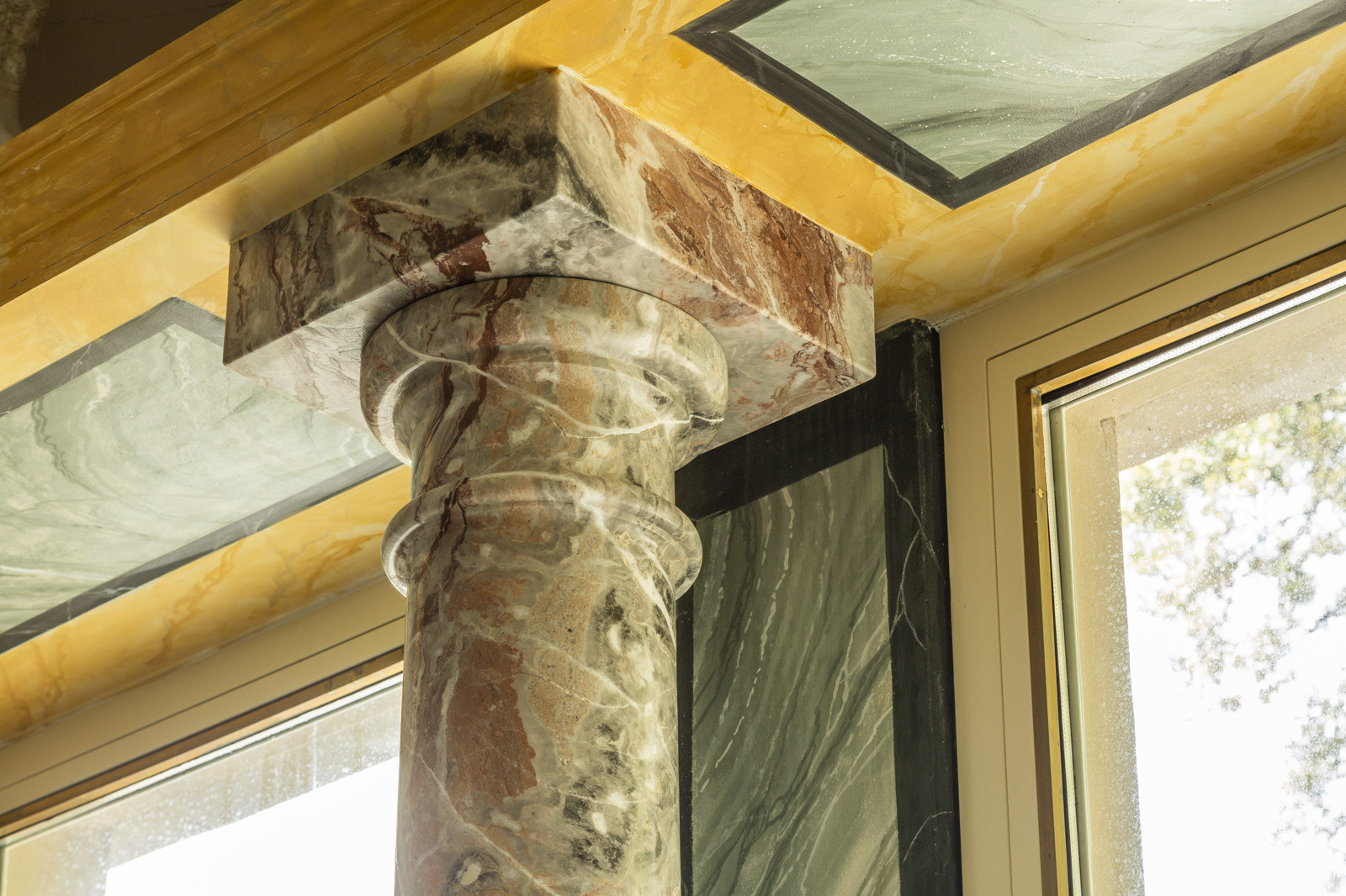 There are three living rooms on the ground floor in addition to a large kitchen, study and a bathroom. Particularly beautiful and of about 90 square meters is the hall with columns characterized by high and imposing windows with an incredible view.