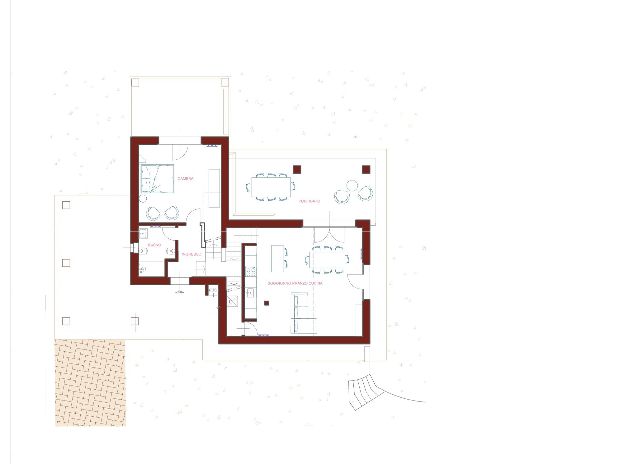 On the ground floor, a spacious living area with a custom-made travertine kitchen with island (which cost approximately €35,000, included in the price), a double bedroom, and a bathroom welcome you. There is a covered porch of about 24 sqm.